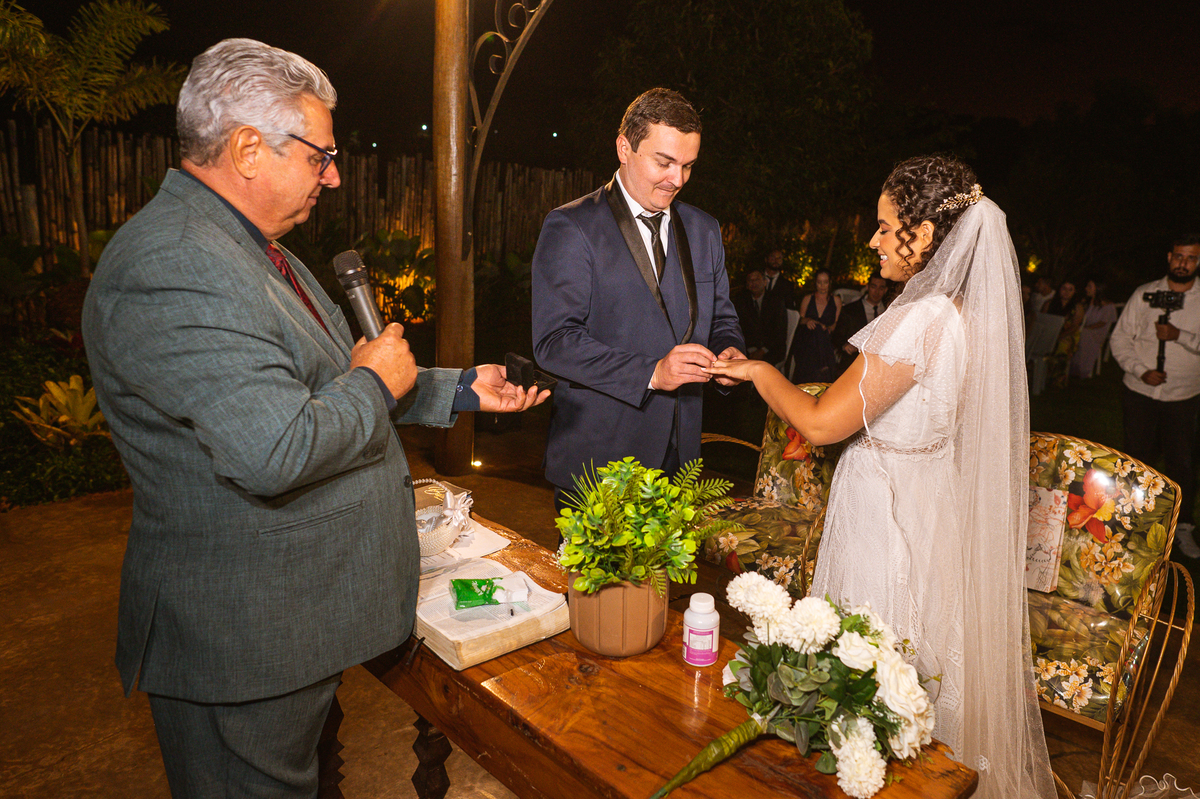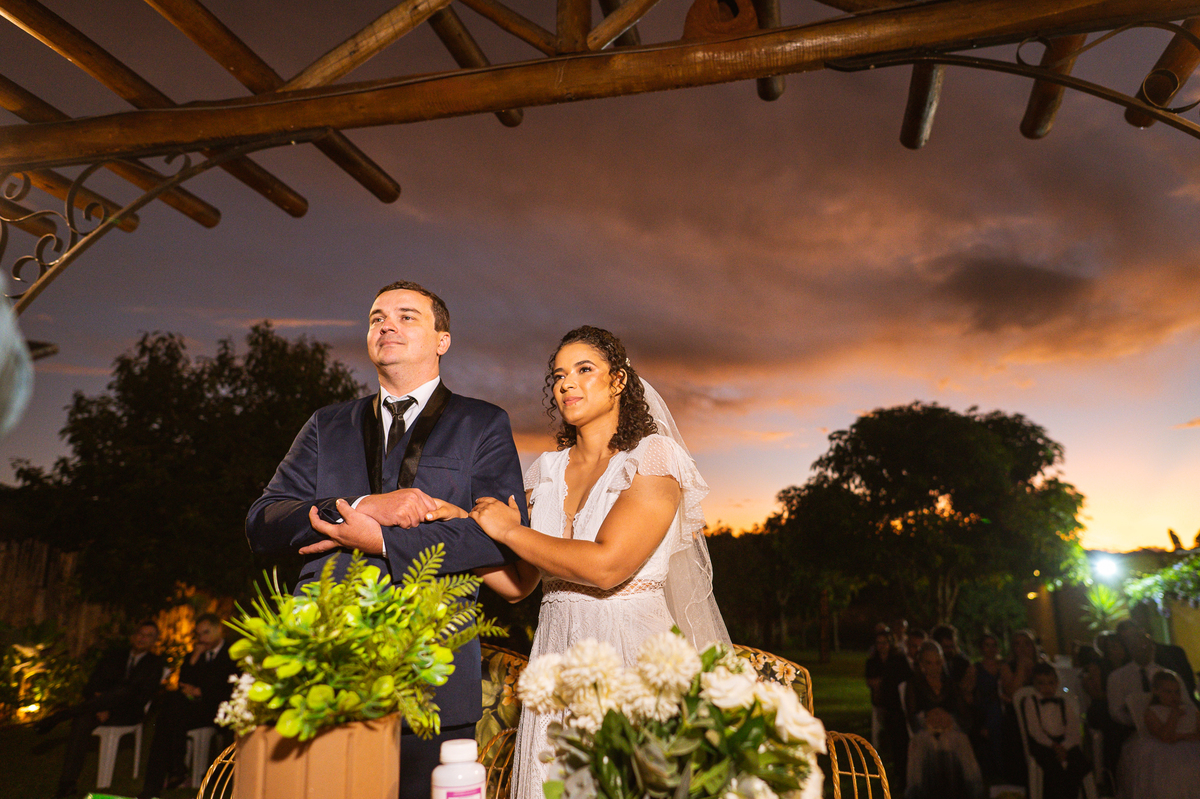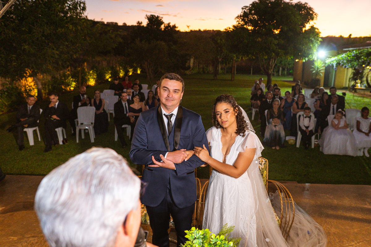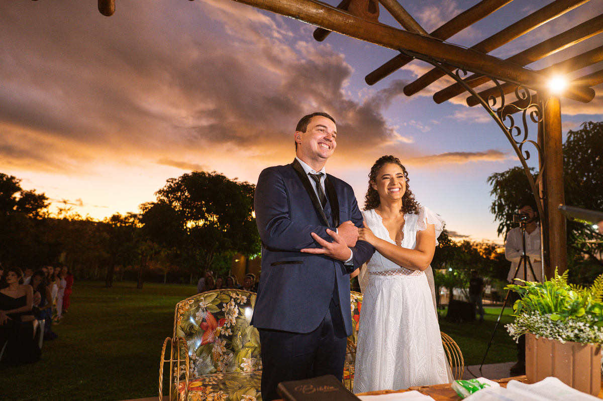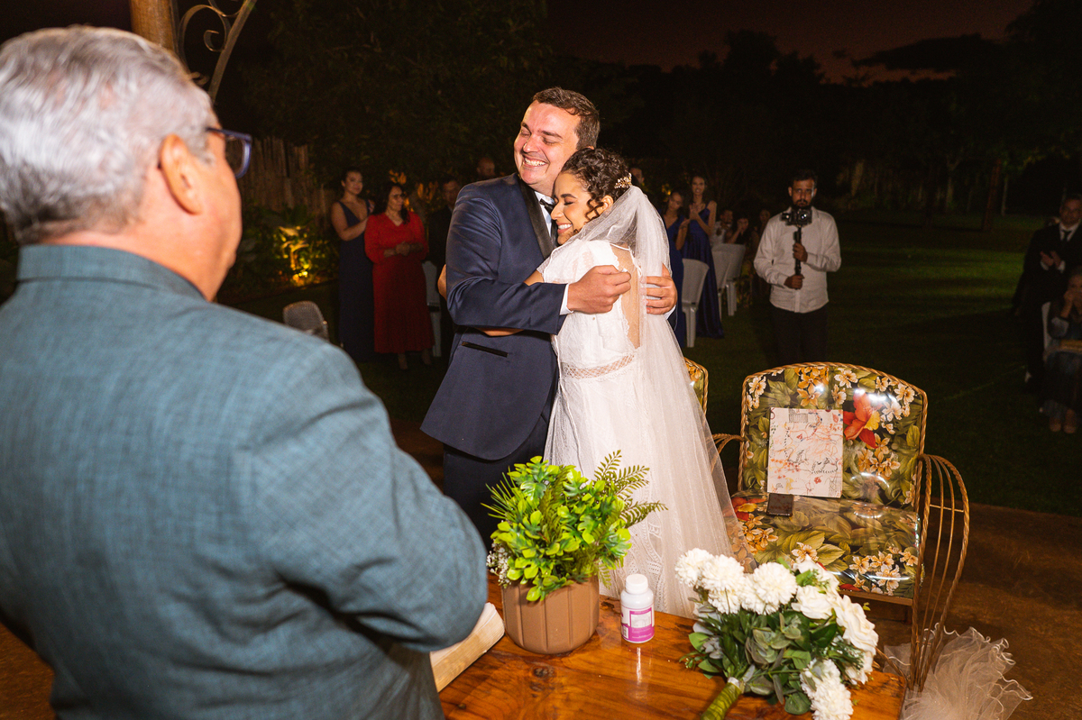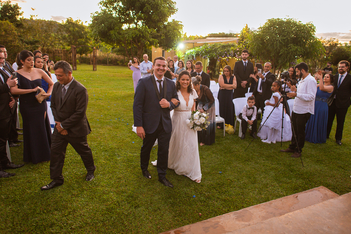 Eles despediram-se uns dos outros e agora juntos caminharam para o altar. Foram recepcionados pelo pastor celebrante que fez questão de tirar uma foto dos noivos antes de iniciar sua palavra. Toda a celebração foi emocionante do início ao final. O pastou preparou uma liturgia impecável, que uniu o trabalho dos noivos com a bíblia e o casamento. Foi incrível e muito especial. Ao final, os noivos fizeram seus votos super emocionantes, Holmes novamente surpreendeu sua noiva com uma música especial para presenteá-la na celebração. Os dois foram abençoados e declarados casados perante a lei dos homens e de Deus. Fizemos as fotografias de praxe e já preparamos a saída.