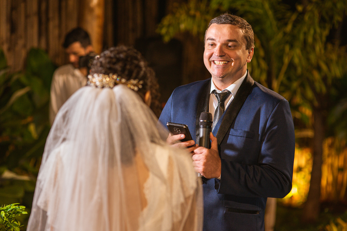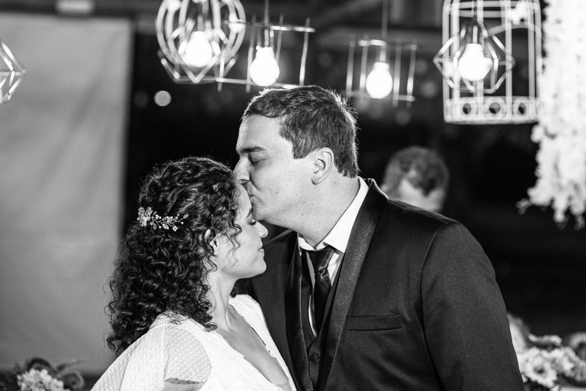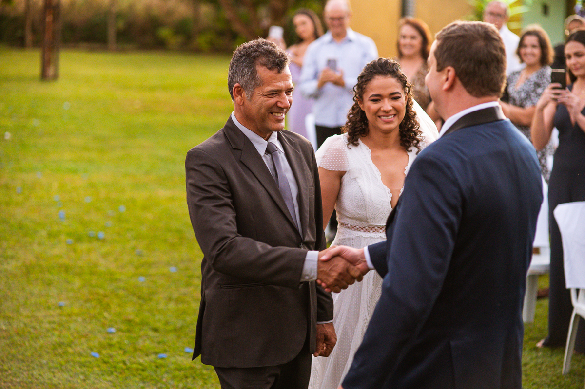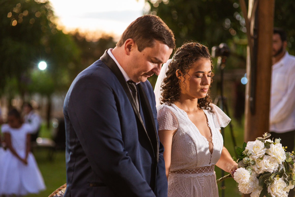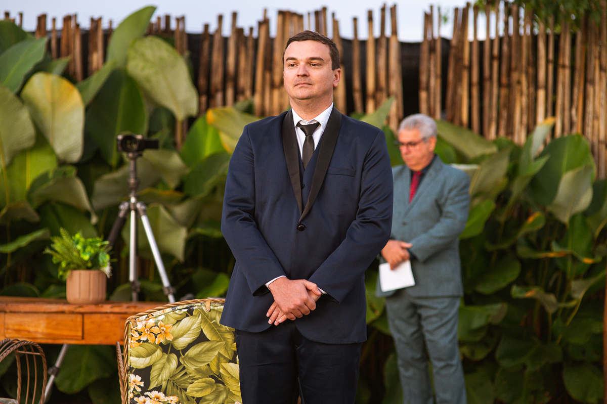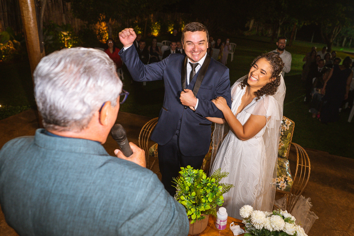 Eles despediram-se uns dos outros e agora juntos caminharam para o altar. Foram recepcionados pelo pastor celebrante que fez questão de tirar uma foto dos noivos antes de iniciar sua palavra. Toda a celebração foi emocionante do início ao final. O pastou preparou uma liturgia impecável, que uniu o trabalho dos noivos com a bíblia e o casamento. Foi incrível e muito especial. Ao final, os noivos fizeram seus votos super emocionantes, Holmes novamente surpreendeu sua noiva com uma música especial para presenteá-la na celebração. Os dois foram abençoados e declarados casados perante a lei dos homens e de Deus. Fizemos as fotografias de praxe e já preparamos a saída.