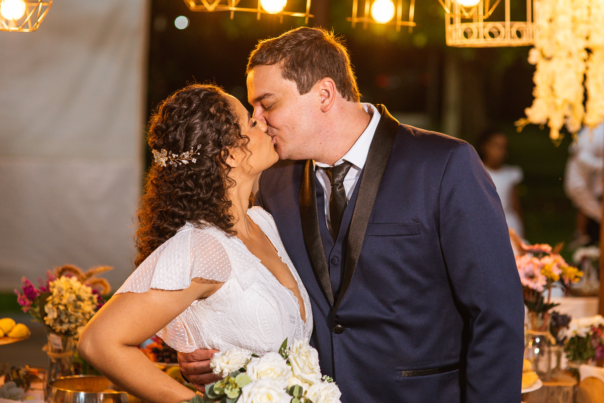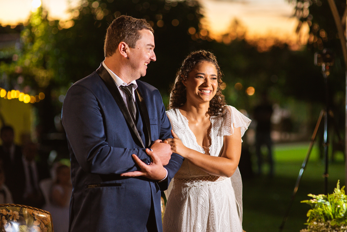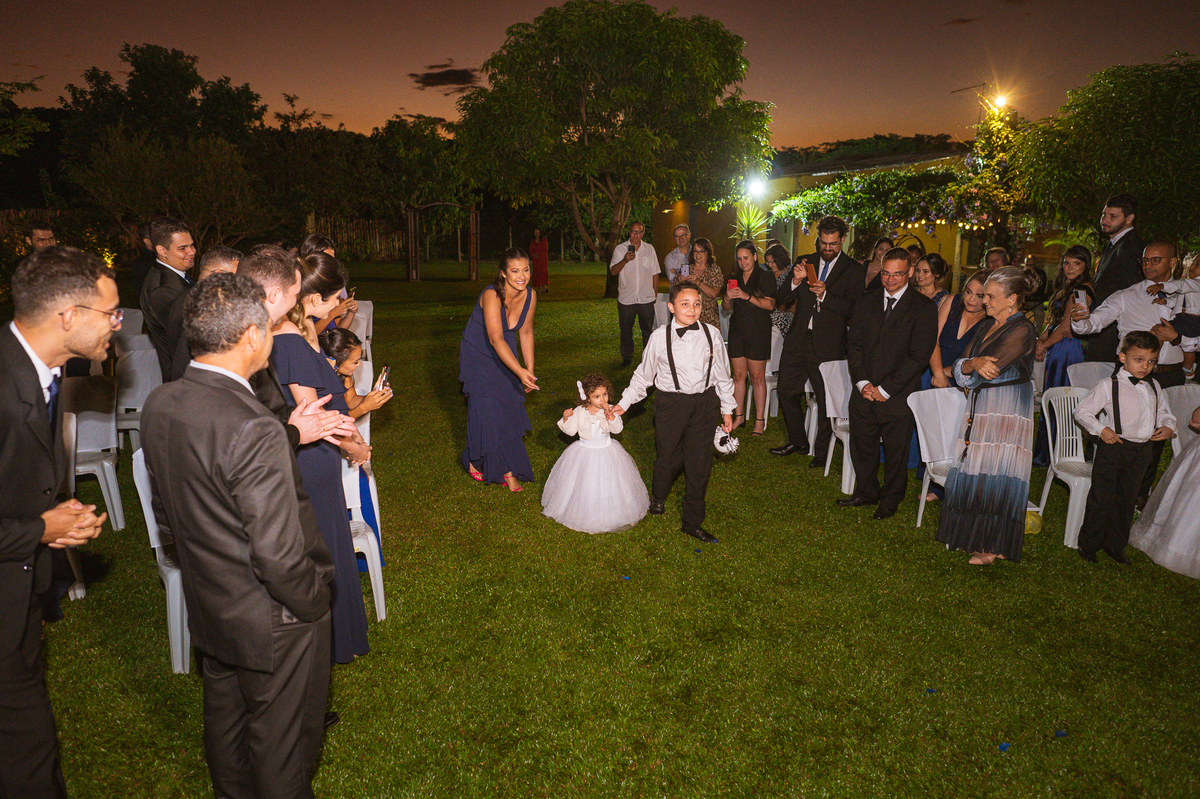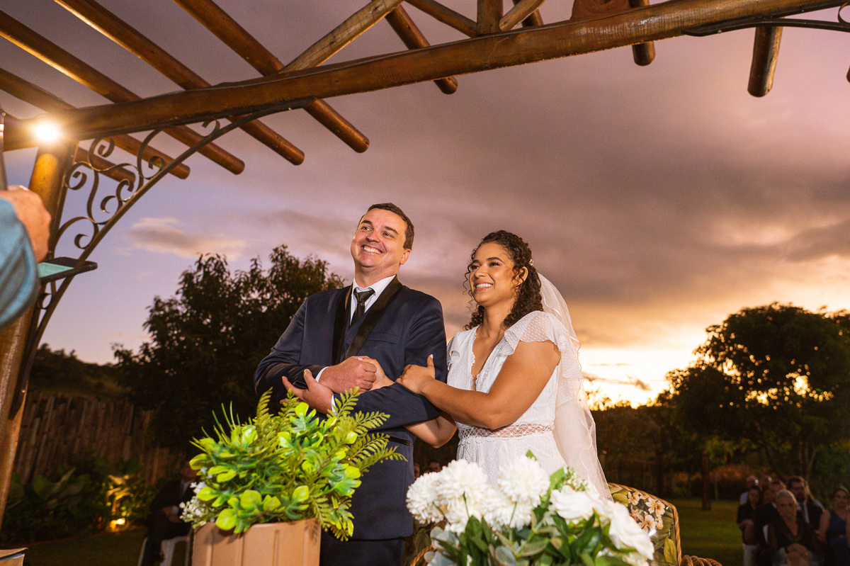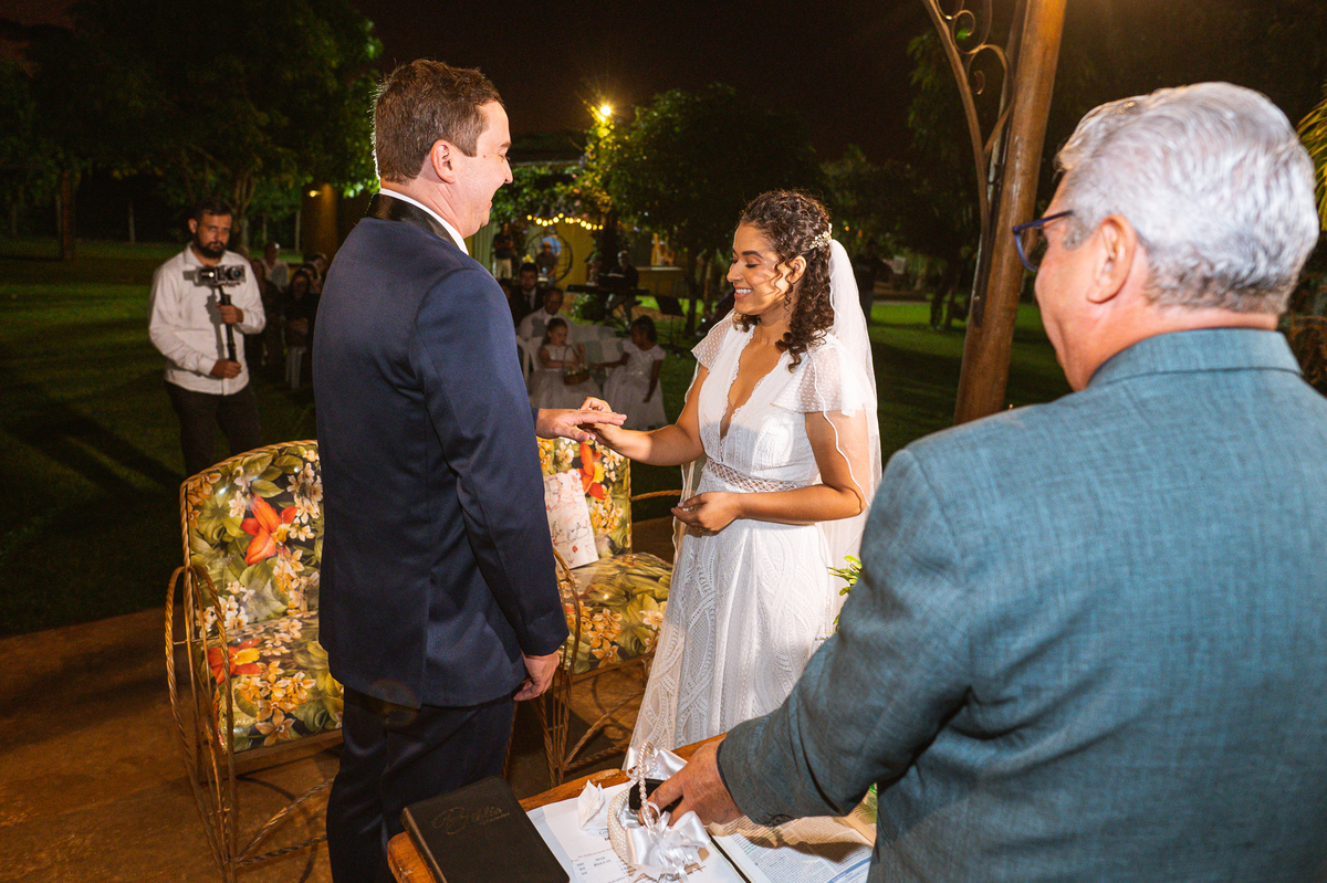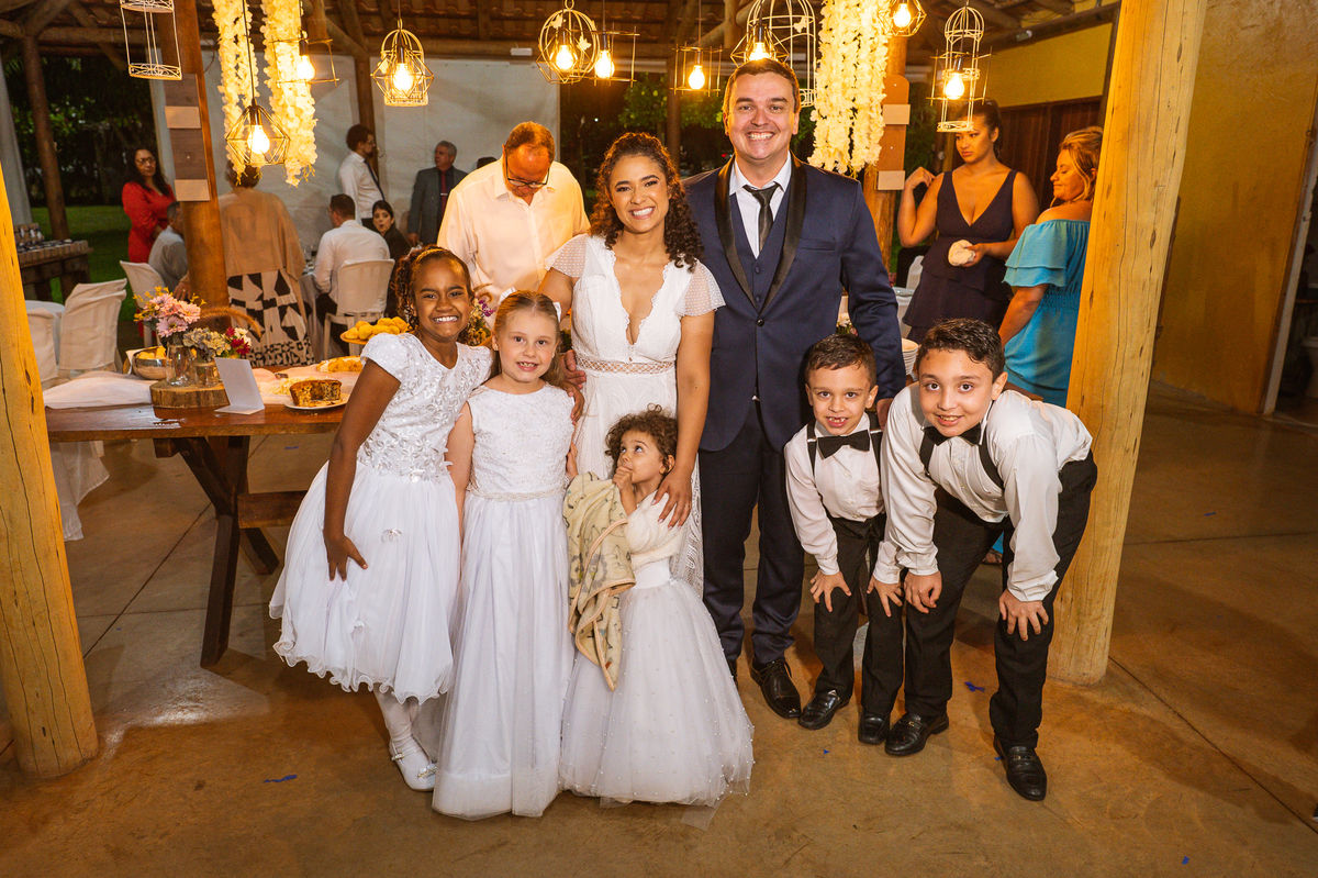 Eles despediram-se uns dos outros e agora juntos caminharam para o altar. Foram recepcionados pelo pastor celebrante que fez questão de tirar uma foto dos noivos antes de iniciar sua palavra. Toda a celebração foi emocionante do início ao final. O pastou preparou uma liturgia impecável, que uniu o trabalho dos noivos com a bíblia e o casamento. Foi incrível e muito especial. Ao final, os noivos fizeram seus votos super emocionantes, Holmes novamente surpreendeu sua noiva com uma música especial para presenteá-la na celebração. Os dois foram abençoados e declarados casados perante a lei dos homens e de Deus. Fizemos as fotografias de praxe e já preparamos a saída.