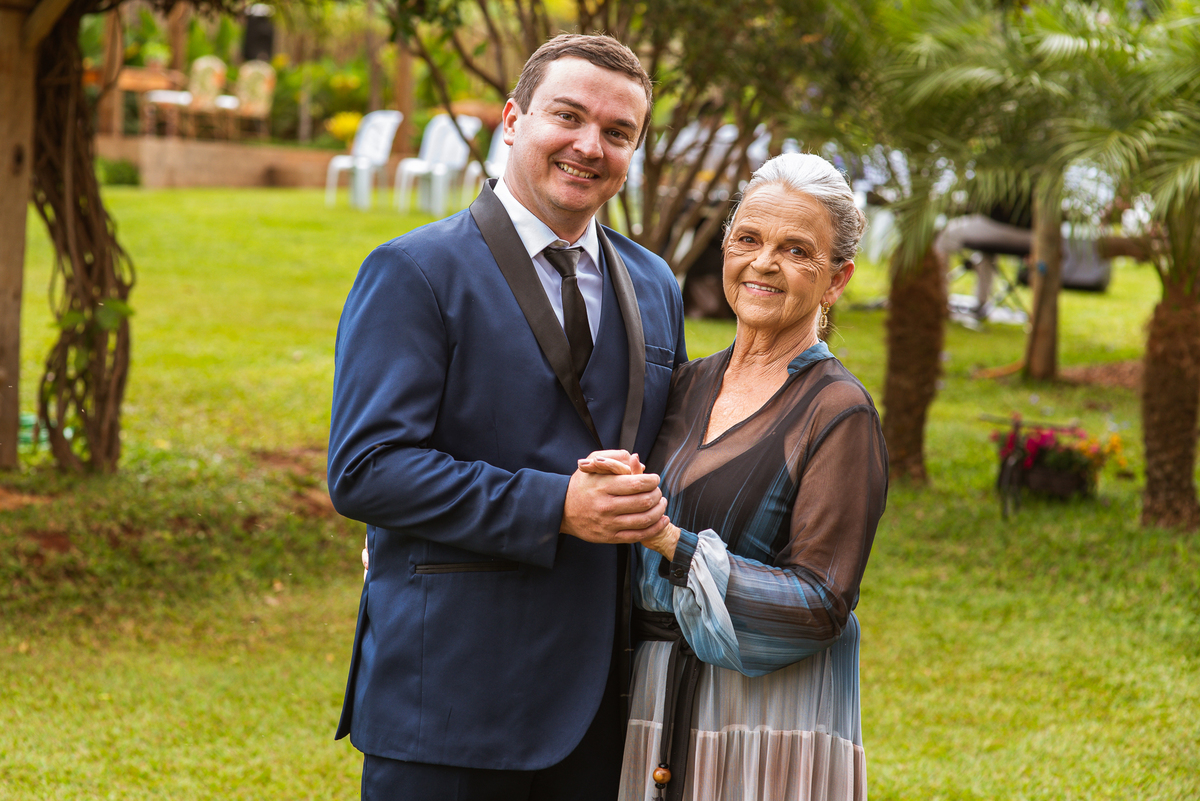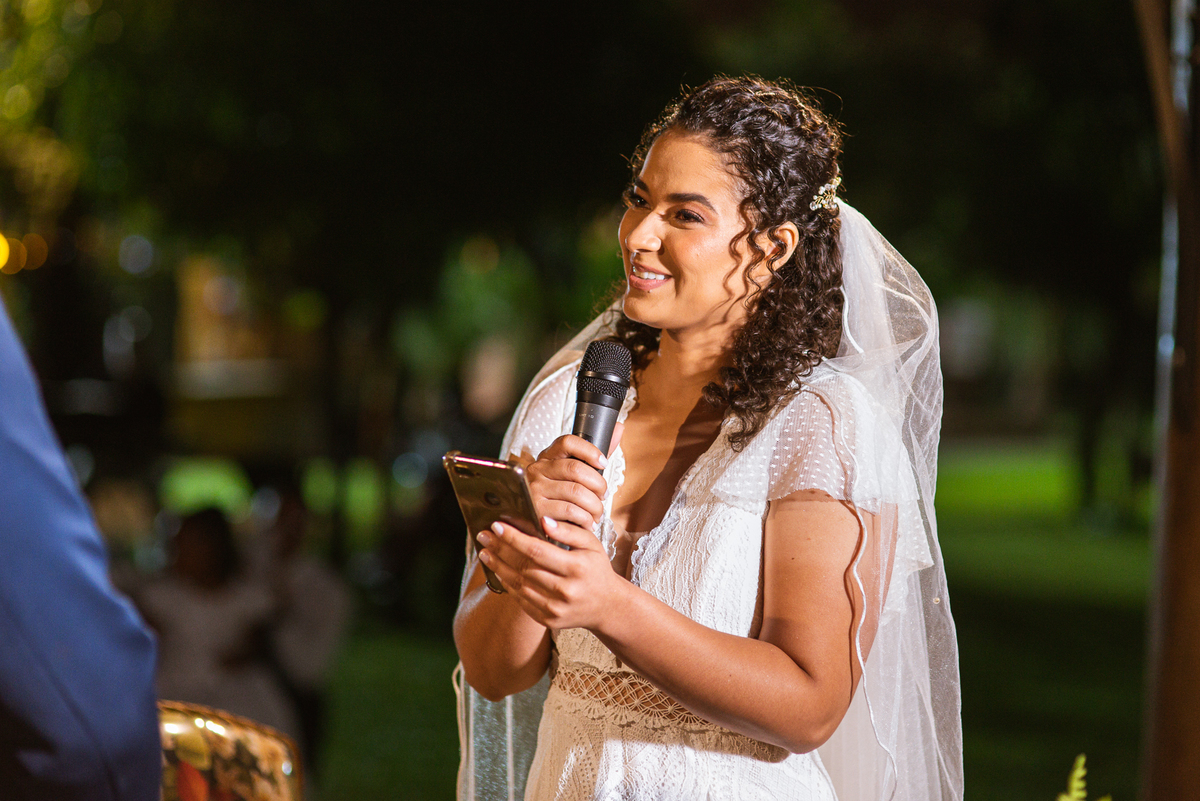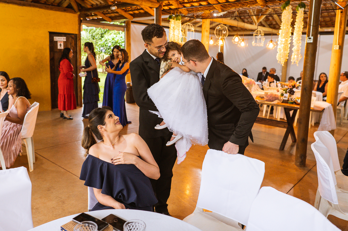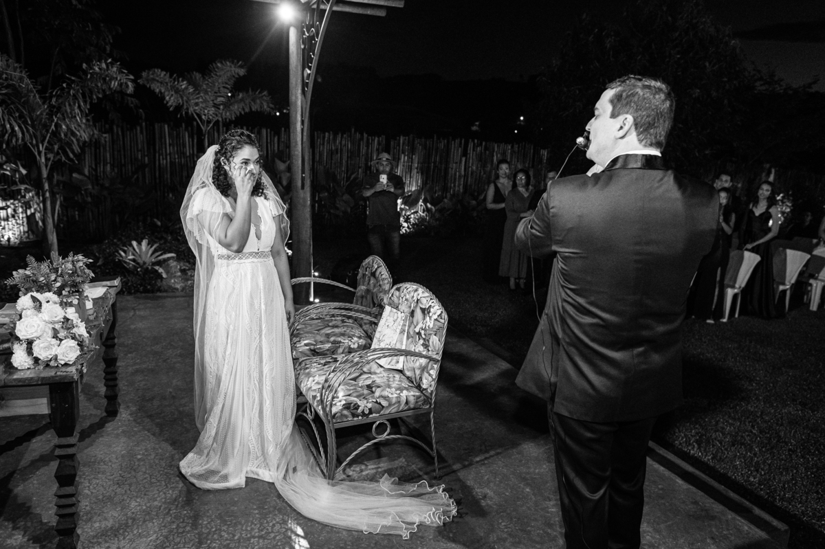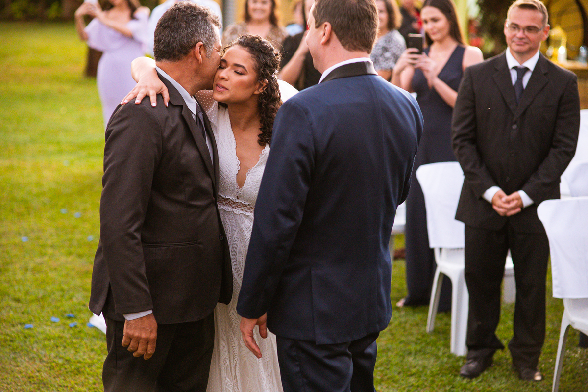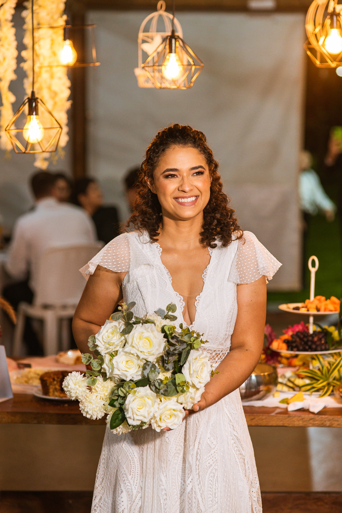 Eles despediram-se uns dos outros e agora juntos caminharam para o altar. Foram recepcionados pelo pastor celebrante que fez questão de tirar uma foto dos noivos antes de iniciar sua palavra. Toda a celebração foi emocionante do início ao final. O pastou preparou uma liturgia impecável, que uniu o trabalho dos noivos com a bíblia e o casamento. Foi incrível e muito especial. Ao final, os noivos fizeram seus votos super emocionantes, Holmes novamente surpreendeu sua noiva com uma música especial para presenteá-la na celebração. Os dois foram abençoados e declarados casados perante a lei dos homens e de Deus. Fizemos as fotografias de praxe e já preparamos a saída.