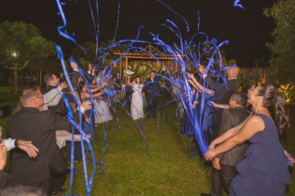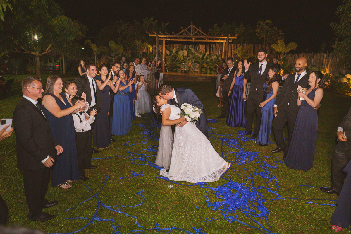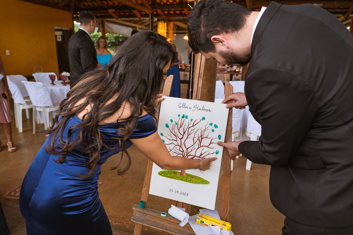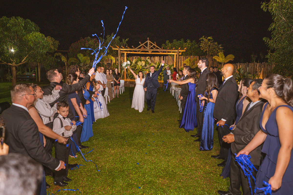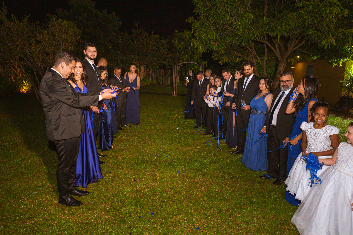 Os padrinhos já esperavam os noivos com muita alegria. Com fitas azuis, eles festejaram a passagem dos dois pelo corredor. Iniciamos a recepção nesse momento. O buffet era todo do local mesmo. Os convidados aproveitaram bastante, tiraram todas as fotos que quiseram e destaco aqui uma pintura muito especial, que foi presente da mãe do noivo para eles. Ela pintou uma árvore, onde os convidados poderiam colocar suas digitais em forma de mostrar sua presença no casamento. Todos participaram e embelezaram a árvore no quadro. Finalizamos nossa participação neste casamento lindo com a certeza de que nossa tarefa foi efetuada com todo carinho e dedicação.