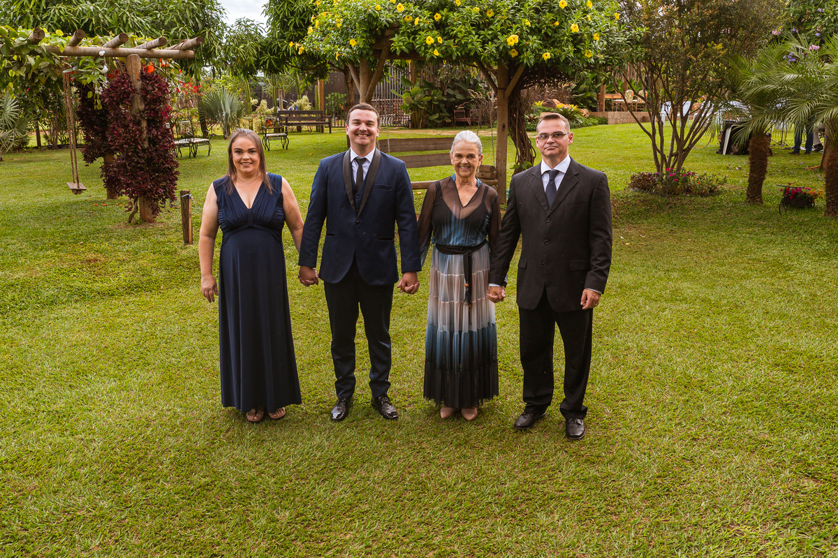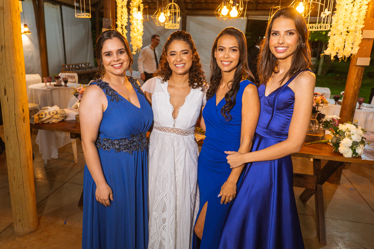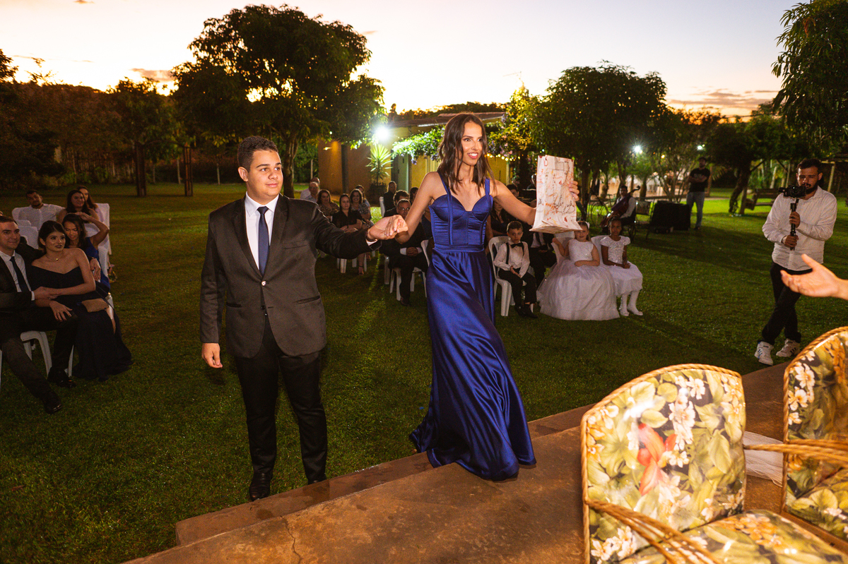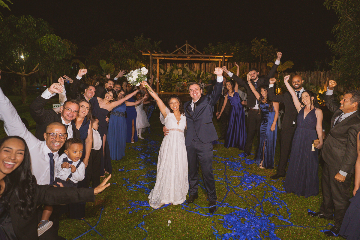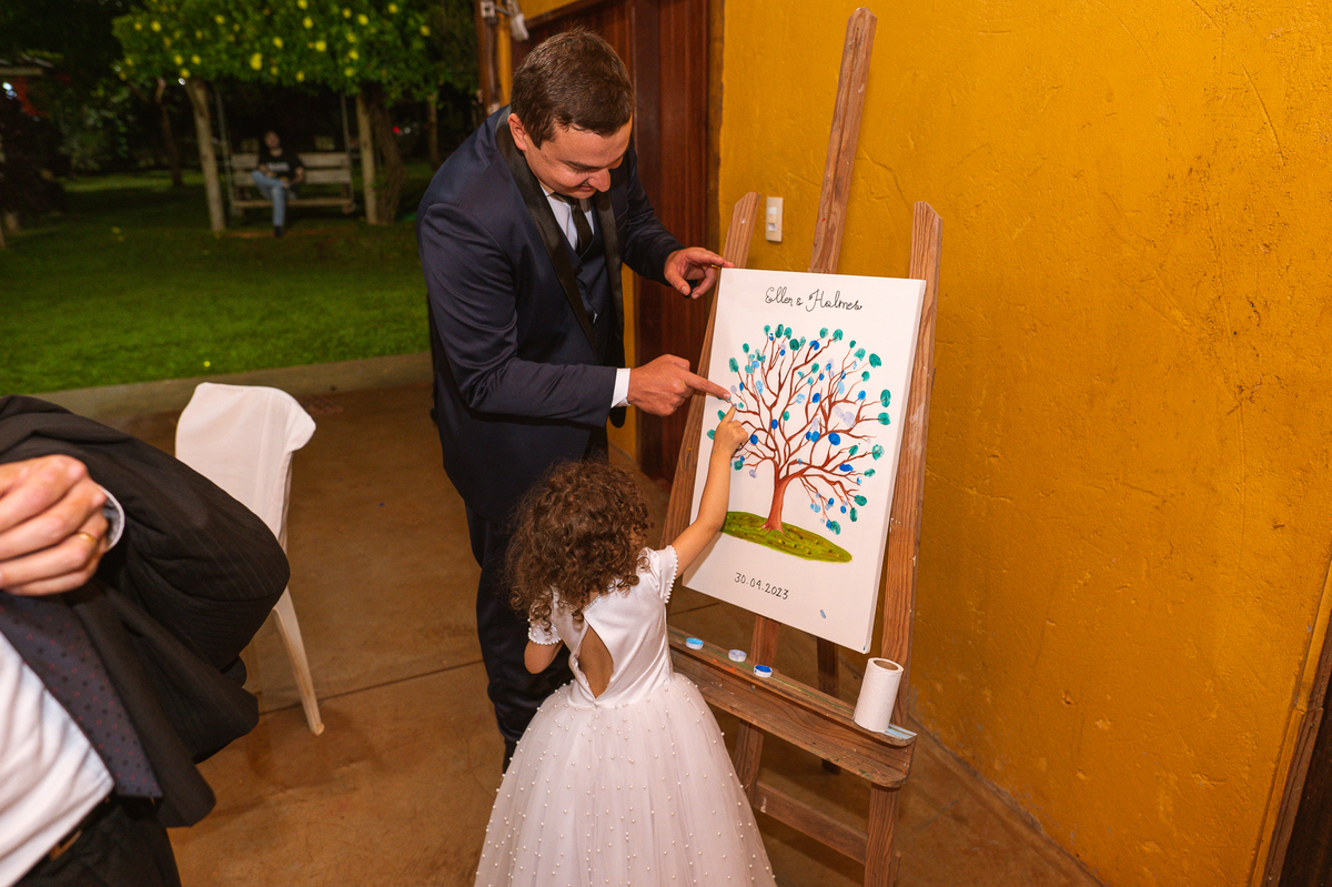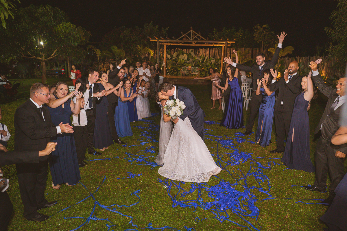 Os padrinhos já esperavam os noivos com muita alegria. Com fitas azuis, eles festejaram a passagem dos dois pelo corredor. Iniciamos a recepção nesse momento. O buffet era todo do local mesmo. Os convidados aproveitaram bastante, tiraram todas as fotos que quiseram e destaco aqui uma pintura muito especial, que foi presente da mãe do noivo para eles. Ela pintou uma árvore, onde os convidados poderiam colocar suas digitais em forma de mostrar sua presença no casamento. Todos participaram e embelezaram a árvore no quadro. Finalizamos nossa participação neste casamento lindo com a certeza de que nossa tarefa foi efetuada com todo carinho e dedicação.