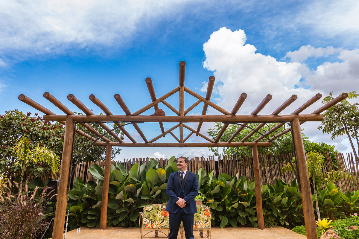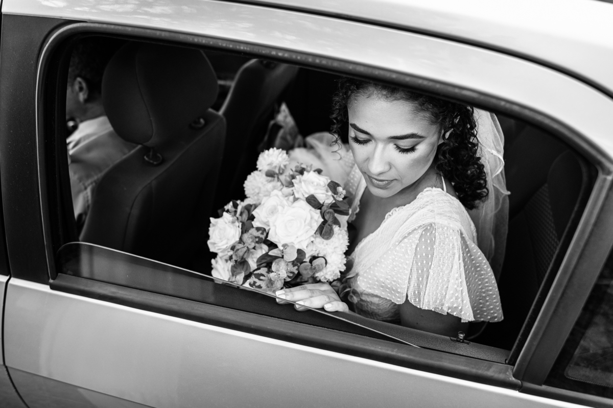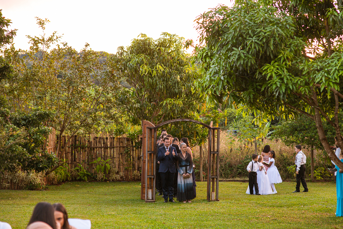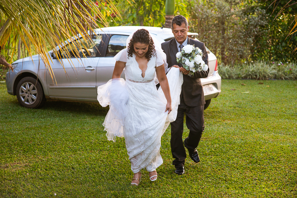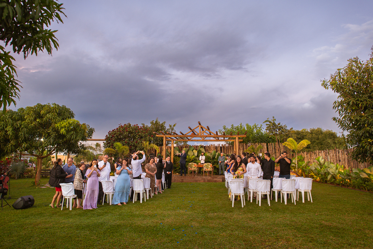 Enquanto fui fotografando os convidados chegando e os cumprimentos do noivo, aquele dia que estava lindíssimo começou a se transformar numa tarde mais escura. Todos os detalhes do casamento ao ar livre estavam prontinhos, tudo nos trinques. Em poucos minutos, a noiva chegou no carro e fizemos as fotos. Todos nós com a fé de que não choveria. Mas não deu. A chuvinha insistiu em cair e em atrasar algum tempo o casamento. Olhávamos para o céu e imaginávamos que a chuvinha iria embora rapidinho, mas passavam os minutos e a água caindo.