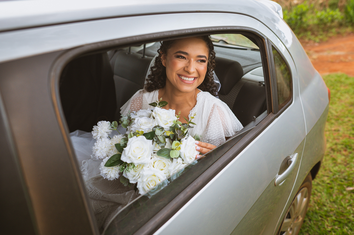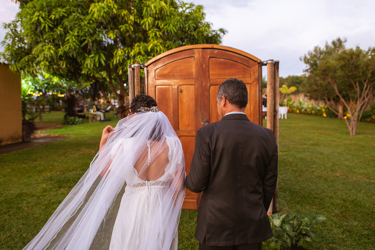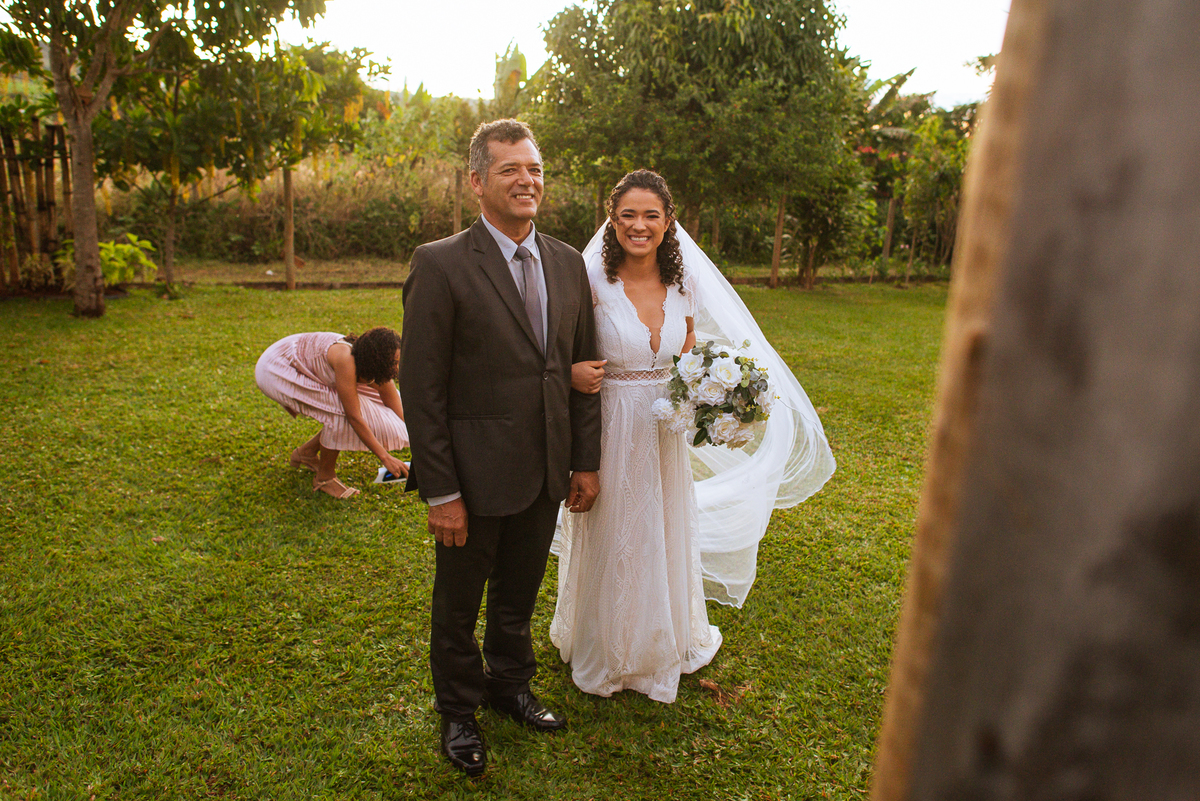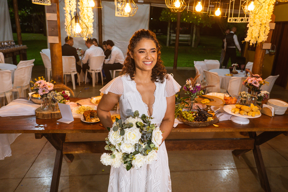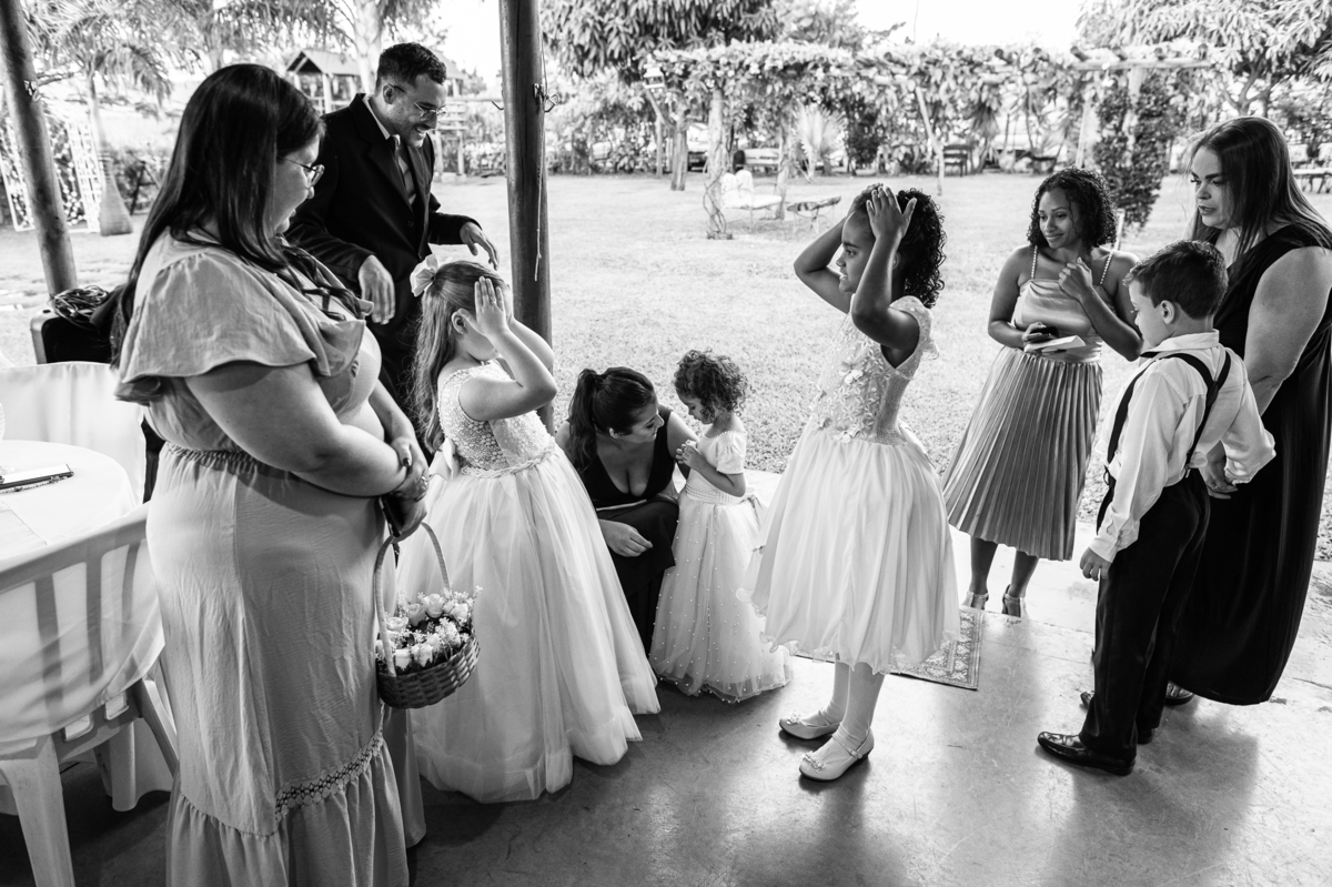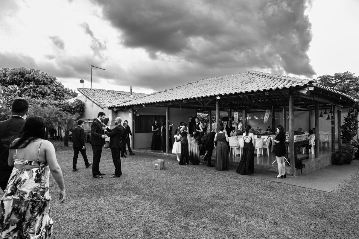 Enquanto fui fotografando os convidados chegando e os cumprimentos do noivo, aquele dia que estava lindíssimo começou a se transformar numa tarde mais escura. Todos os detalhes do casamento ao ar livre estavam prontinhos, tudo nos trinques. Em poucos minutos, a noiva chegou no carro e fizemos as fotos. Todos nós com a fé de que não choveria. Mas não deu. A chuvinha insistiu em cair e em atrasar algum tempo o casamento. Olhávamos para o céu e imaginávamos que a chuvinha iria embora rapidinho, mas passavam os minutos e a água caindo.
