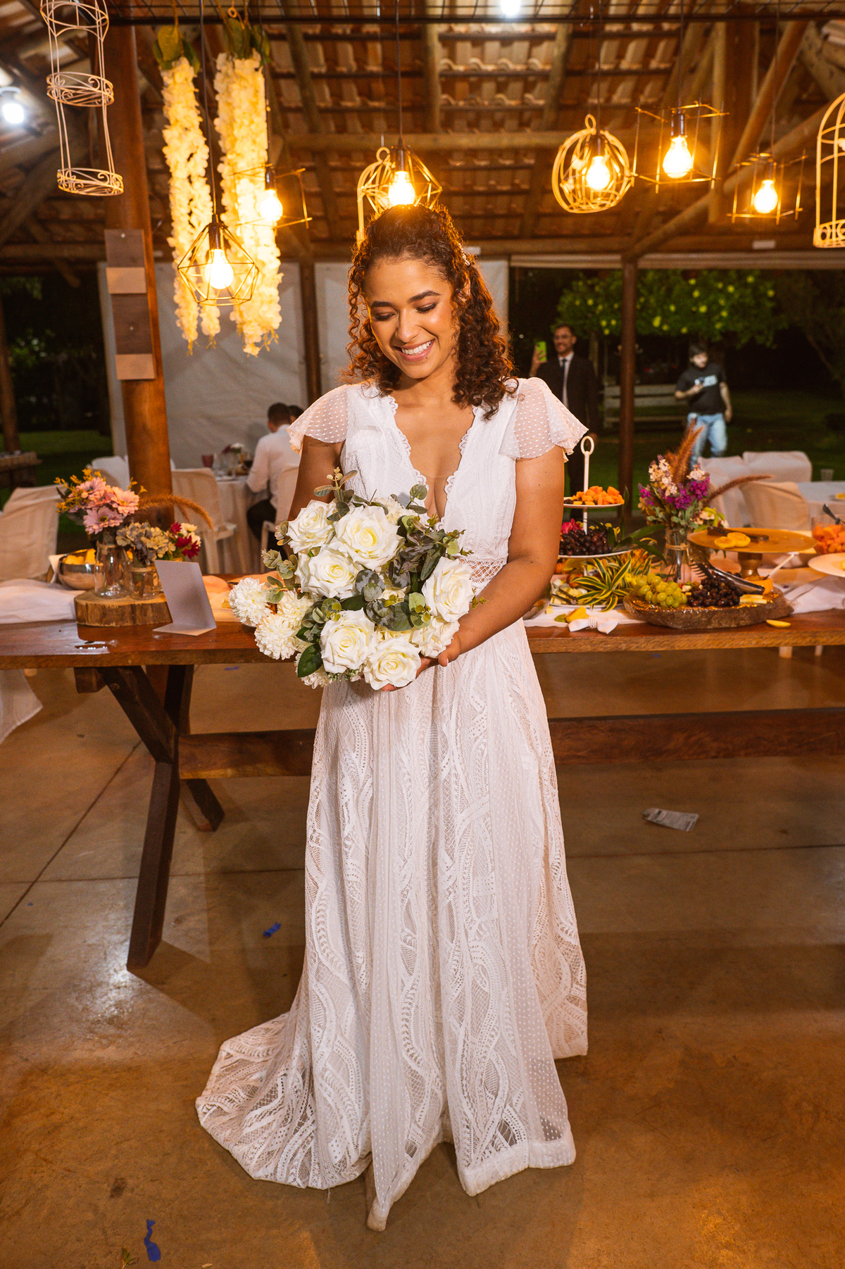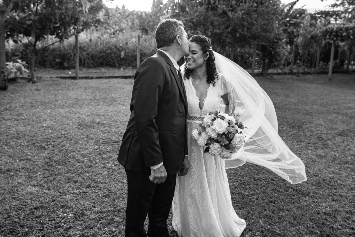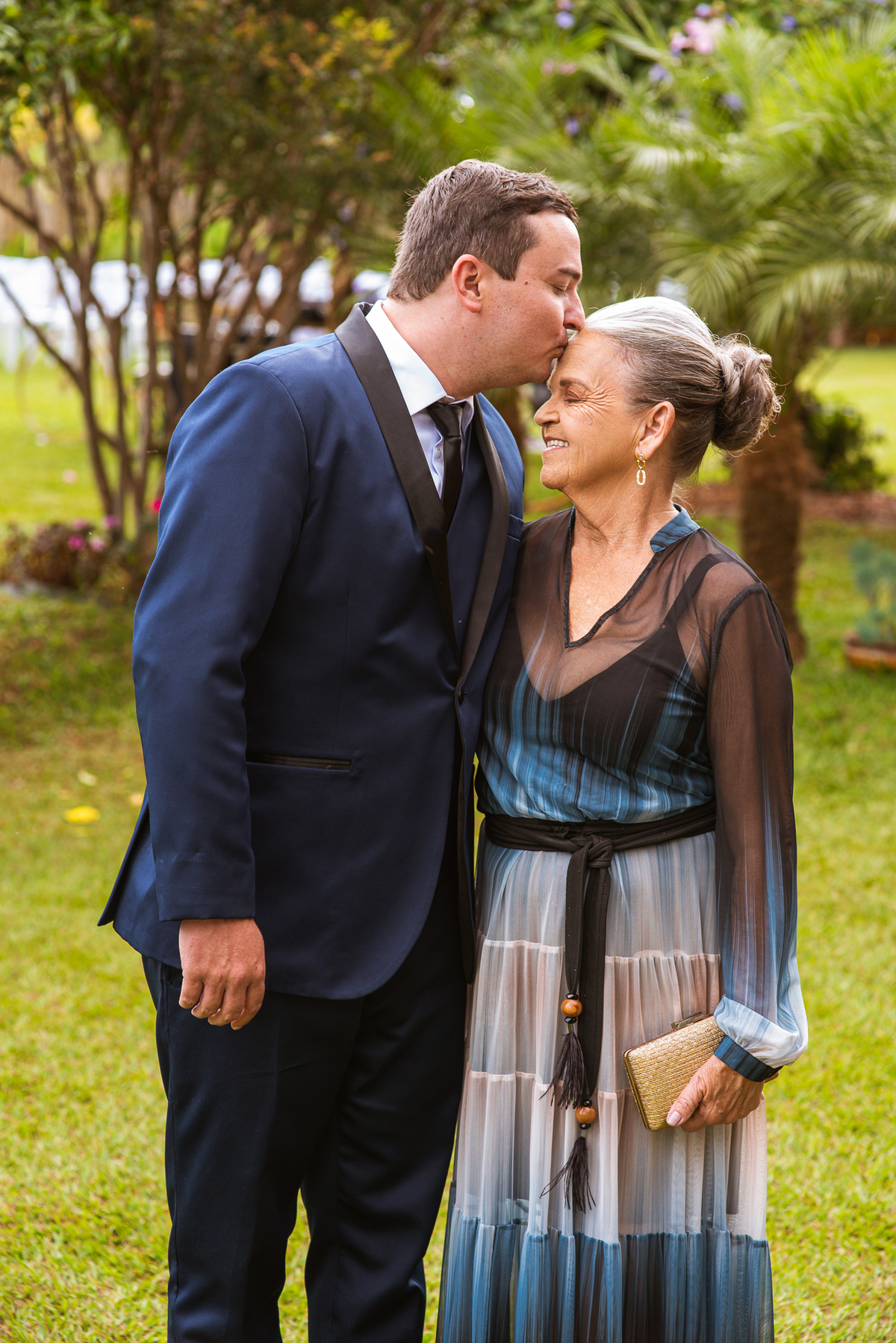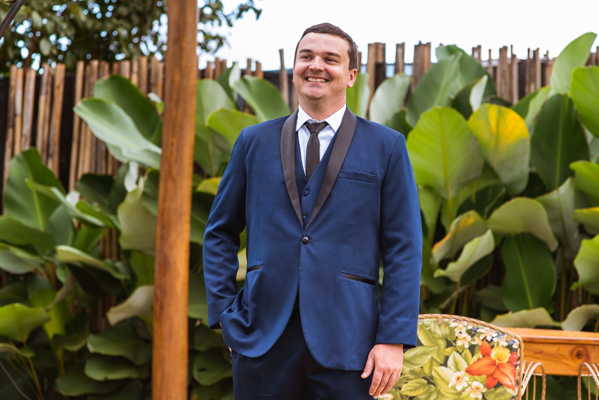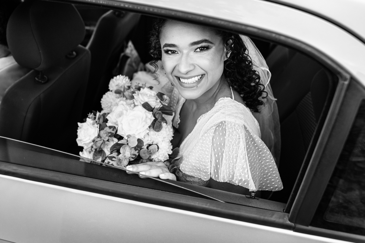 Enquanto fui fotografando os convidados chegando e os cumprimentos do noivo, aquele dia que estava lindíssimo começou a se transformar numa tarde mais escura. Todos os detalhes do casamento ao ar livre estavam prontinhos, tudo nos trinques. Em poucos minutos, a noiva chegou no carro e fizemos as fotos. Todos nós com a fé de que não choveria. Mas não deu. A chuvinha insistiu em cair e em atrasar algum tempo o casamento. Olhávamos para o céu e imaginávamos que a chuvinha iria embora rapidinho, mas passavam os minutos e a água caindo.