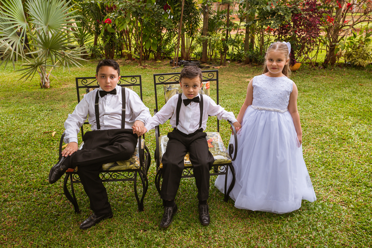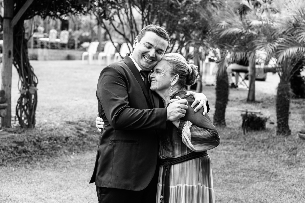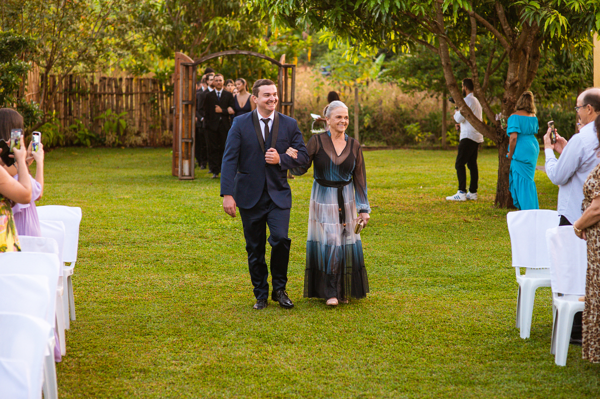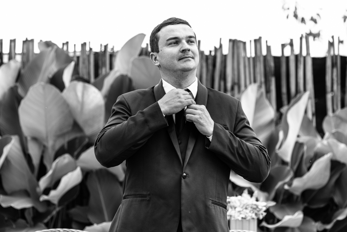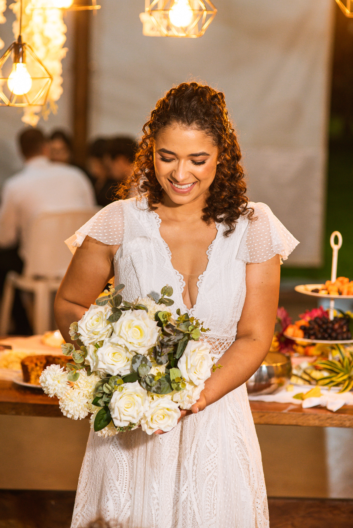Enquanto fui fotografando os convidados chegando e os cumprimentos do noivo, aquele dia que estava lindíssimo começou a se transformar numa tarde mais escura. Todos os detalhes do casamento ao ar livre estavam prontinhos, tudo nos trinques. Em poucos minutos, a noiva chegou no carro e fizemos as fotos. Todos nós com a fé de que não choveria. Mas não deu. A chuvinha insistiu em cair e em atrasar algum tempo o casamento. Olhávamos para o céu e imaginávamos que a chuvinha iria embora rapidinho, mas passavam os minutos e a água caindo.