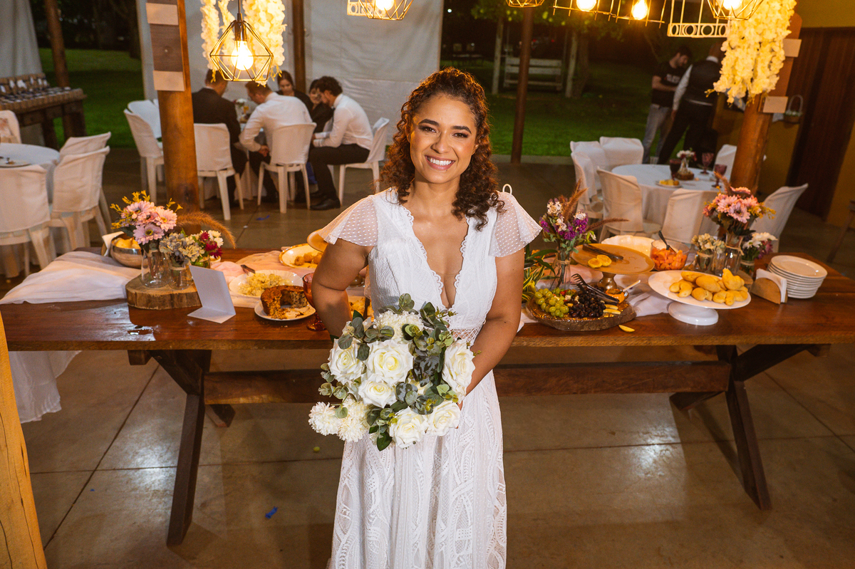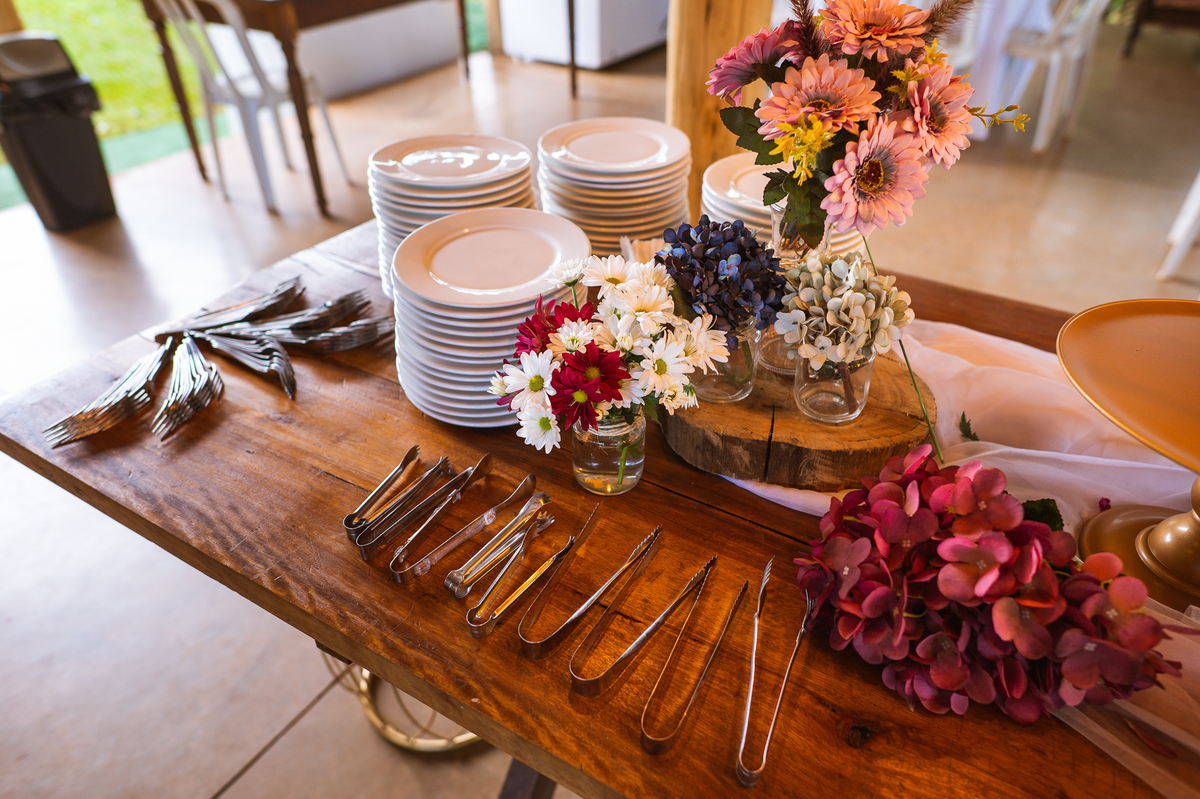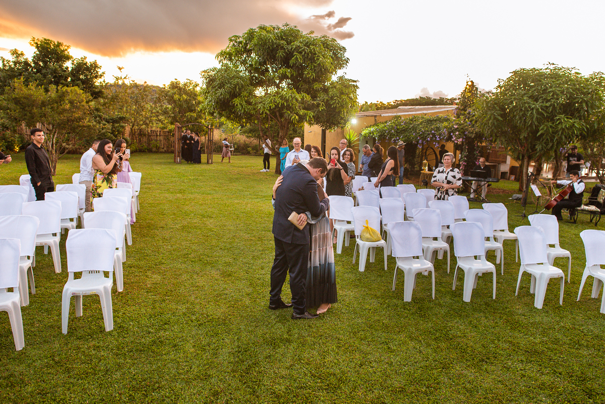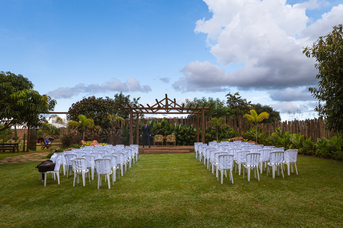 Com o coração apertado enquanto esperávamos, Holmes conversou com a noiva e decidiram esperar por mais alguns minutos. A chuvinha parava e começava de novo. Pingava um pouquinho e parava. Na dúvida, depois de esperar esse tempinho os noivos decidiram transferir a cerimônia para o local fechado. Só que isso tiraria todo o charme do casamento, tudo que havia sido preparado e as cadeiras prontinhas aguardando os convidados, o altar lá só aguardando a cerimônia iniciar. Chegamos até mudar a mesa do buffet para posicionar o nosso novo altar dentro do chalé. Mas Deus tinha outros planos...
