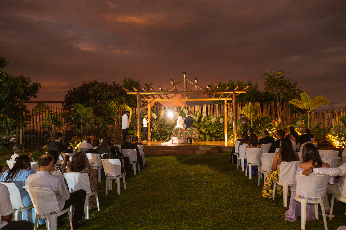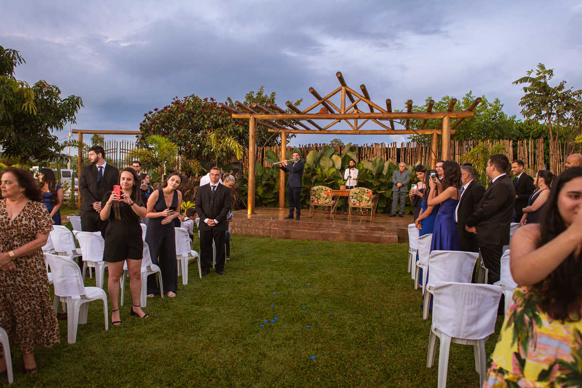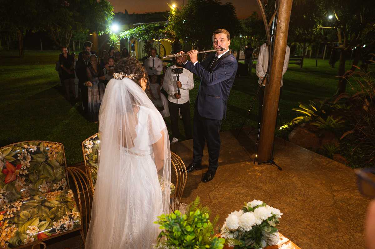 Enquanto mudávamos a mesa, o dono do local olhou o tempo e viu que a nuvem havia ido embora e que o céu estava limpando. Era quase inacreditável, porque minutos atrás o céu estava coberto. Olhei lá fora e confirmei o que ele havia dito. Um céu azul maravilhoso abriu e finalmente poderíamos iniciar a cerimônia no local inicial. Corre pra cá, ajusta cabo pra lá, monta som e corre com os convidados pra se posicionar na entrada e pronto. Tudo certinho pra começar! Enfim, os músicos iniciaram sua melodia maravilhosa e envolvente que marcou o começo da celebração.