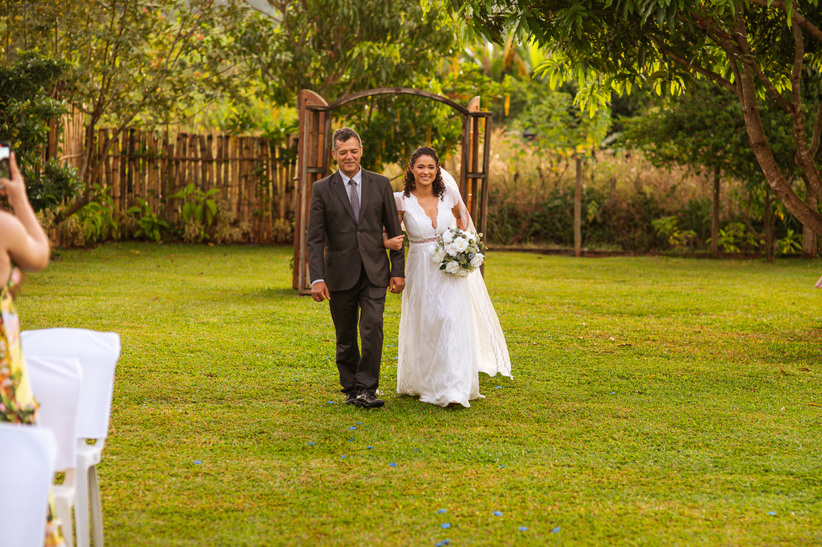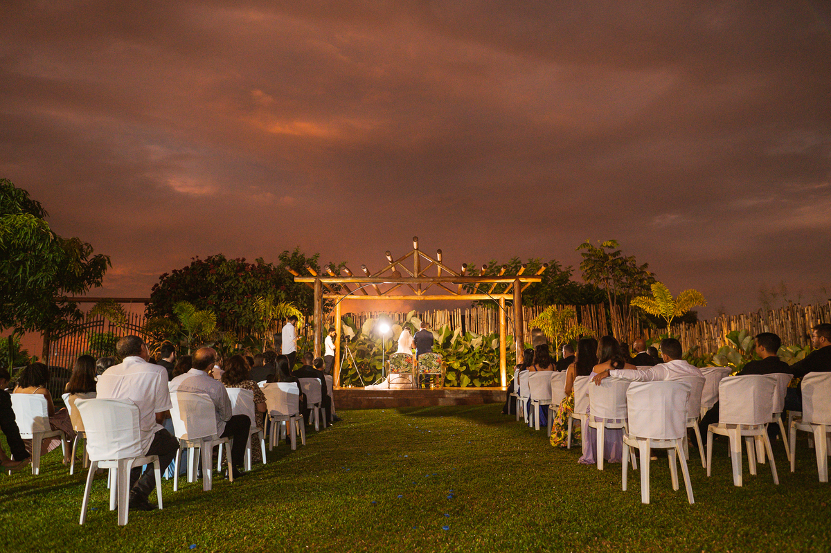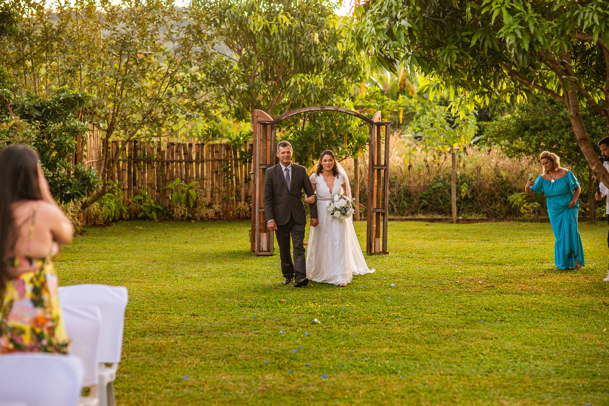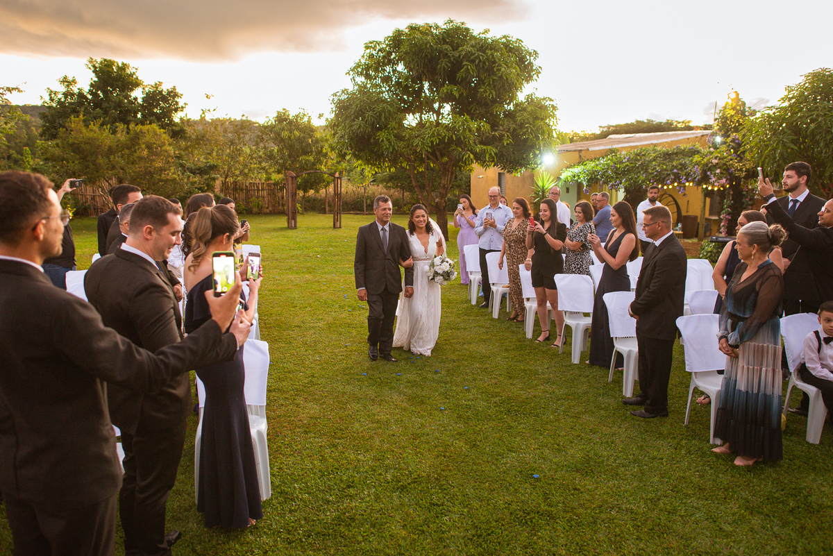 Enquanto mudávamos a mesa, o dono do local olhou o tempo e viu que a nuvem havia ido embora e que o céu estava limpando. Era quase inacreditável, porque minutos atrás o céu estava coberto. Olhei lá fora e confirmei o que ele havia dito. Um céu azul maravilhoso abriu e finalmente poderíamos iniciar a cerimônia no local inicial. Corre pra cá, ajusta cabo pra lá, monta som e corre com os convidados pra se posicionar na entrada e pronto. Tudo certinho pra começar! Enfim, os músicos iniciaram sua melodia maravilhosa e envolvente que marcou o começo da celebração.