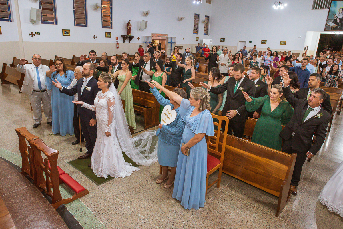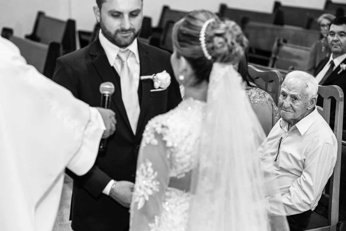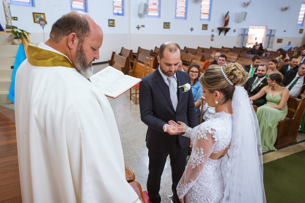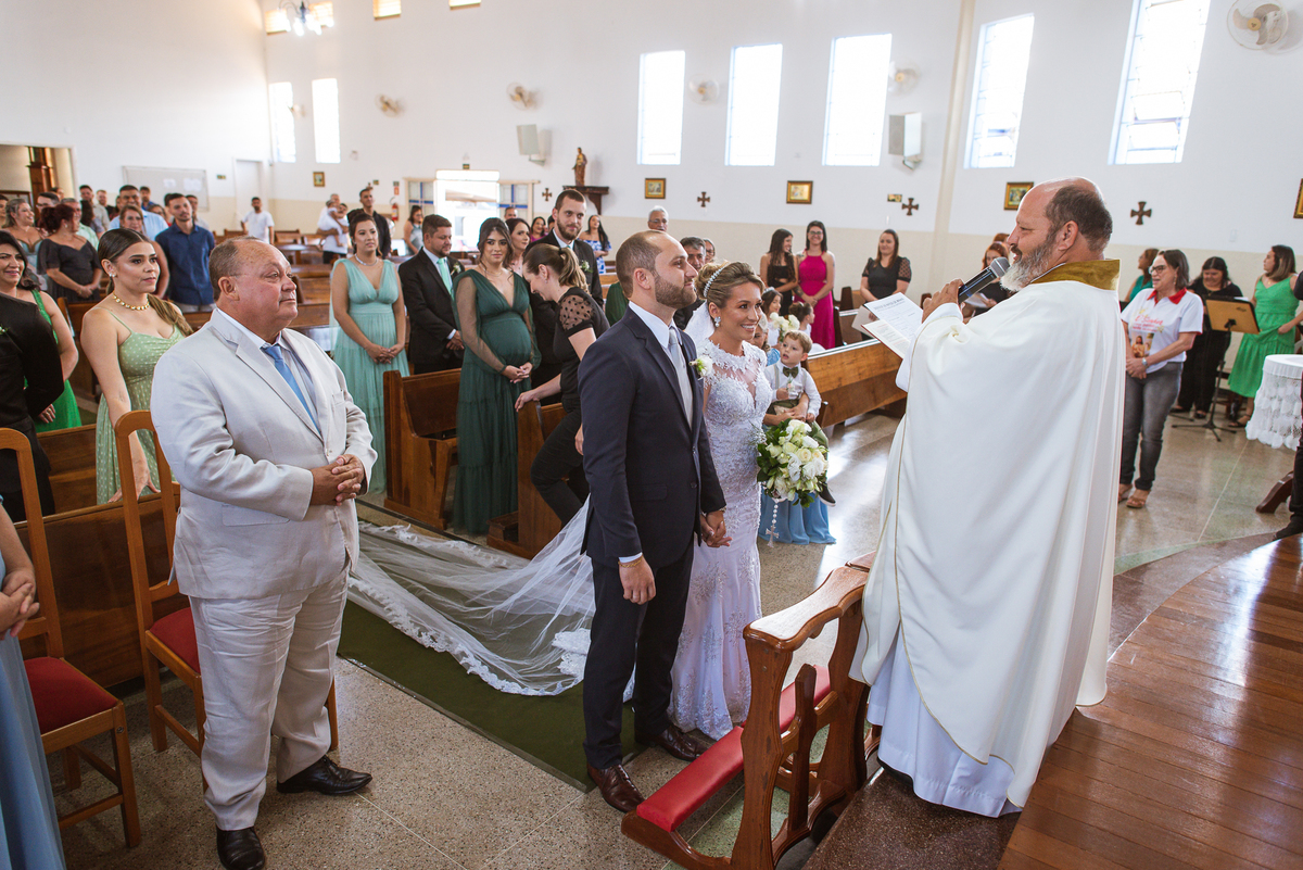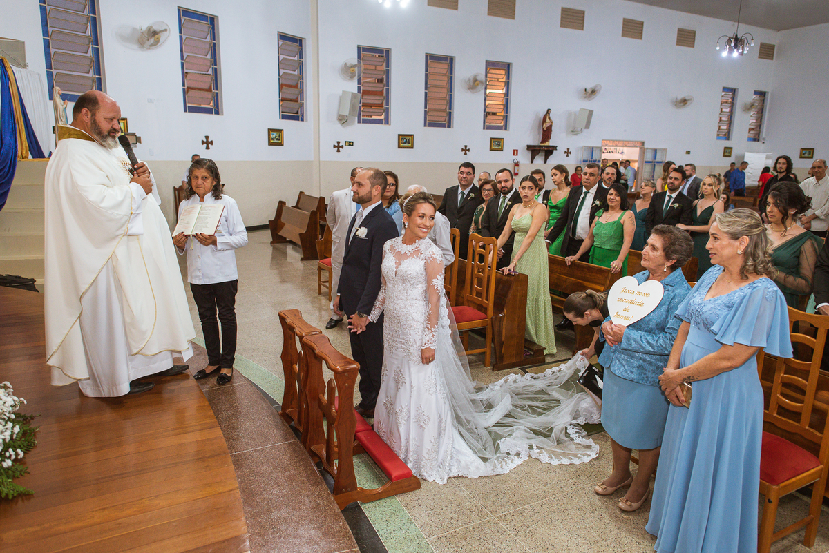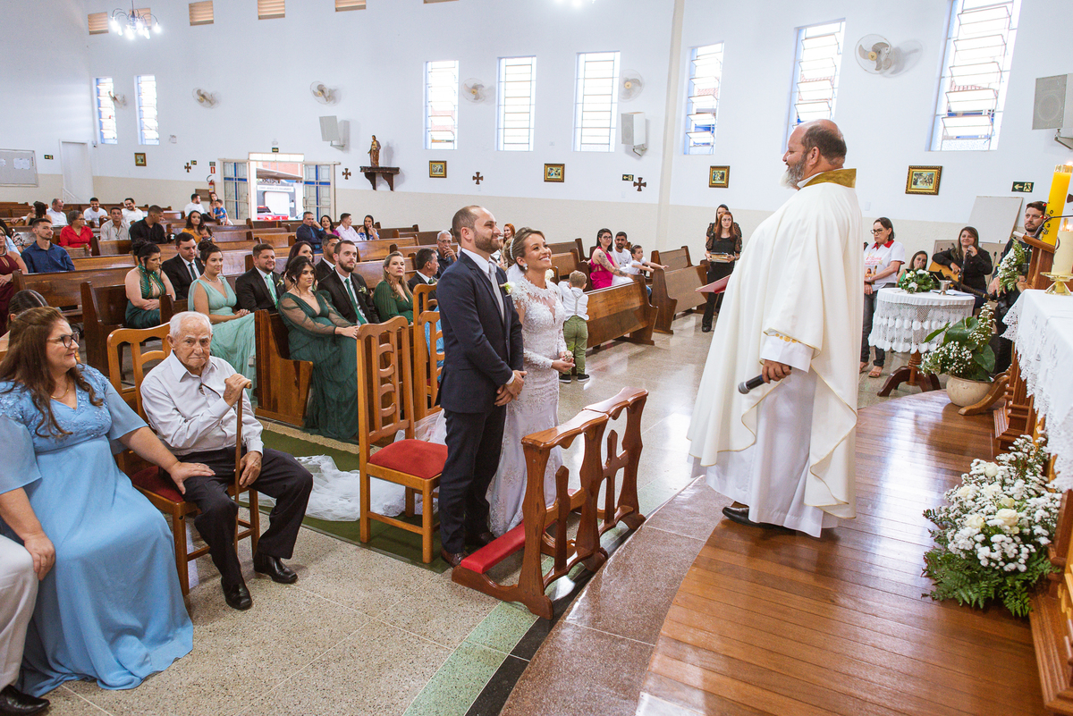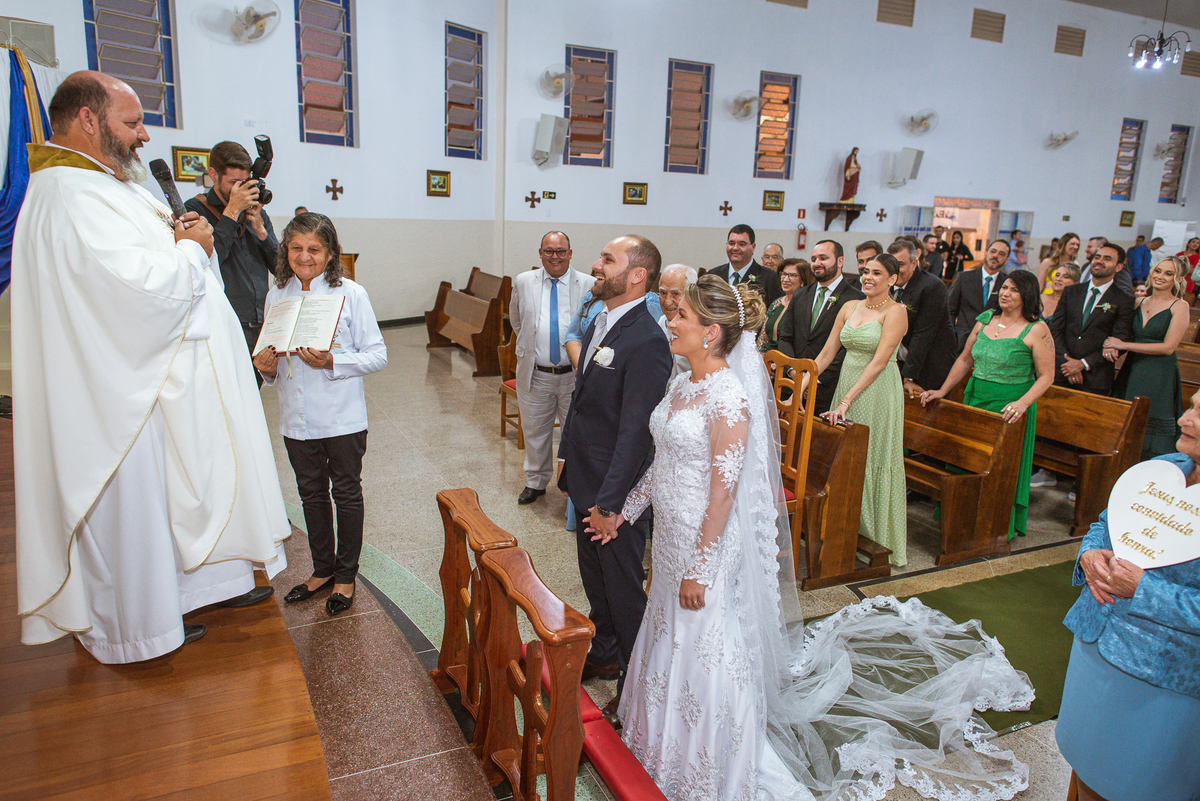 O padre realizou uma cerimônia repleta de momentos divertidos em que os noivos sorriram muito. Ao mesmo tempo, os fez relembrar da fé e de sempre rezarem juntos. Fez questão também de fazer os noivos pedir a bênção e agradecer aos seus pais e aos sogros. Um momento bem divertido foi quando o avô do noivo, do alto dos seus 96 anos de idade, me cutucou com a bengala e me disse: "Esse menino ai é meu neto." Achei tão bonitinho da parte dele. Fazer questão de mostrar o quanto estava feliz com aquele momento. Enfim, os noivos foram abençoados, declarados casados e trocaram as alianças. Após toda a celebração tivemos a saída dos noivos rumo à recepção. Do lado de fora da Igreja, os padrinhos alinhados comemoravam muito a conquista dos recém-casados.