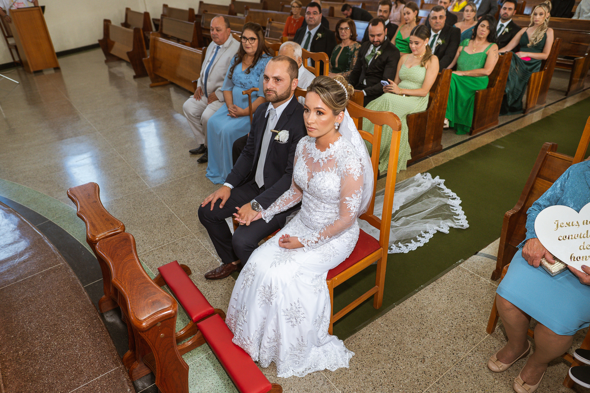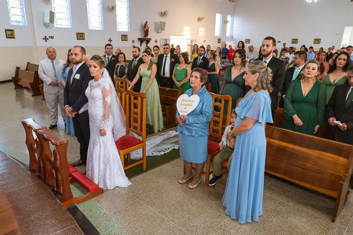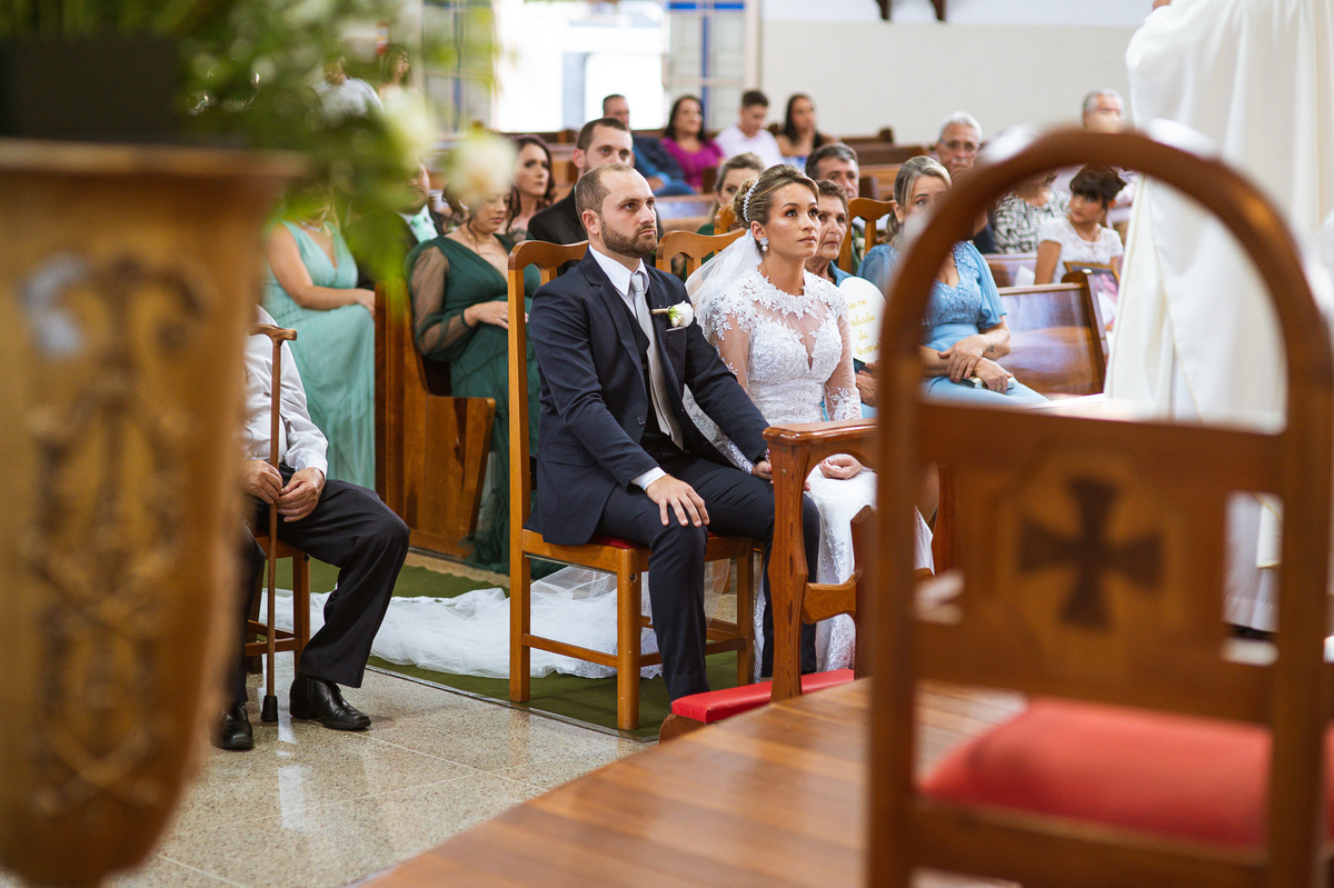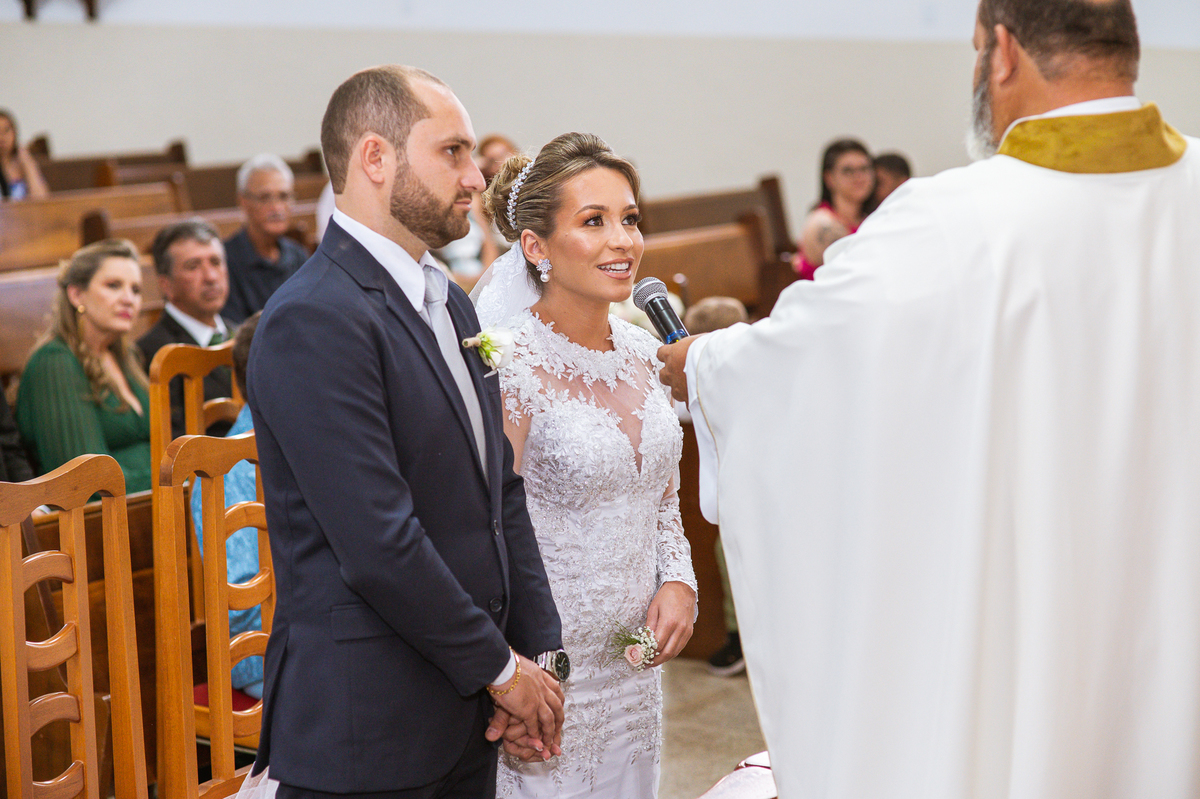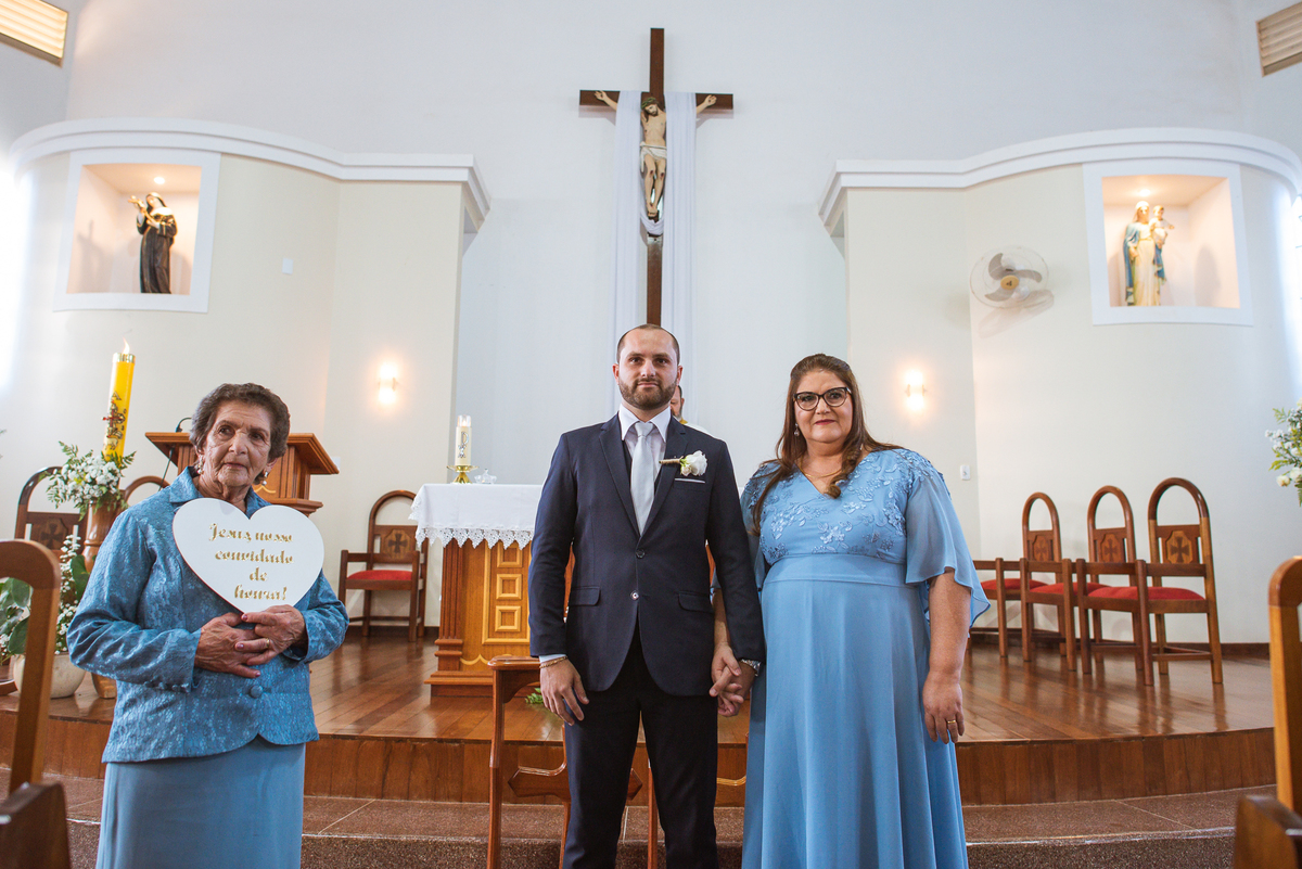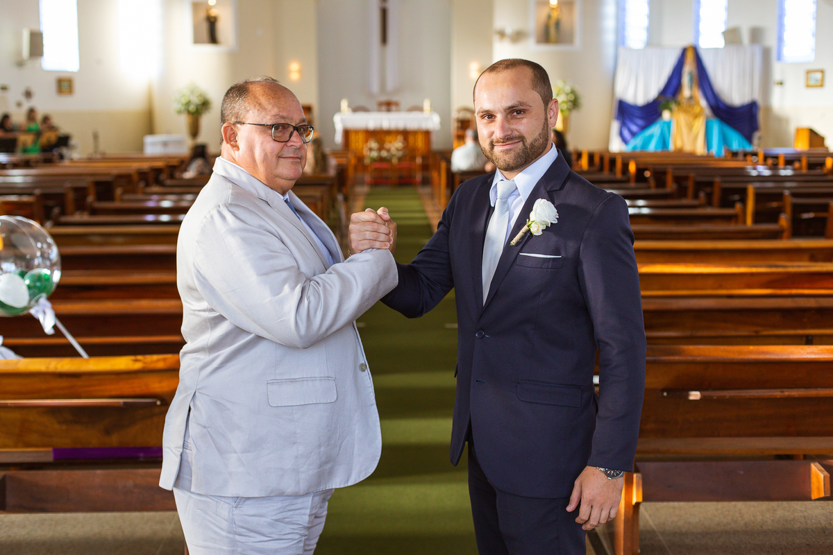 O padre realizou uma cerimônia repleta de momentos divertidos em que os noivos sorriram muito. Ao mesmo tempo, os fez relembrar da fé e de sempre rezarem juntos. Fez questão também de fazer os noivos pedir a bênção e agradecer aos seus pais e aos sogros. Um momento bem divertido foi quando o avô do noivo, do alto dos seus 96 anos de idade, me cutucou com a bengala e me disse: "Esse menino ai é meu neto." Achei tão bonitinho da parte dele. Fazer questão de mostrar o quanto estava feliz com aquele momento. Enfim, os noivos foram abençoados, declarados casados e trocaram as alianças. Após toda a celebração tivemos a saída dos noivos rumo à recepção. Do lado de fora da Igreja, os padrinhos alinhados comemoravam muito a conquista dos recém-casados.