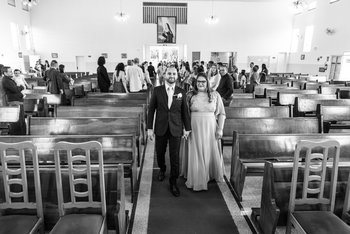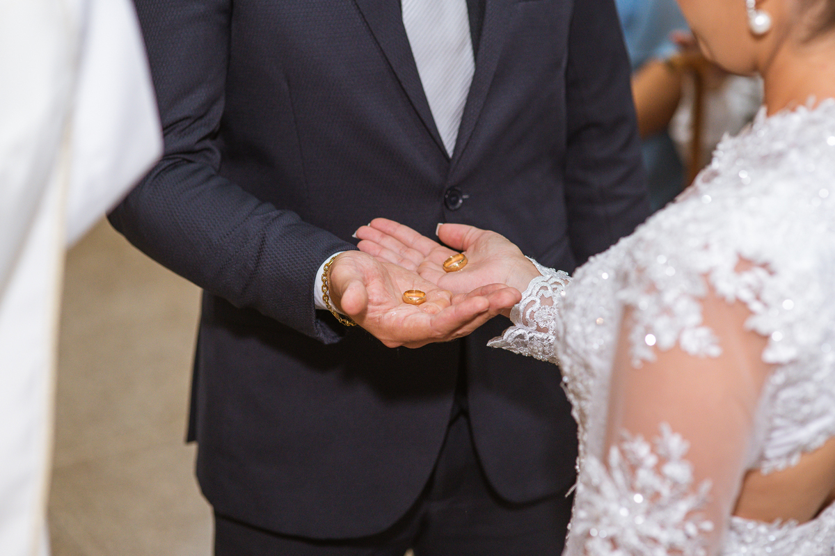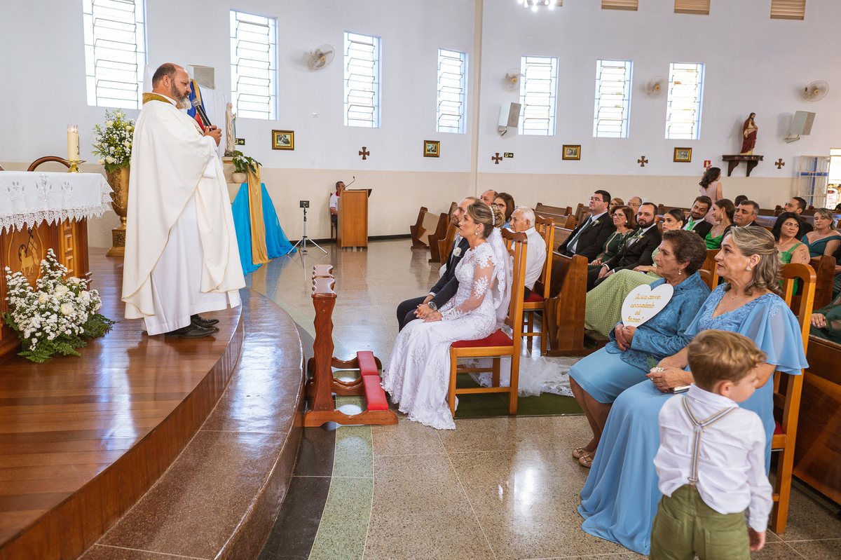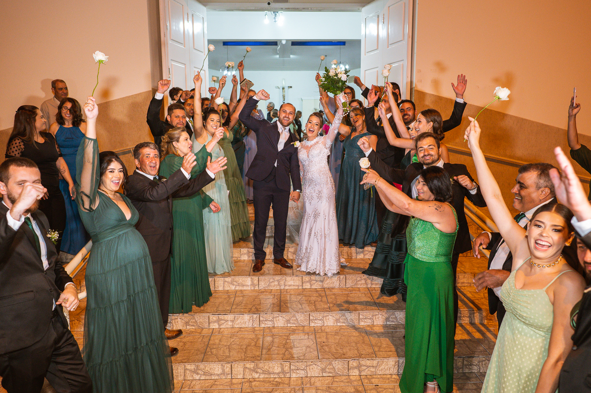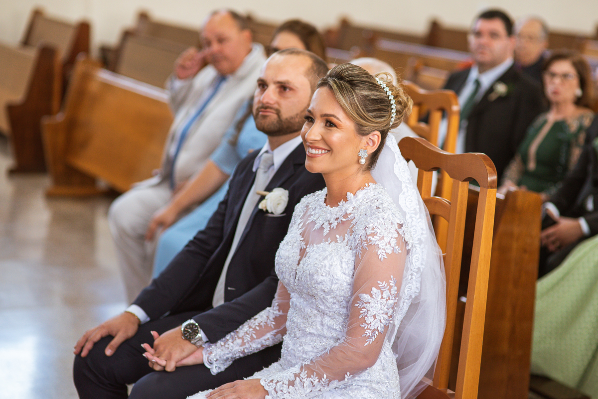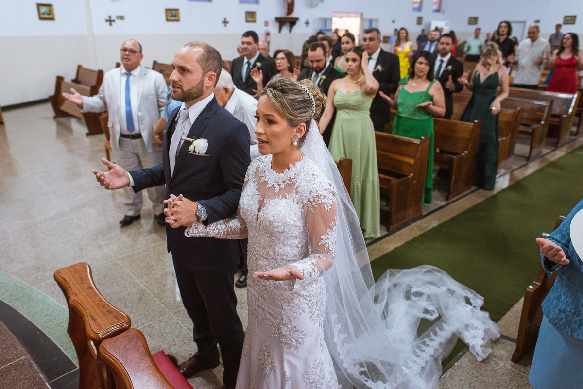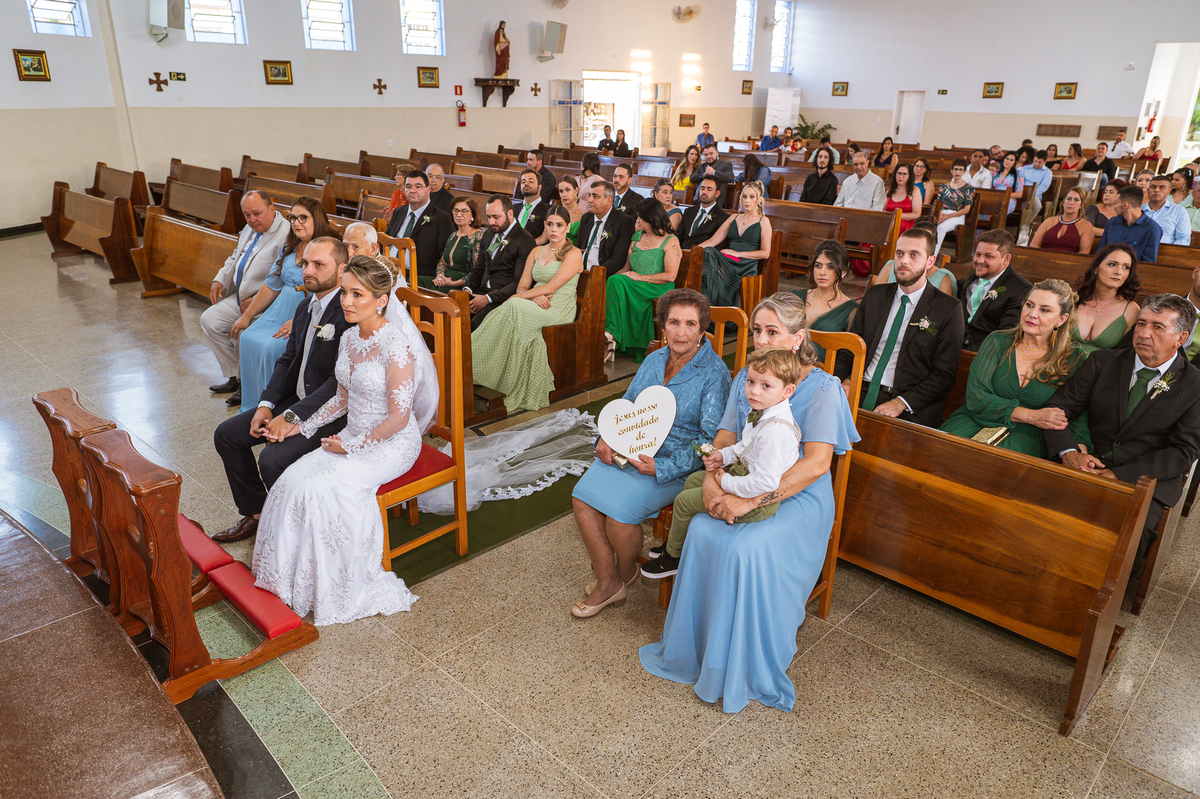 O padre realizou uma cerimônia repleta de momentos divertidos em que os noivos sorriram muito. Ao mesmo tempo, os fez relembrar da fé e de sempre rezarem juntos. Fez questão também de fazer os noivos pedir a bênção e agradecer aos seus pais e aos sogros. Um momento bem divertido foi quando o avô do noivo, do alto dos seus 96 anos de idade, me cutucou com a bengala e me disse: "Esse menino ai é meu neto." Achei tão bonitinho da parte dele. Fazer questão de mostrar o quanto estava feliz com aquele momento. Enfim, os noivos foram abençoados, declarados casados e trocaram as alianças. Após toda a celebração tivemos a saída dos noivos rumo à recepção. Do lado de fora da Igreja, os padrinhos alinhados comemoravam muito a conquista dos recém-casados.