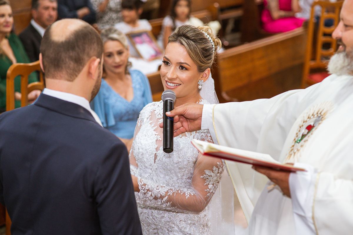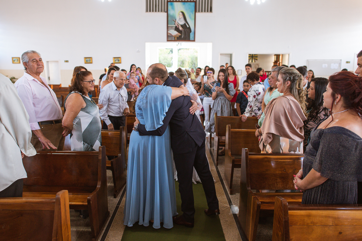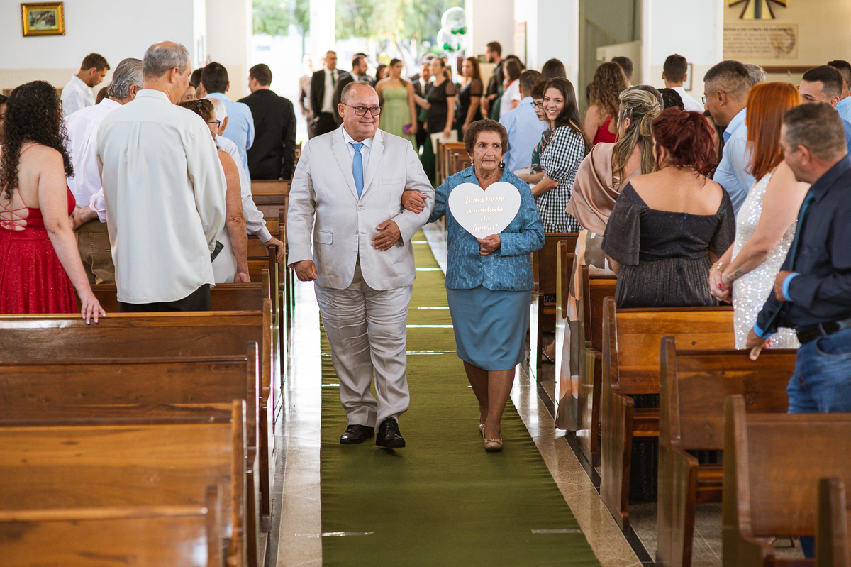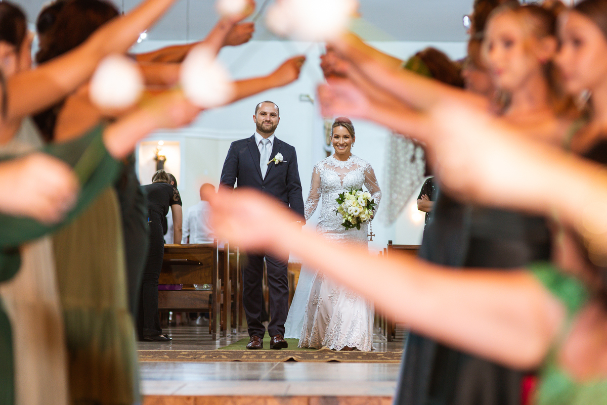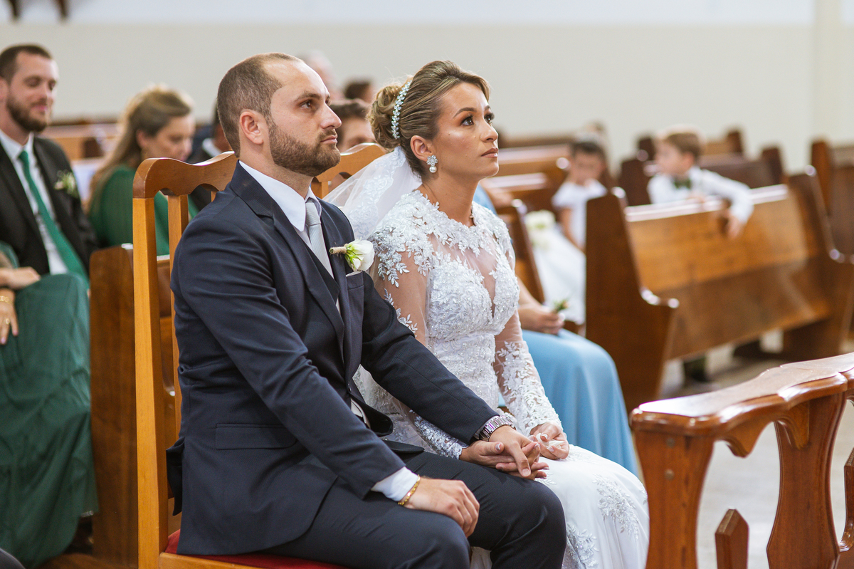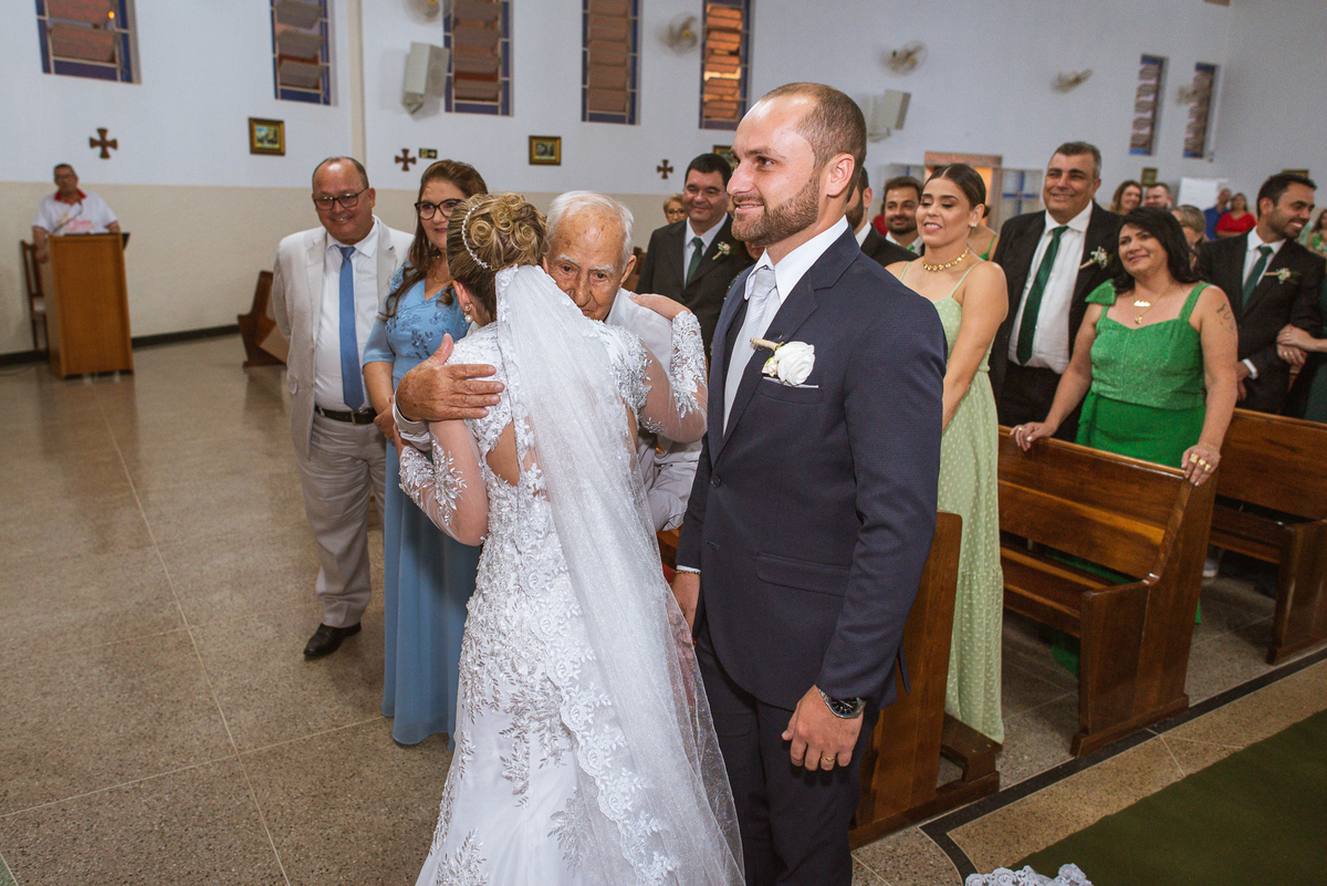 O padre realizou uma cerimônia repleta de momentos divertidos em que os noivos sorriram muito. Ao mesmo tempo, os fez relembrar da fé e de sempre rezarem juntos. Fez questão também de fazer os noivos pedir a bênção e agradecer aos seus pais e aos sogros. Um momento bem divertido foi quando o avô do noivo, do alto dos seus 96 anos de idade, me cutucou com a bengala e me disse: "Esse menino ai é meu neto." Achei tão bonitinho da parte dele. Fazer questão de mostrar o quanto estava feliz com aquele momento. Enfim, os noivos foram abençoados, declarados casados e trocaram as alianças. Após toda a celebração tivemos a saída dos noivos rumo à recepção. Do lado de fora da Igreja, os padrinhos alinhados comemoravam muito a conquista dos recém-casados.
