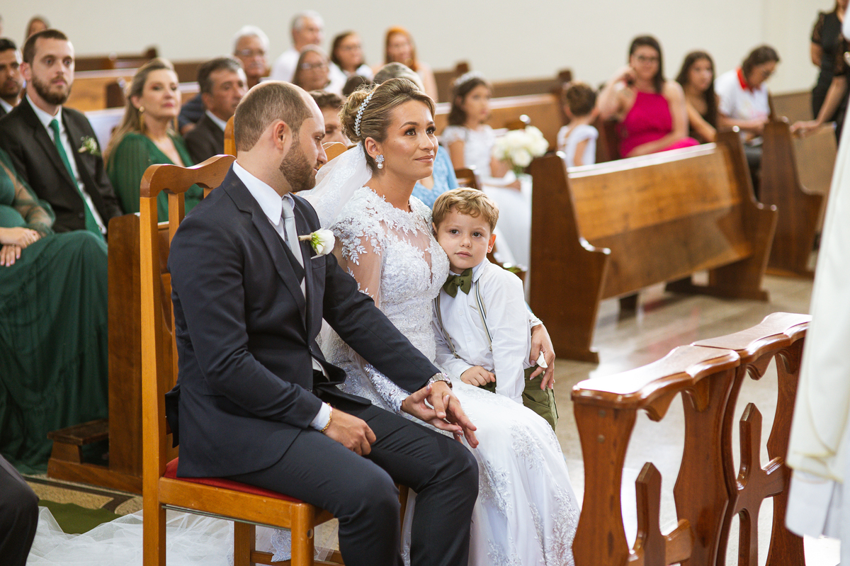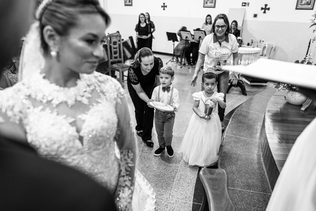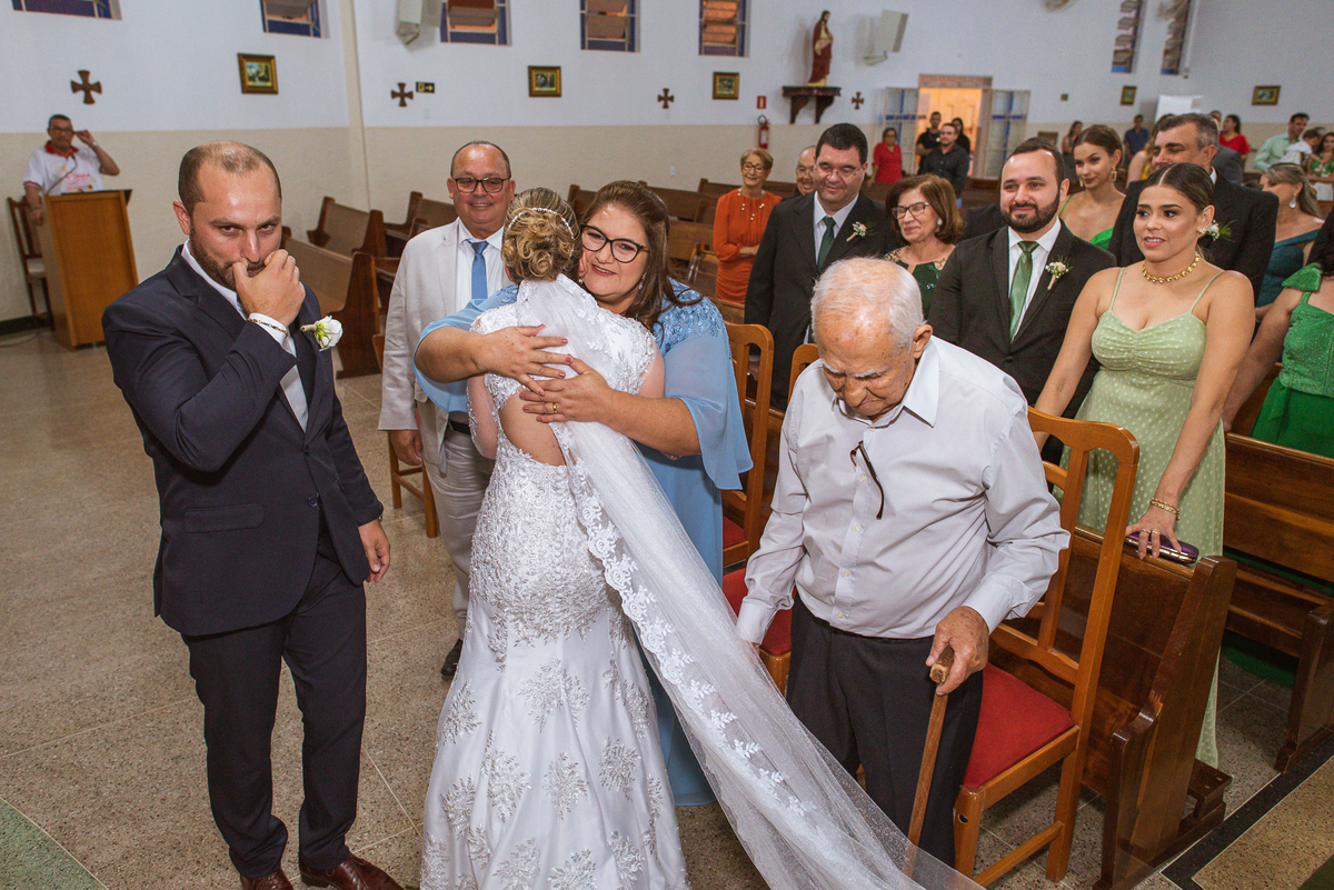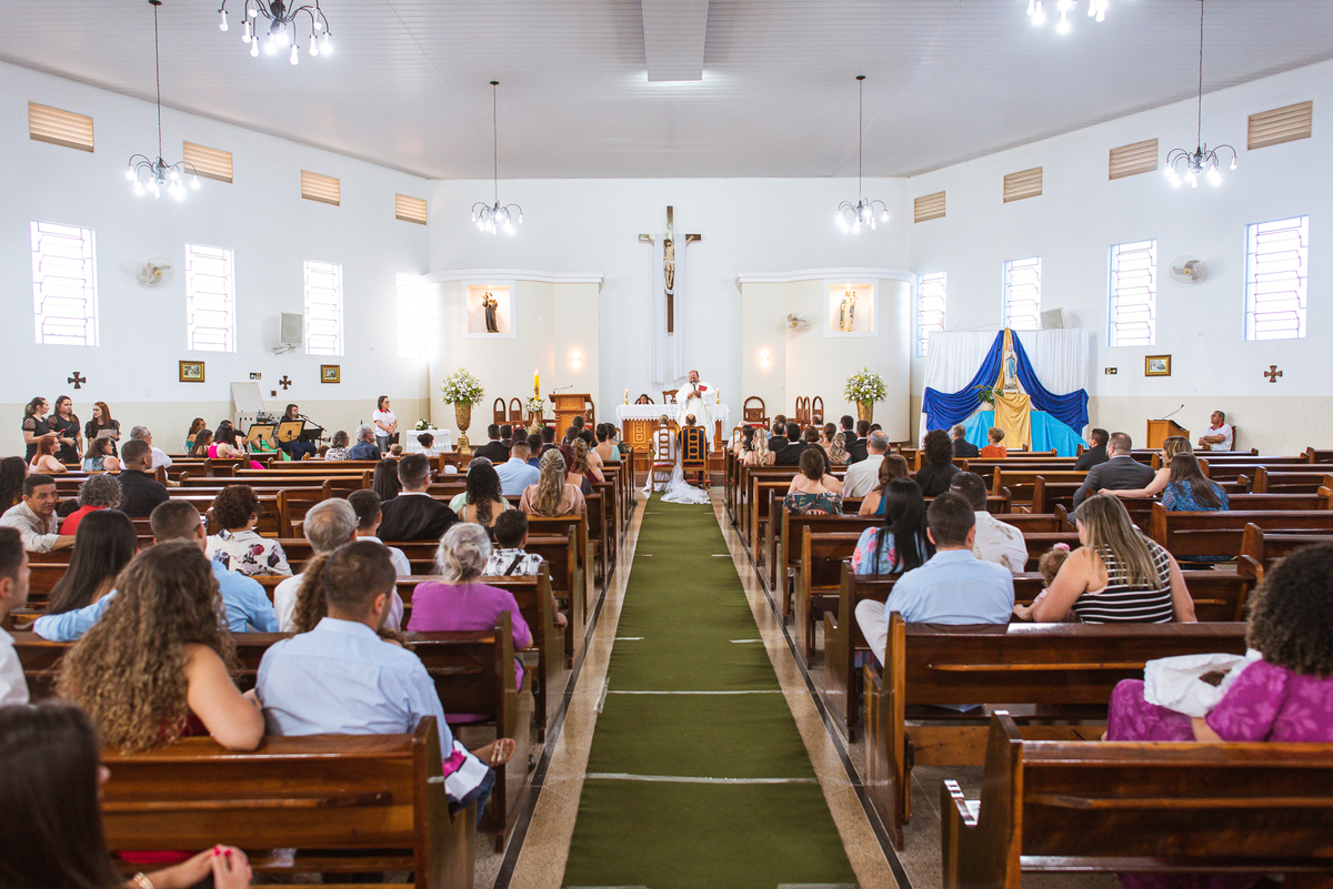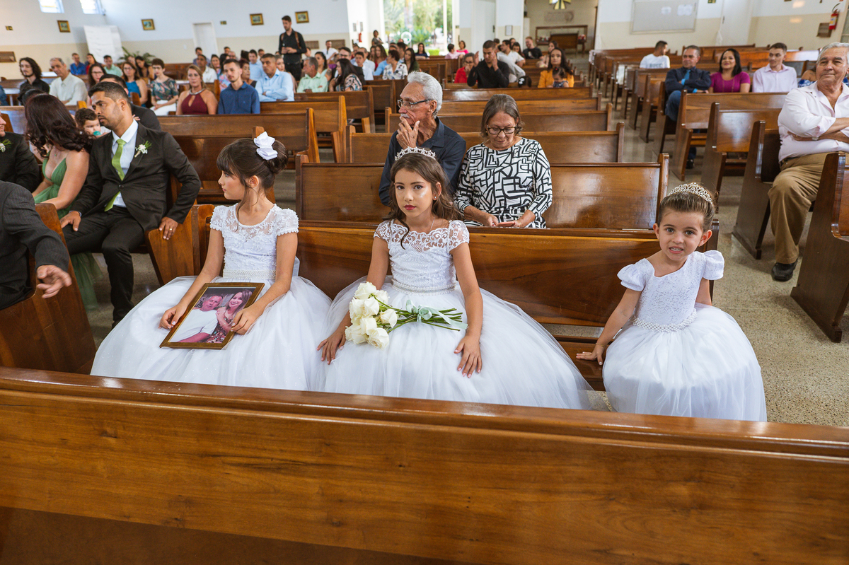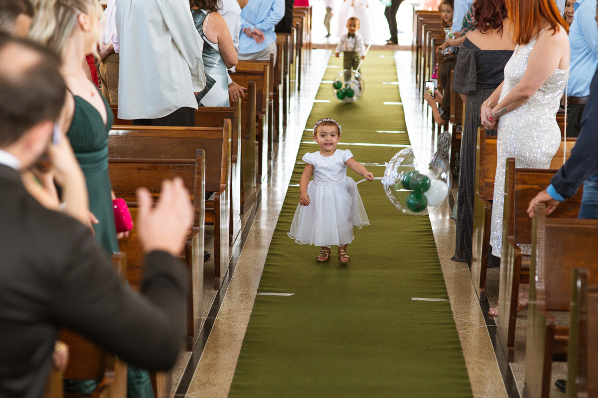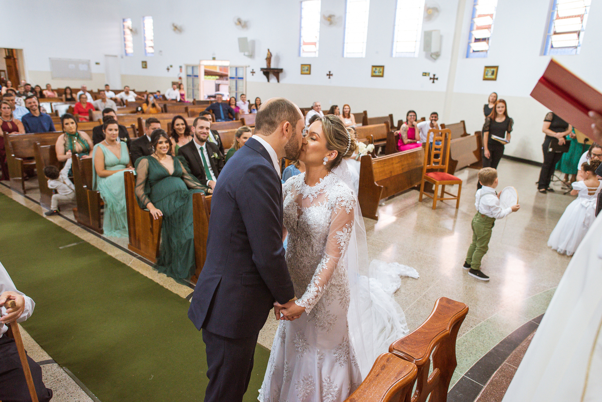 O padre realizou uma cerimônia repleta de momentos divertidos em que os noivos sorriram muito. Ao mesmo tempo, os fez relembrar da fé e de sempre rezarem juntos. Fez questão também de fazer os noivos pedir a bênção e agradecer aos seus pais e aos sogros. Um momento bem divertido foi quando o avô do noivo, do alto dos seus 96 anos de idade, me cutucou com a bengala e me disse: "Esse menino ai é meu neto." Achei tão bonitinho da parte dele. Fazer questão de mostrar o quanto estava feliz com aquele momento. Enfim, os noivos foram abençoados, declarados casados e trocaram as alianças. Após toda a celebração tivemos a saída dos noivos rumo à recepção. Do lado de fora da Igreja, os padrinhos alinhados comemoravam muito a conquista dos recém-casados.