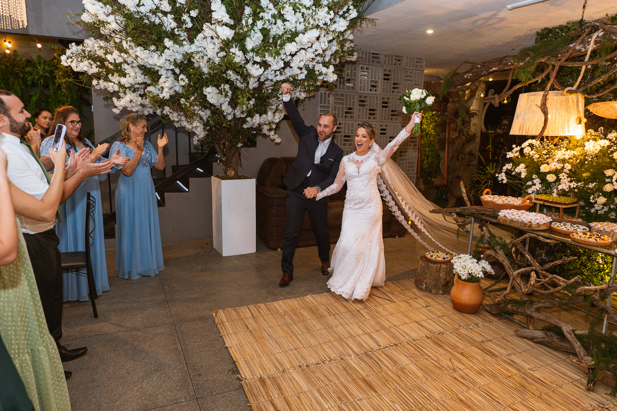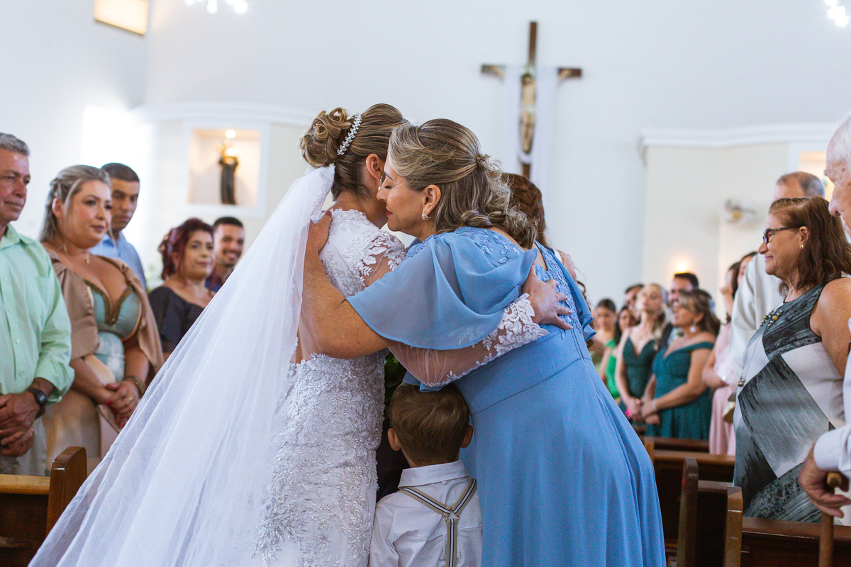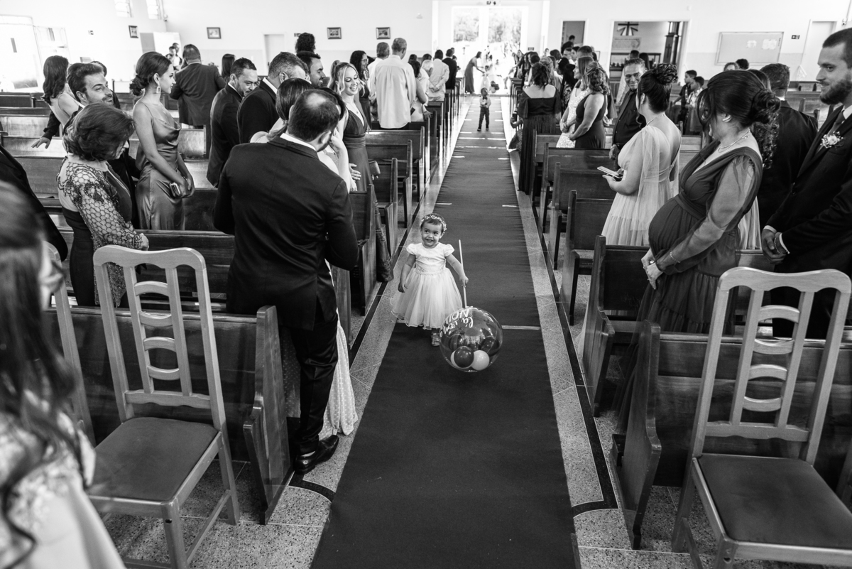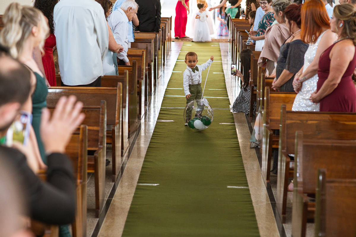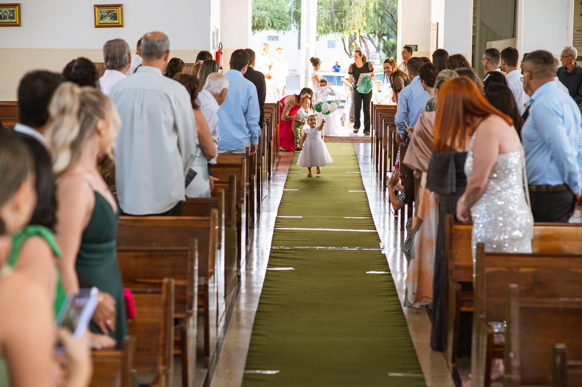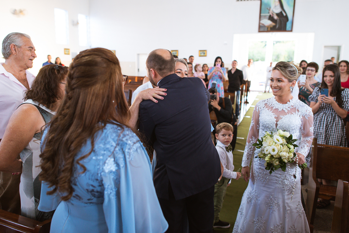 O padre realizou uma cerimônia repleta de momentos divertidos em que os noivos sorriram muito. Ao mesmo tempo, os fez relembrar da fé e de sempre rezarem juntos. Fez questão também de fazer os noivos pedir a bênção e agradecer aos seus pais e aos sogros. Um momento bem divertido foi quando o avô do noivo, do alto dos seus 96 anos de idade, me cutucou com a bengala e me disse: "Esse menino ai é meu neto." Achei tão bonitinho da parte dele. Fazer questão de mostrar o quanto estava feliz com aquele momento. Enfim, os noivos foram abençoados, declarados casados e trocaram as alianças. Após toda a celebração tivemos a saída dos noivos rumo à recepção. Do lado de fora da Igreja, os padrinhos alinhados comemoravam muito a conquista dos recém-casados.