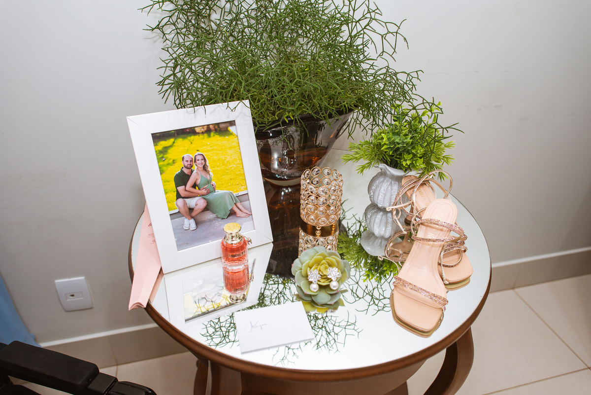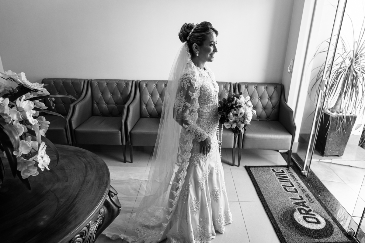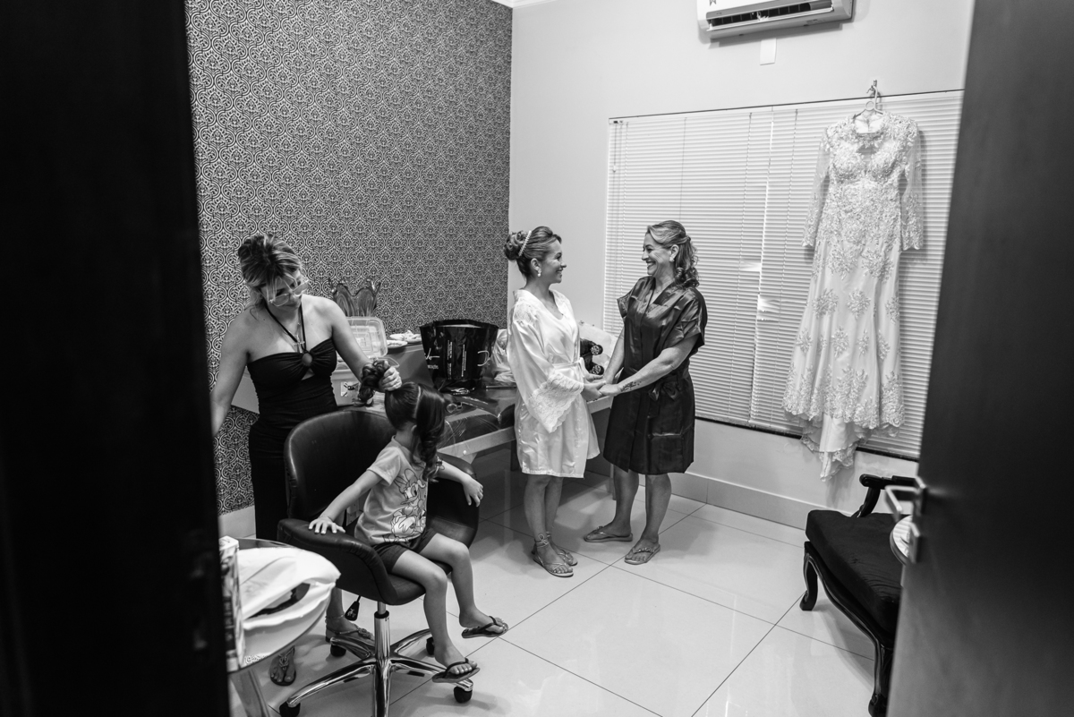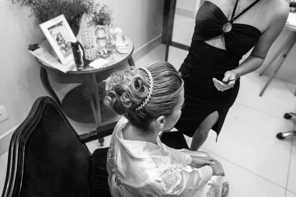 Na parede, o vestido lindo produzido exclusivamente para a noiva. A sua cabelereira dava os últimos ajustes no penteado e a querida Jéssica Make up já havia finalizado a produção. A sua mãe e sogra a acompanharam durante todos os processos. Tivemos também uma presença maravilhosa da daminha, que veio com suas unhas pintadas à francesinha e se preparava para o penteado. Com apenas seus 4 aninhos, ela estava lá toda toda em seu dia de beleza, junto com sua titia noiva. Ao final da produção, era chegada a hora de colocar o vestido. Alguns minutos depois e eis que surge Karyna maravilhosa e impecável em seu vestido prontinha. Faltava pouco para que a cerimônia começasse...