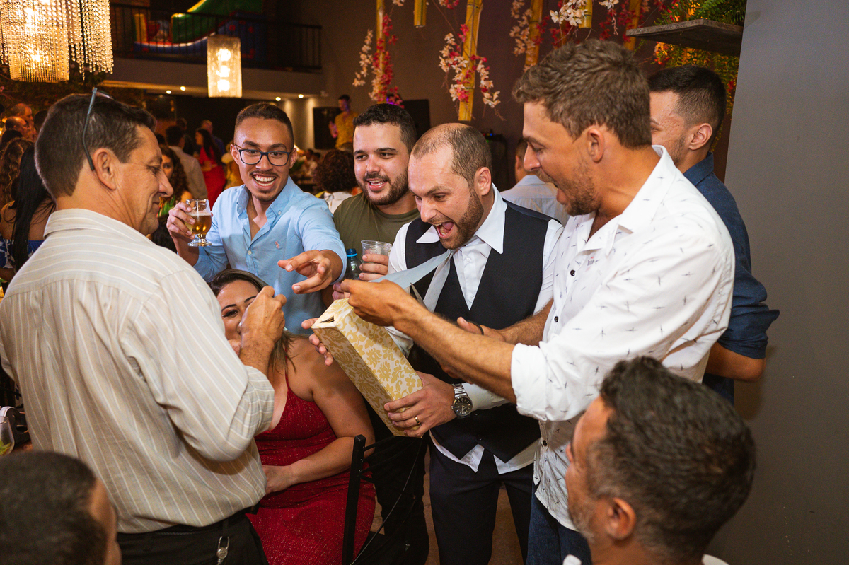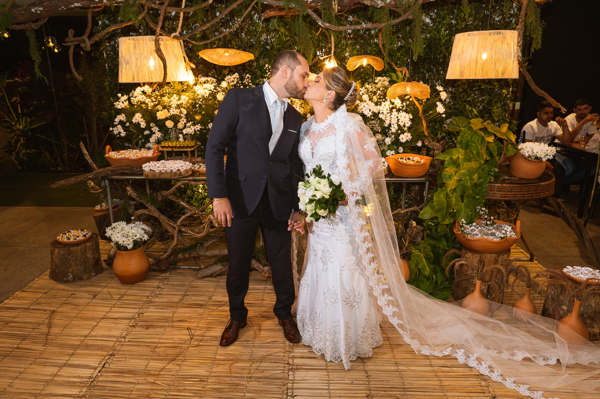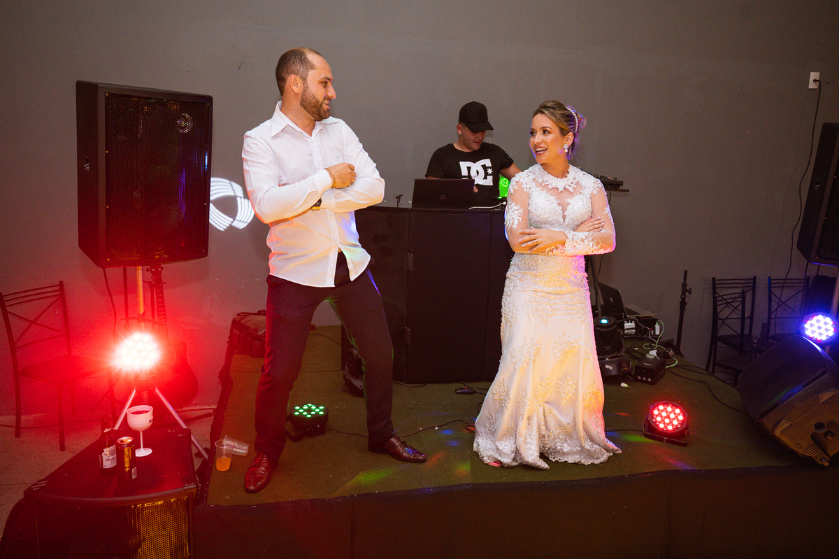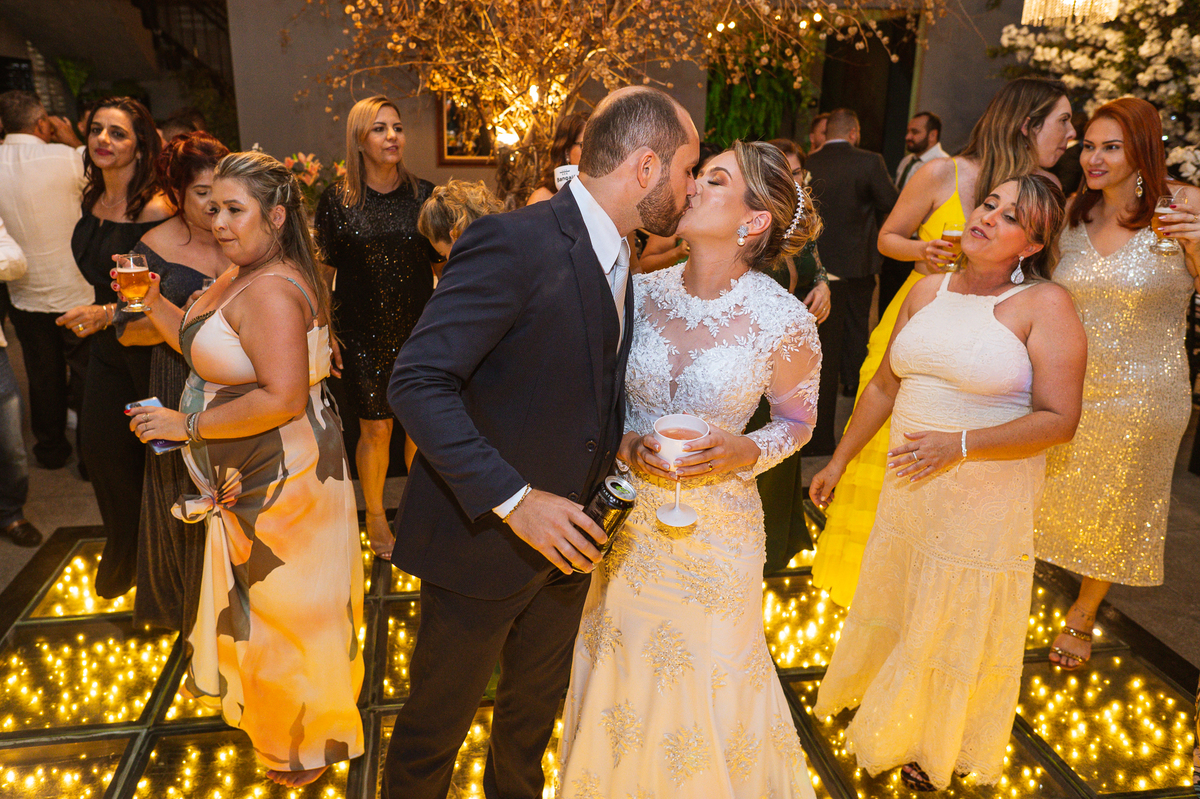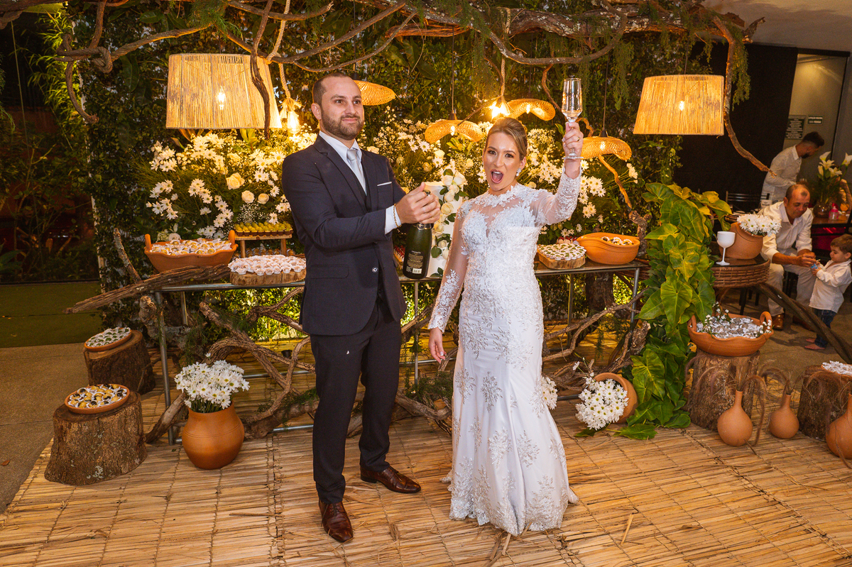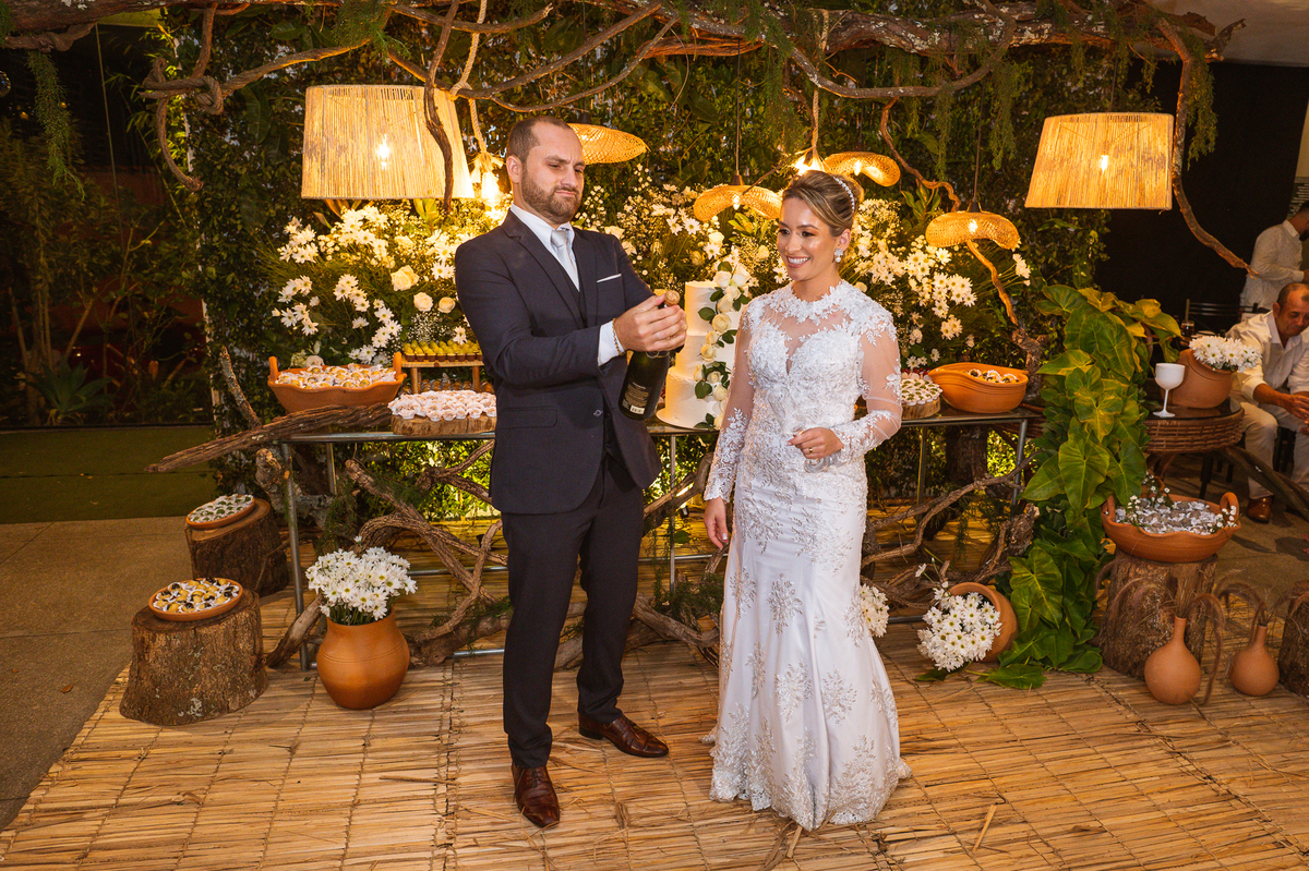 Fizemos um mini ensaio logo após e partimos para a recepção. O local escolhido foi o Bangalô, super aconchegante e bonito. Lá chegando, a decoração chamou a atenção de todos. Tudo muito bem disposto e com um bom gosto incrível. Os noivos foram recepcionados com uma grande festa pelos convidados. Agradeceram a presença de todos e fizeram questão de não perder tempo e caíram na pista de dança. O avô do noivo, sim aquele de 96 anos de idade, deu um show! Fez questão de pedir o microfone ao cantor e cantou junto com ele algumas músicas. Todos que estiveram ali ficaram muito felizes. Os noivos ainda passaram a gravata e o sapatinho e depois curtiram todo o restante da festa com exaustão. Encerramos nossa participação nesse dia com a certeza do nosso dever cumprido e os cartões repletos de fotografias inesquecíveis.