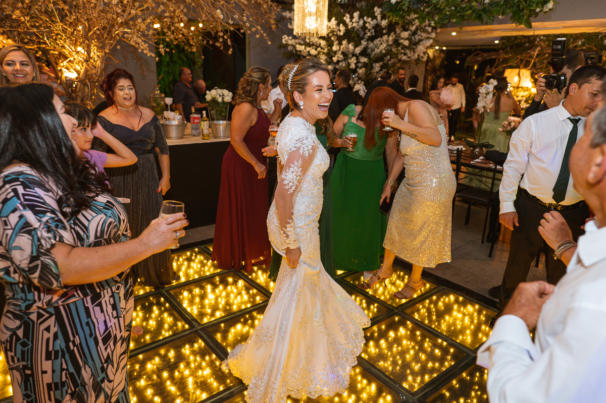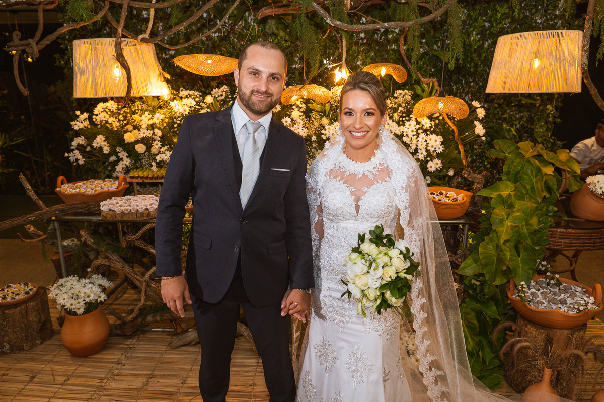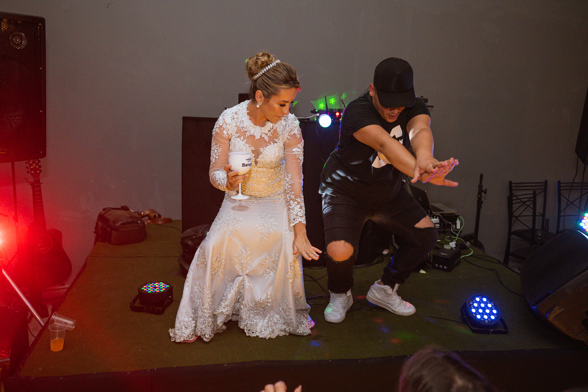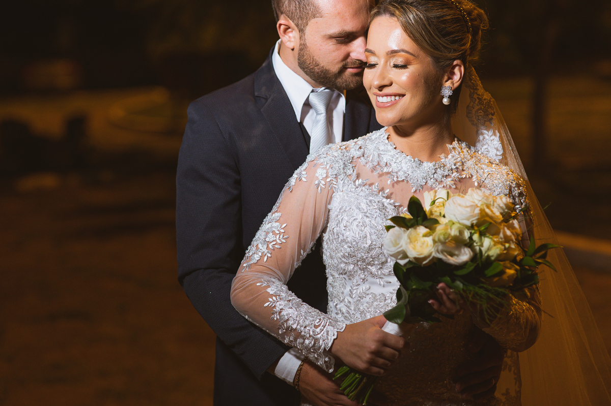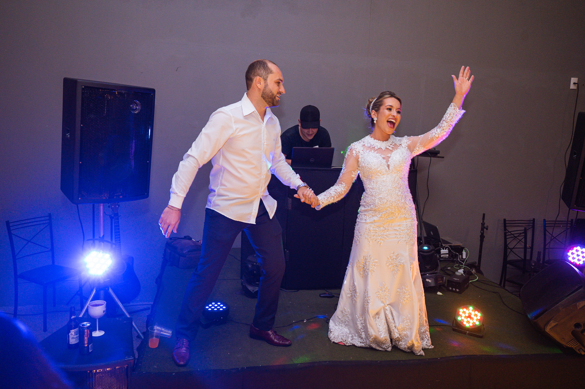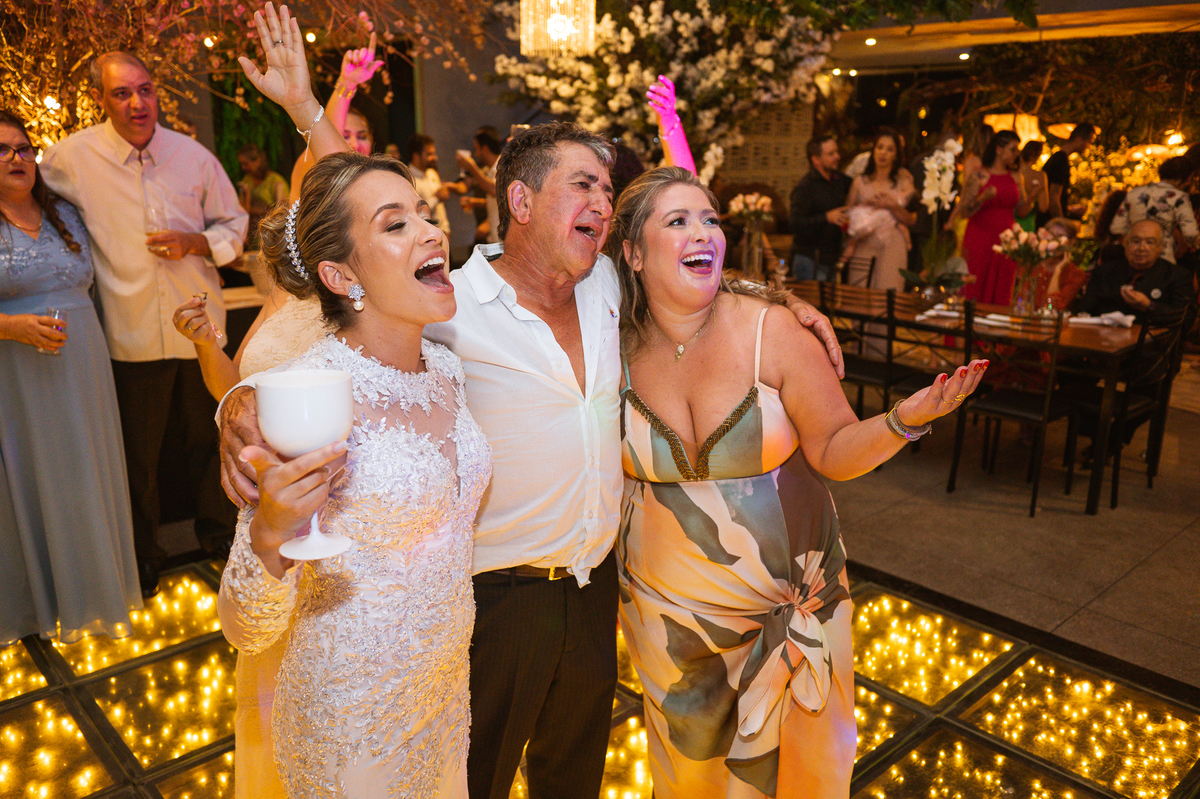 Fizemos um mini ensaio logo após e partimos para a recepção. O local escolhido foi o Bangalô, super aconchegante e bonito. Lá chegando, a decoração chamou a atenção de todos. Tudo muito bem disposto e com um bom gosto incrível. Os noivos foram recepcionados com uma grande festa pelos convidados. Agradeceram a presença de todos e fizeram questão de não perder tempo e caíram na pista de dança. O avô do noivo, sim aquele de 96 anos de idade, deu um show! Fez questão de pedir o microfone ao cantor e cantou junto com ele algumas músicas. Todos que estiveram ali ficaram muito felizes. Os noivos ainda passaram a gravata e o sapatinho e depois curtiram todo o restante da festa com exaustão. Encerramos nossa participação nesse dia com a certeza do nosso dever cumprido e os cartões repletos de fotografias inesquecíveis.