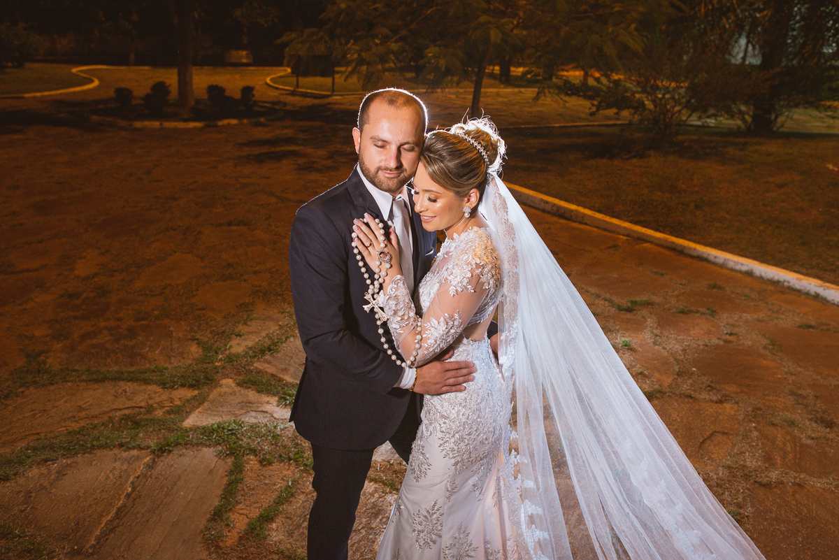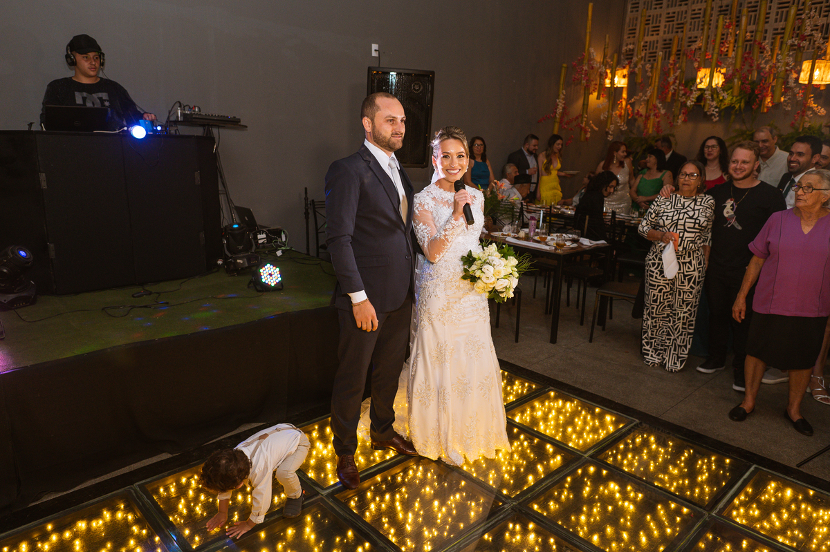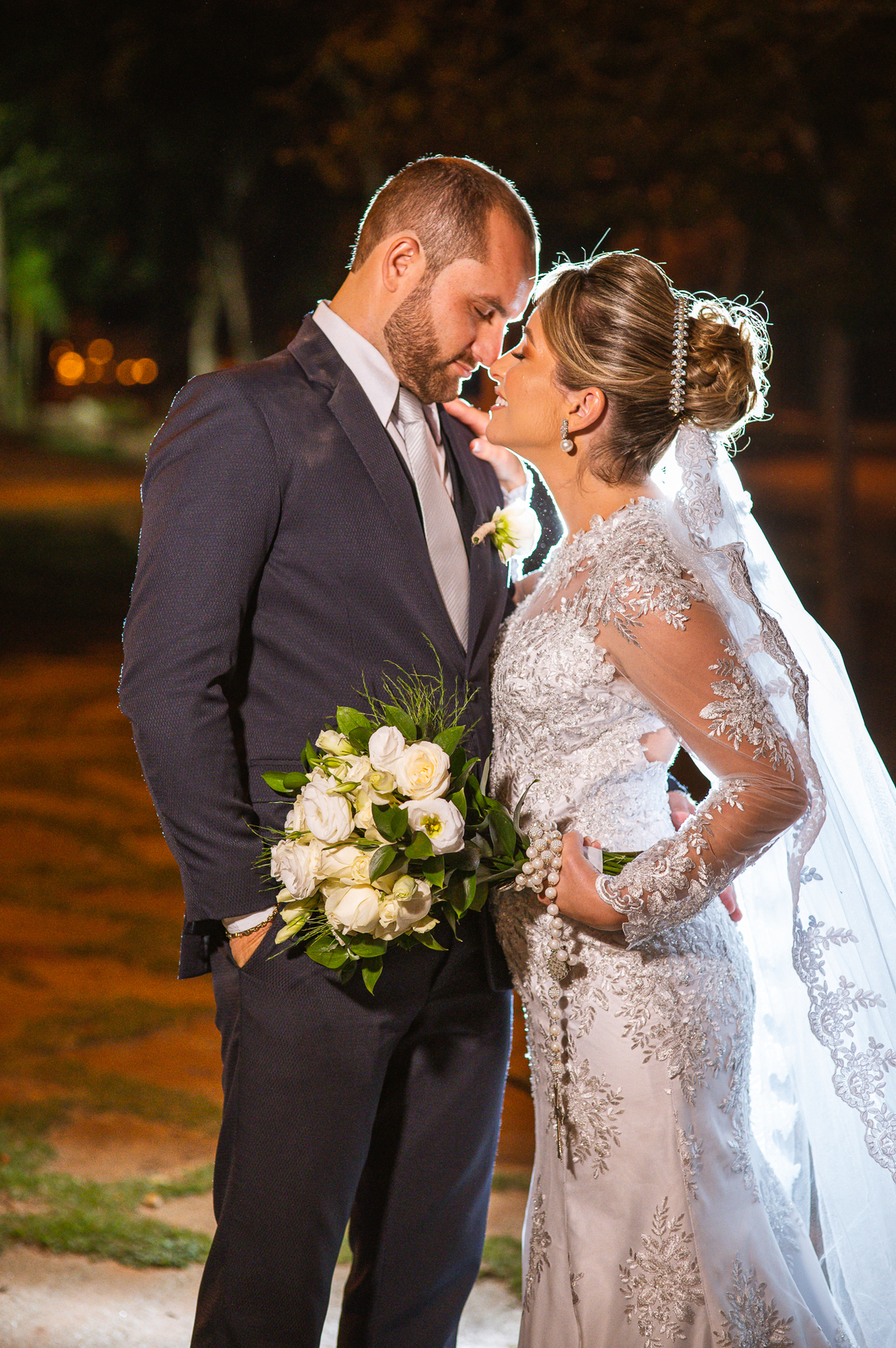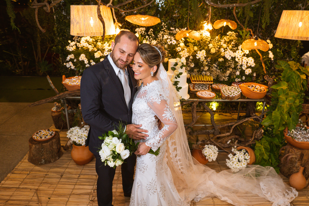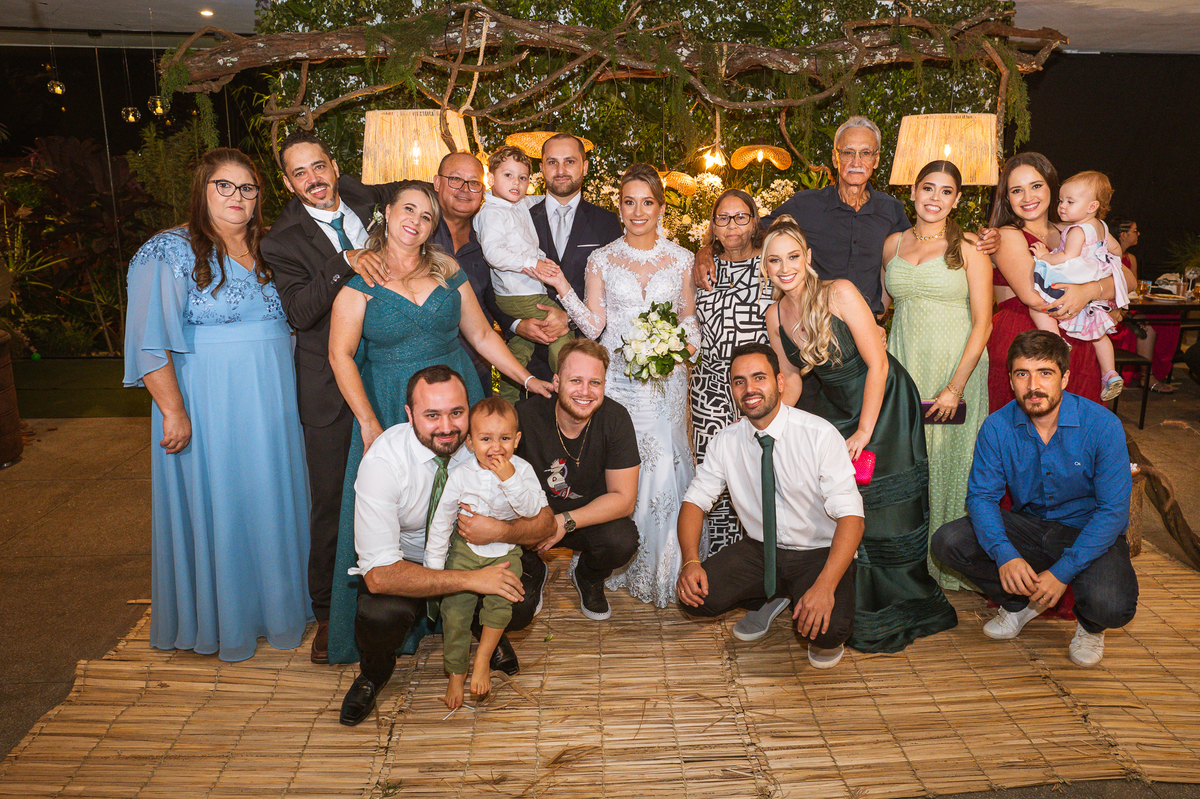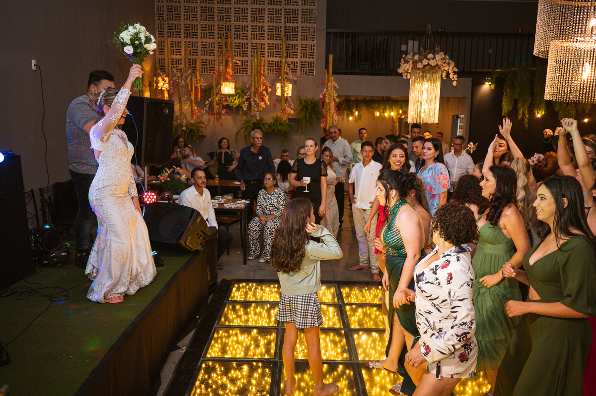 Fizemos um mini ensaio logo após e partimos para a recepção. O local escolhido foi o Bangalô, super aconchegante e bonito. Lá chegando, a decoração chamou a atenção de todos. Tudo muito bem disposto e com um bom gosto incrível. Os noivos foram recepcionados com uma grande festa pelos convidados. Agradeceram a presença de todos e fizeram questão de não perder tempo e caíram na pista de dança. O avô do noivo, sim aquele de 96 anos de idade, deu um show! Fez questão de pedir o microfone ao cantor e cantou junto com ele algumas músicas. Todos que estiveram ali ficaram muito felizes. Os noivos ainda passaram a gravata e o sapatinho e depois curtiram todo o restante da festa com exaustão. Encerramos nossa participação nesse dia com a certeza do nosso dever cumprido e os cartões repletos de fotografias inesquecíveis.