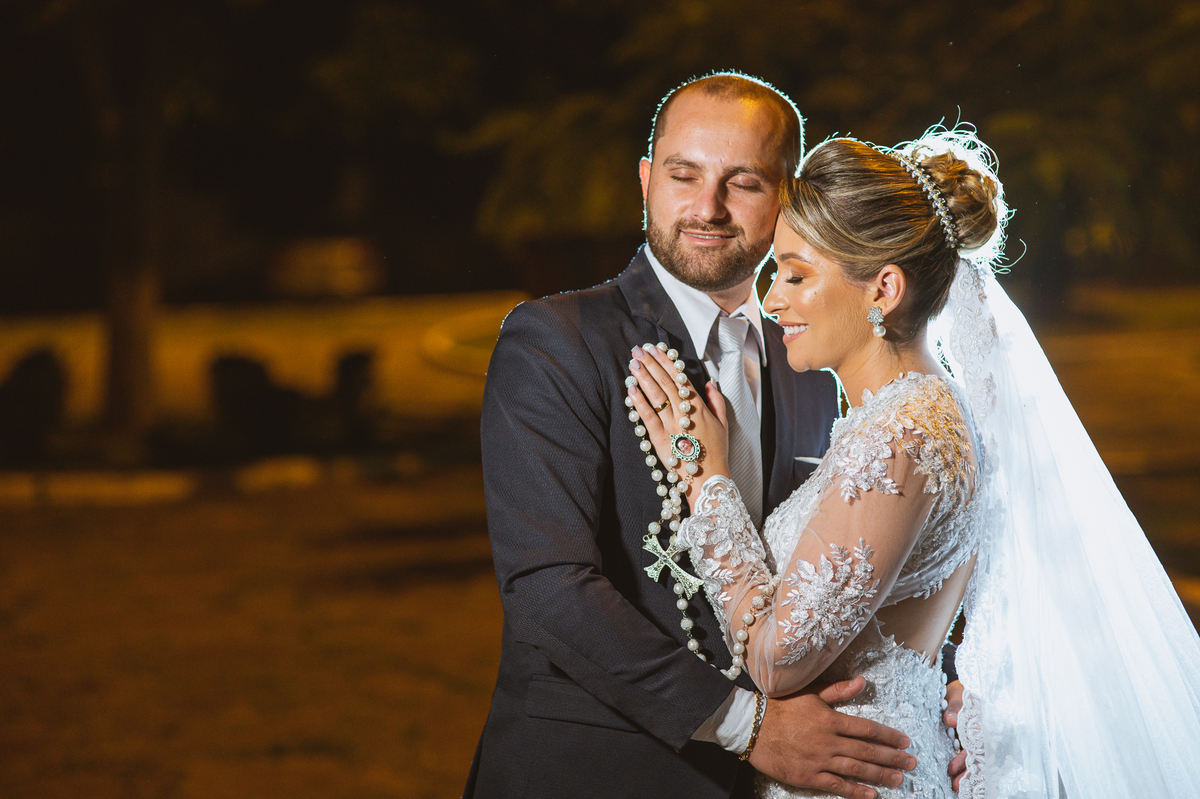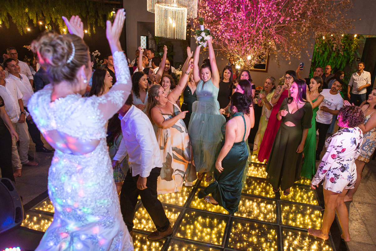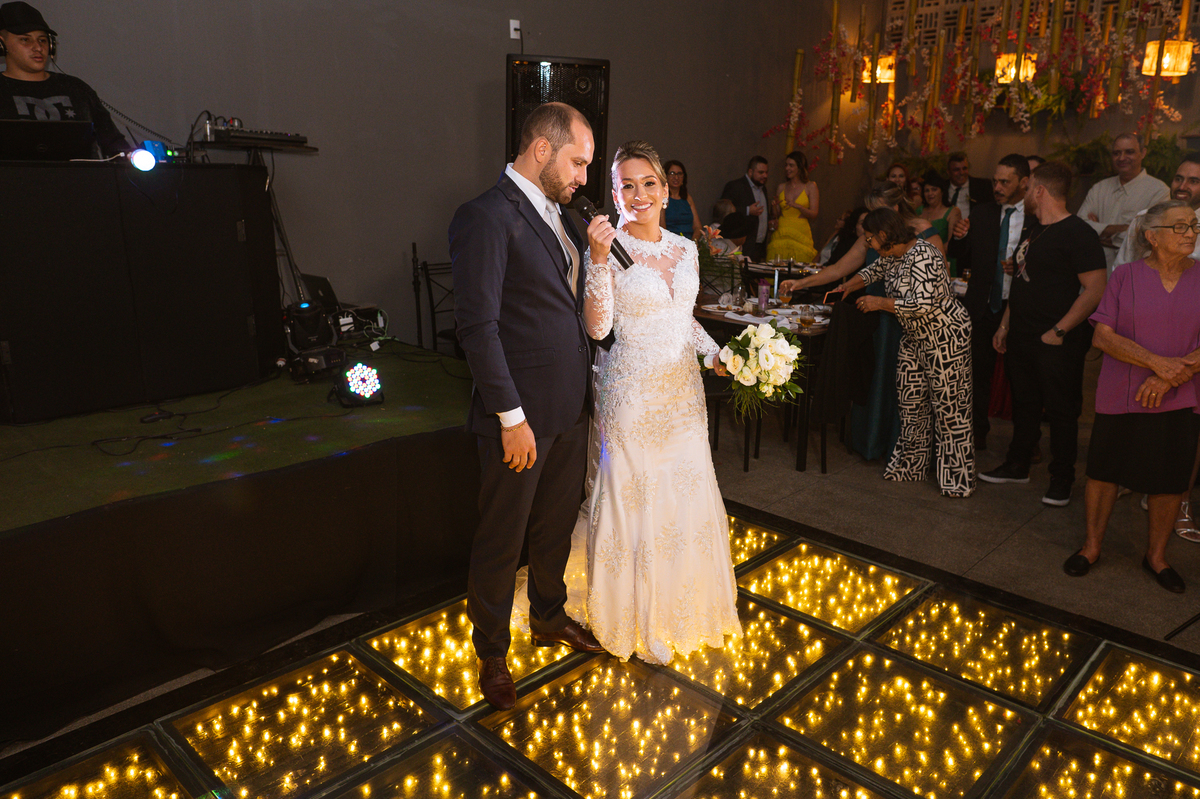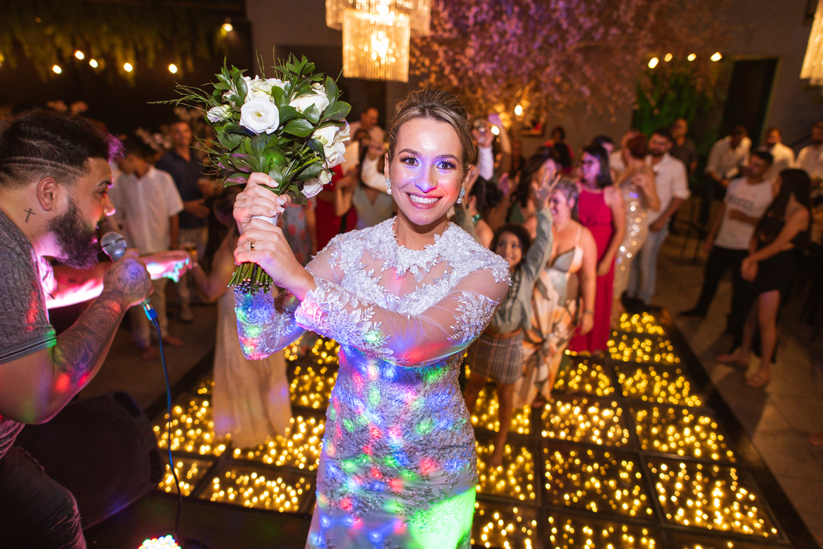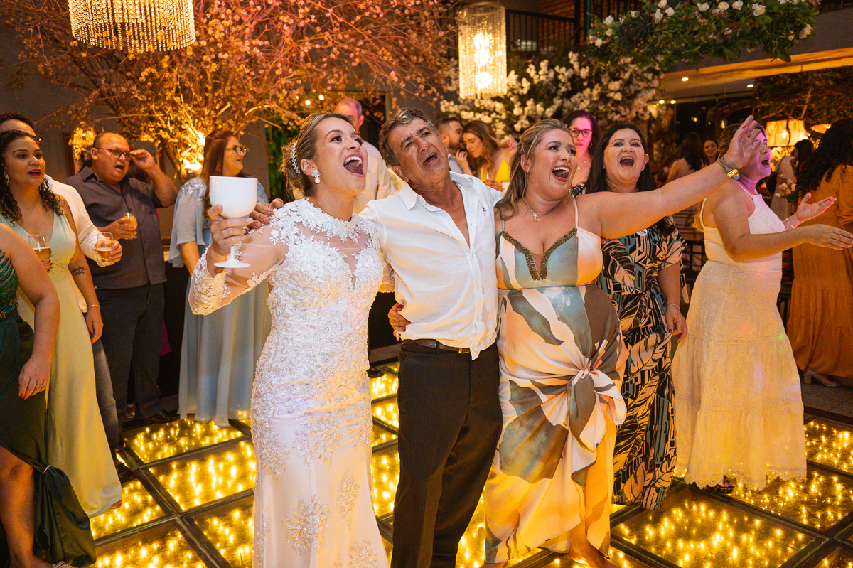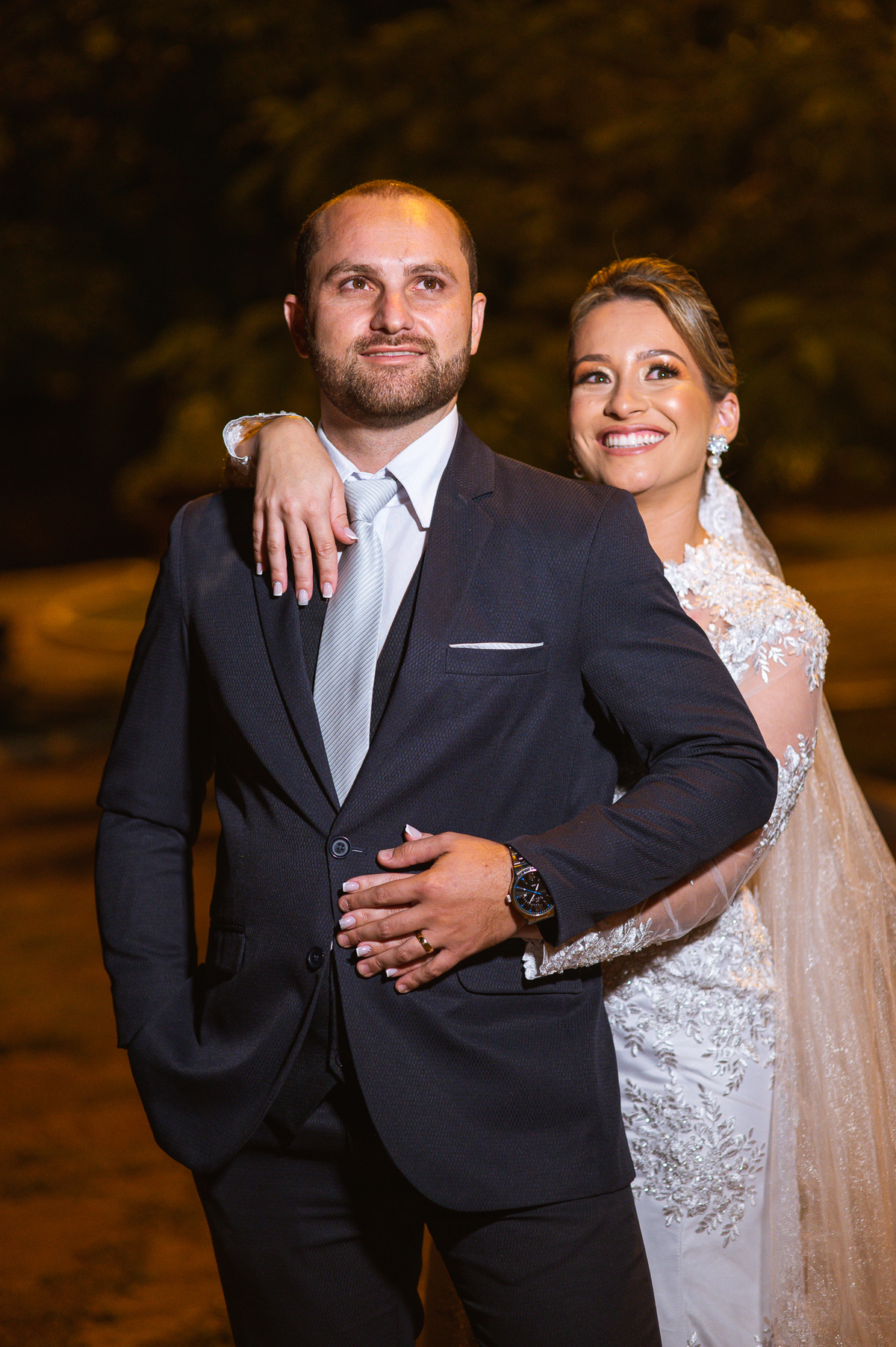 Fizemos um mini ensaio logo após e partimos para a recepção. O local escolhido foi o Bangalô, super aconchegante e bonito. Lá chegando, a decoração chamou a atenção de todos. Tudo muito bem disposto e com um bom gosto incrível. Os noivos foram recepcionados com uma grande festa pelos convidados. Agradeceram a presença de todos e fizeram questão de não perder tempo e caíram na pista de dança. O avô do noivo, sim aquele de 96 anos de idade, deu um show! Fez questão de pedir o microfone ao cantor e cantou junto com ele algumas músicas. Todos que estiveram ali ficaram muito felizes. Os noivos ainda passaram a gravata e o sapatinho e depois curtiram todo o restante da festa com exaustão. Encerramos nossa participação nesse dia com a certeza do nosso dever cumprido e os cartões repletos de fotografias inesquecíveis.