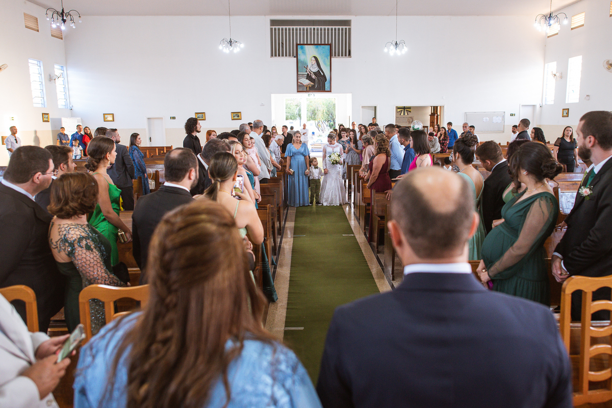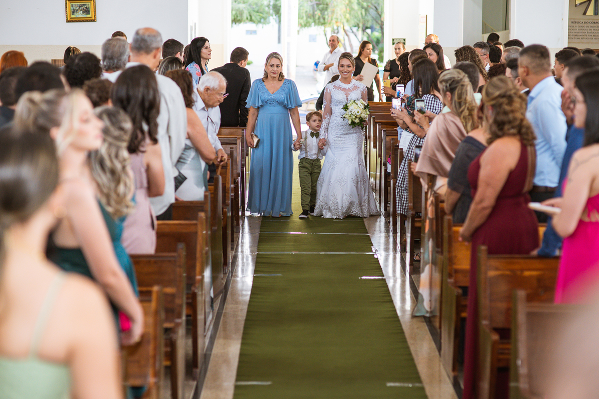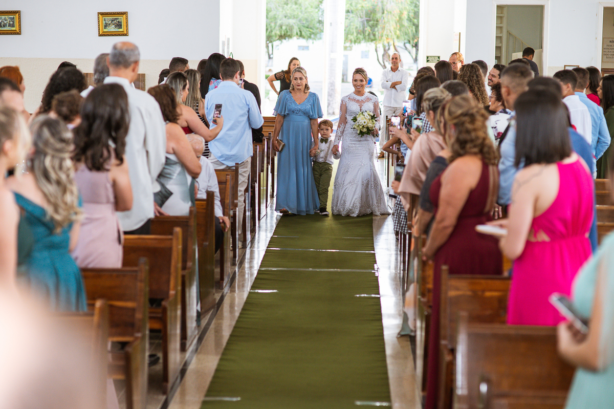 Começamos com a entrada da florista e logo atrás veio o noivo juntamente com sua mãe. O pai do noivo e a avó da noiva vieram a seguir. Posteriormente, todos os outros padrinhos e pajens. Nesse momento, as portas do local foram fechadas e o coração de todos se voltou para a reação do noivo e a entrada da noiva. E do lado de fora da porta, Karyna estava com sua mãe e seu filhinho Felipe a poucos segundos de encontrar com o seu noivo. A porta de abriu e finalmente agora elas caminhariam para o encontro final com o seu noivo. Kessy completou o caminho até o meio do corredor onde abraçou e se despediu de sua mãe e sogra. Encontrou com sua amada noiva e a beijou respeitosamente como forma de selar aquele momento. Agora juntos, eles partiram para receber a bênção de Deus sobre o seu casamento e suas vidas.