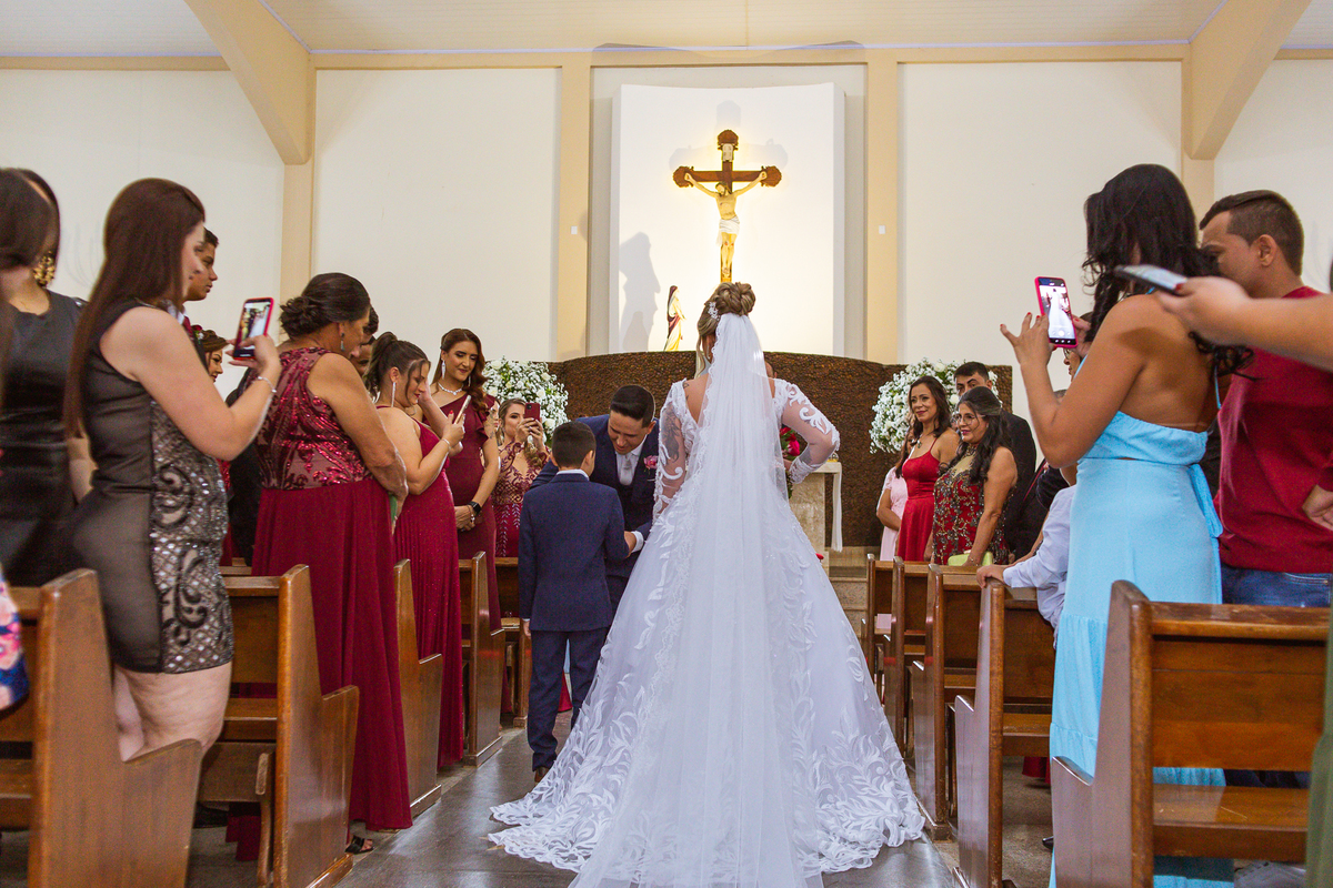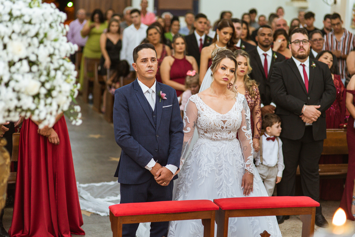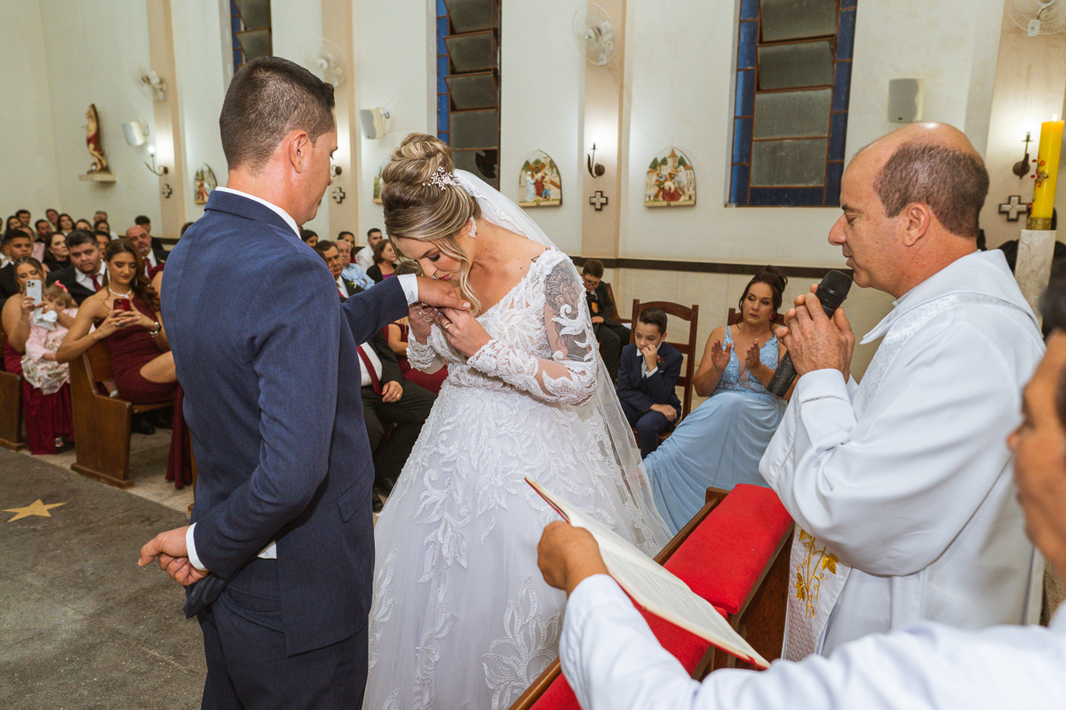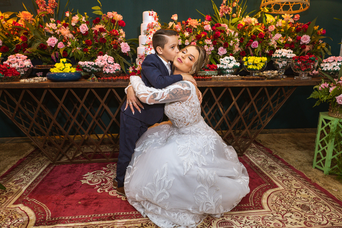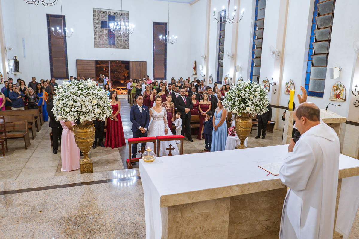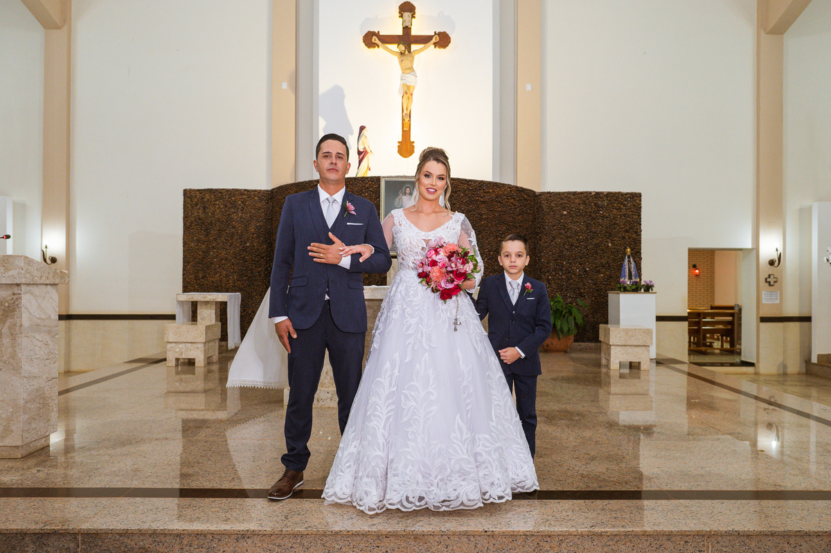 Bruna, agora de mãos dadas com seu filho, caminhou rumo ao encontro do seu noivo. Os dois caminharam lentamente, desfilando e curtindo aquele momento super especial. Agora, frente a frente com Edwards, ele fez questão de cumprimentar seu enteado, despedir-se dele e só depois receber a mão de sua noiva. Após um beijo respeitoso na testa, os dois caminharam juntinhos rumo ao altar, para receber ali a bênção de Deus sobre o casamento dos dois. A celebração foi rápida e edificante. Os noivos fizeram seus votos e juras de amor, tiveram as alianças abençoadas e também foram abençoados, trocaram as alianças e foram declarados casados perante Deus e as testemunhas que ali estavam.