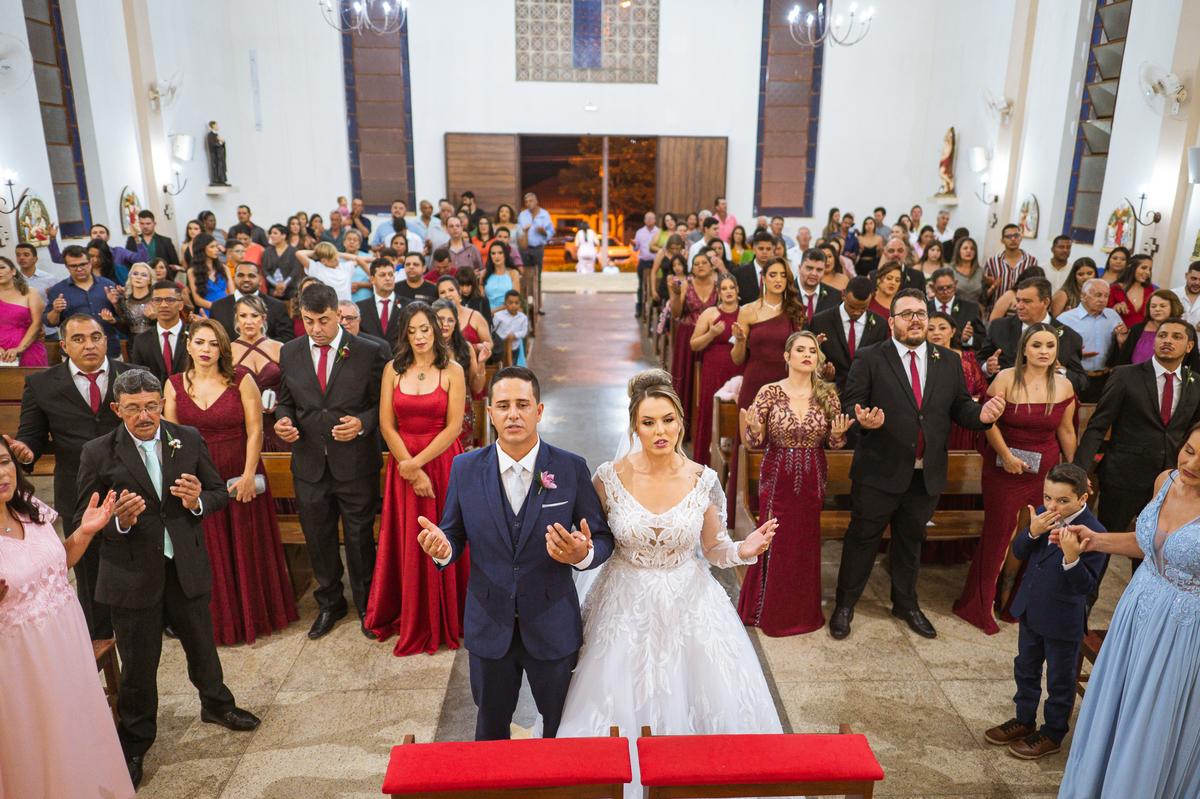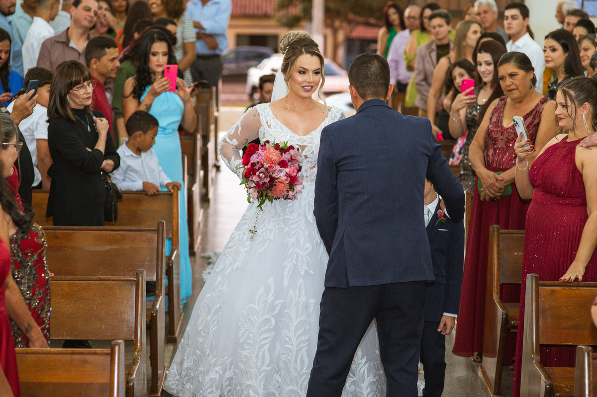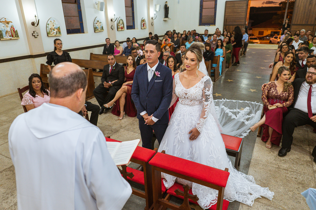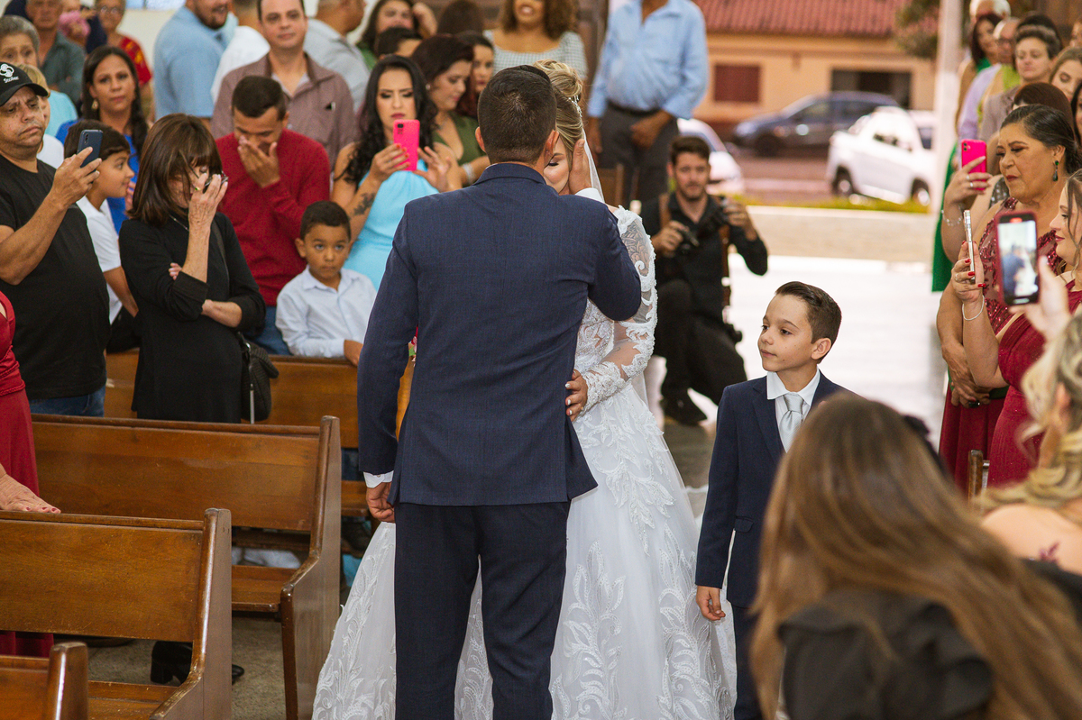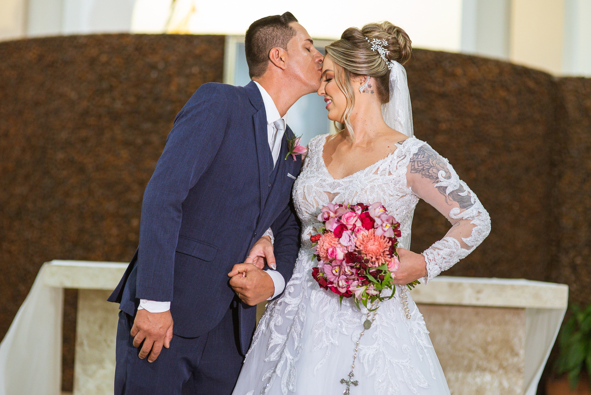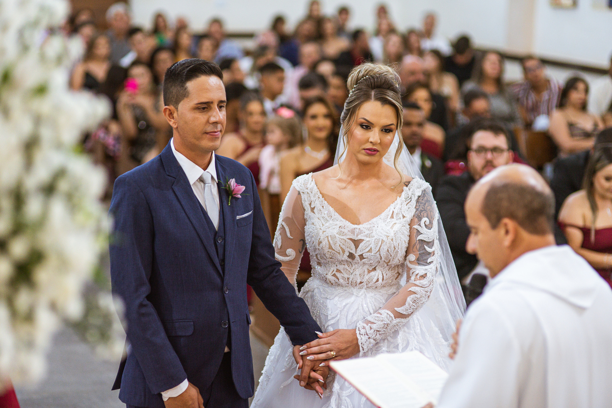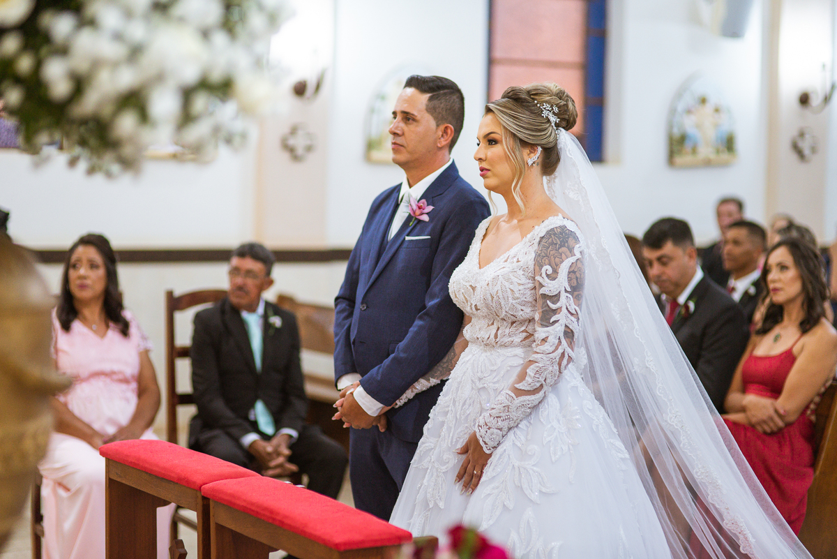 Bruna, agora de mãos dadas com seu filho, caminhou rumo ao encontro do seu noivo. Os dois caminharam lentamente, desfilando e curtindo aquele momento super especial. Agora, frente a frente com Edwards, ele fez questão de cumprimentar seu enteado, despedir-se dele e só depois receber a mão de sua noiva. Após um beijo respeitoso na testa, os dois caminharam juntinhos rumo ao altar, para receber ali a bênção de Deus sobre o casamento dos dois. A celebração foi rápida e edificante. Os noivos fizeram seus votos e juras de amor, tiveram as alianças abençoadas e também foram abençoados, trocaram as alianças e foram declarados casados perante Deus e as testemunhas que ali estavam.