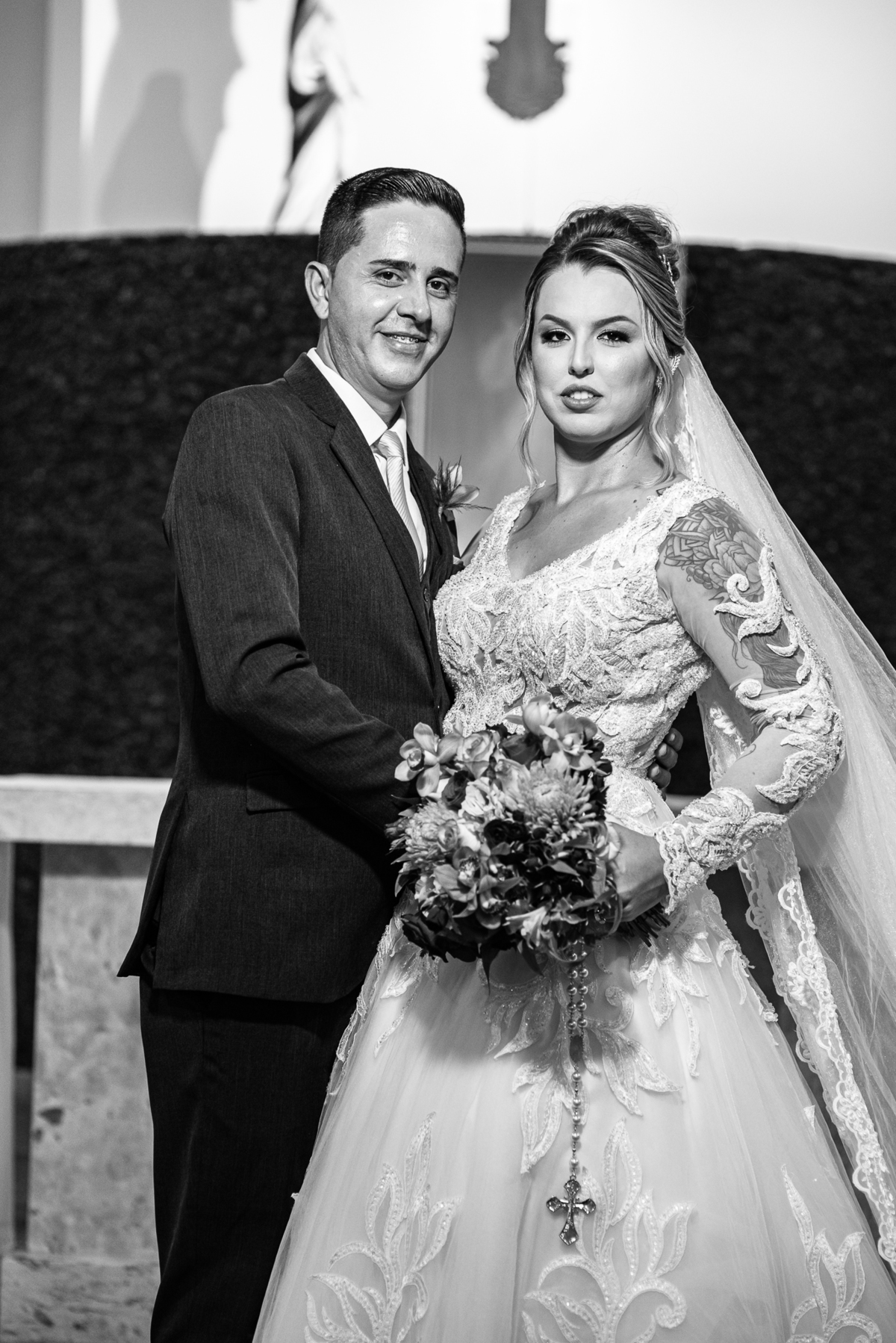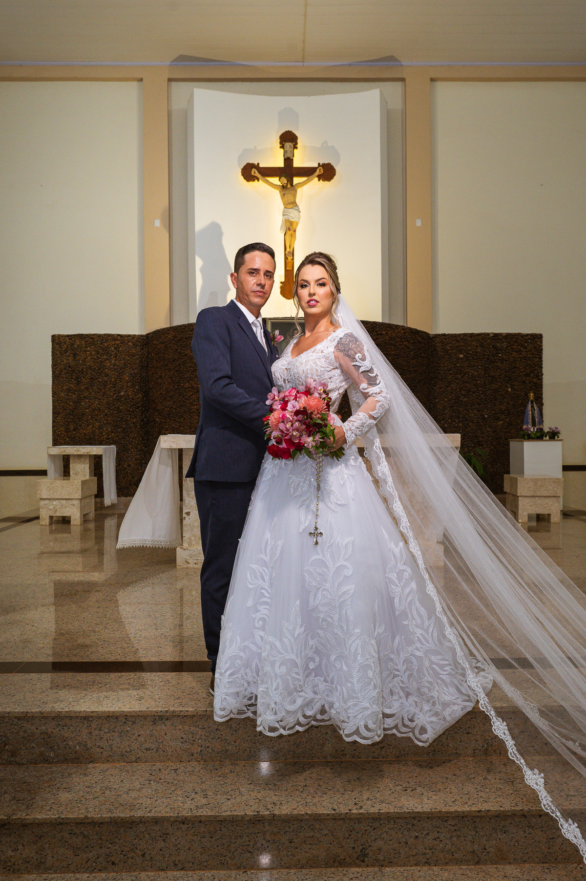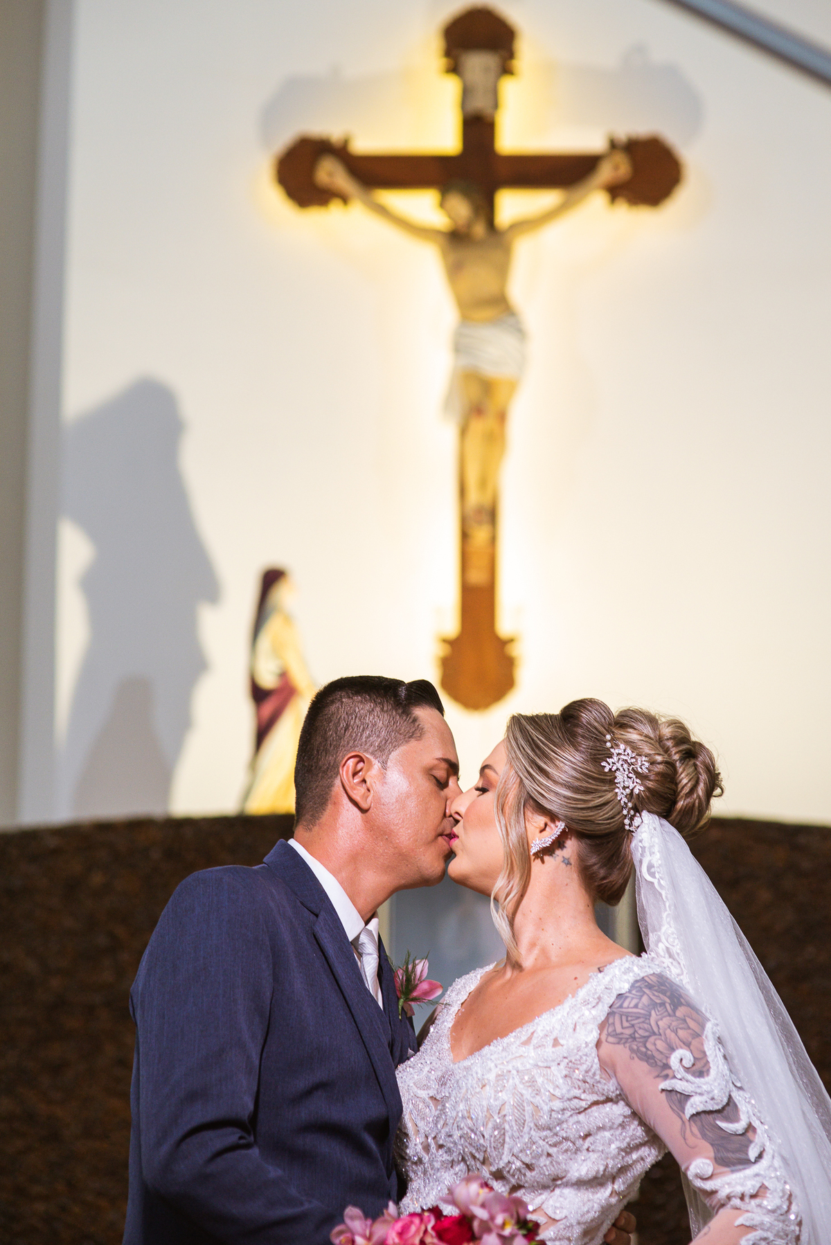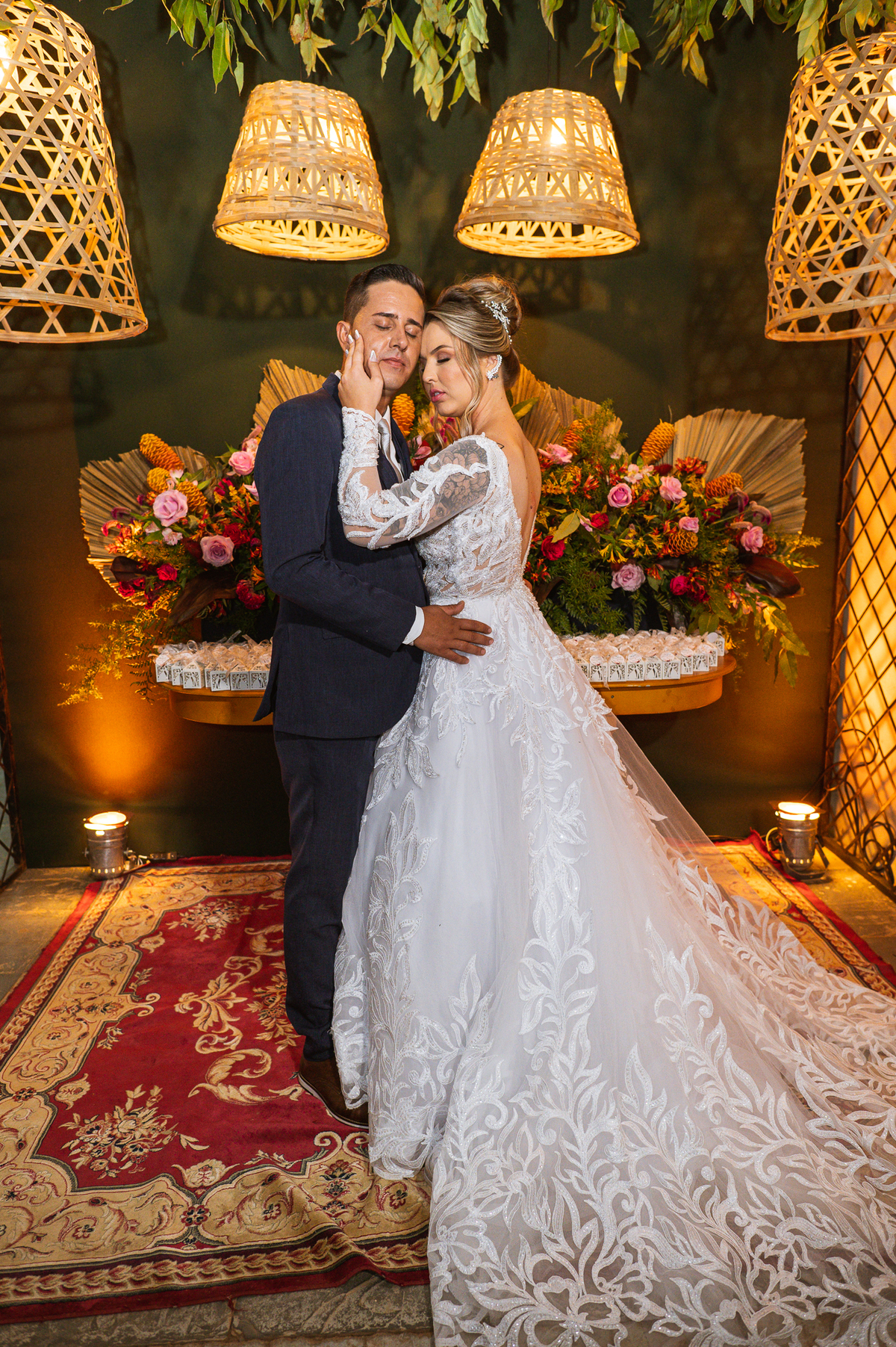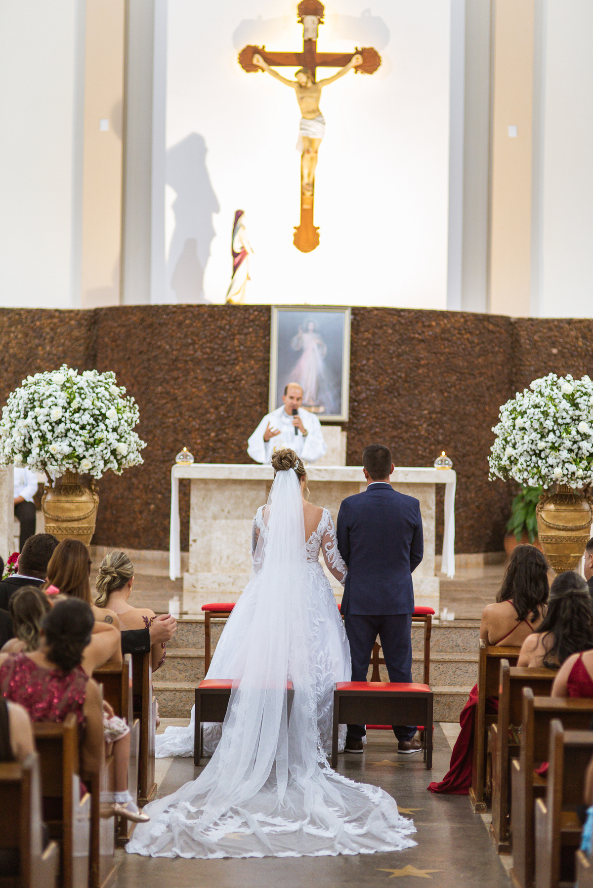 Bruna, agora de mãos dadas com seu filho, caminhou rumo ao encontro do seu noivo. Os dois caminharam lentamente, desfilando e curtindo aquele momento super especial. Agora, frente a frente com Edwards, ele fez questão de cumprimentar seu enteado, despedir-se dele e só depois receber a mão de sua noiva. Após um beijo respeitoso na testa, os dois caminharam juntinhos rumo ao altar, para receber ali a bênção de Deus sobre o casamento dos dois. A celebração foi rápida e edificante. Os noivos fizeram seus votos e juras de amor, tiveram as alianças abençoadas e também foram abençoados, trocaram as alianças e foram declarados casados perante Deus e as testemunhas que ali estavam.