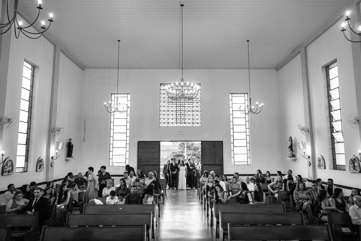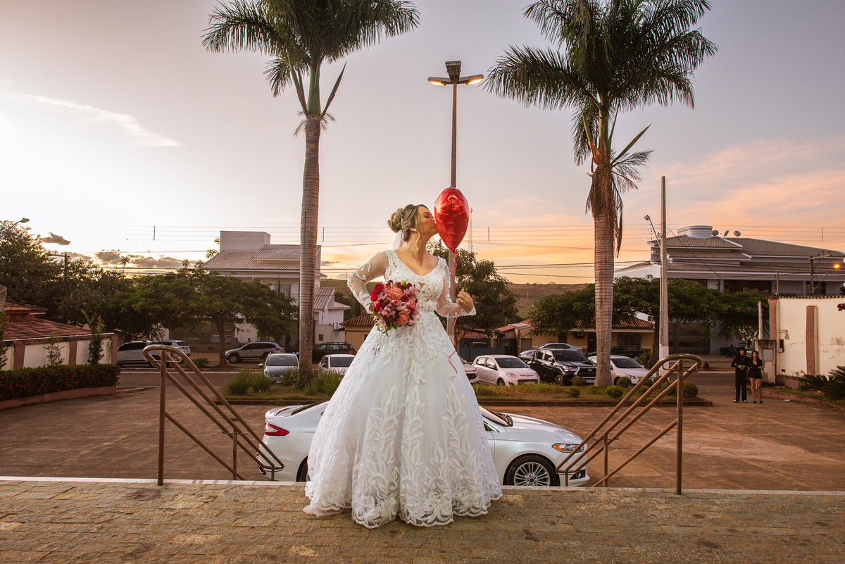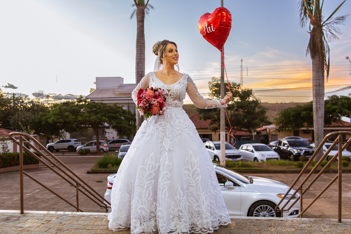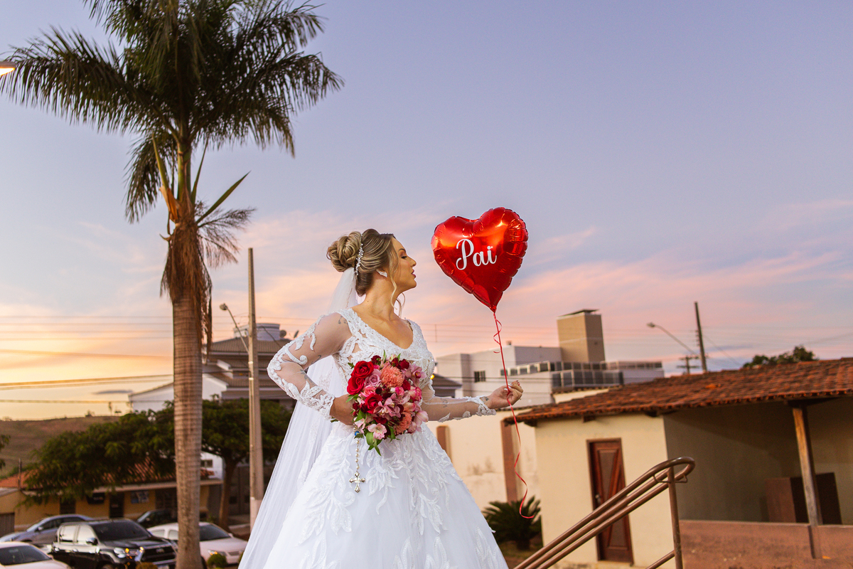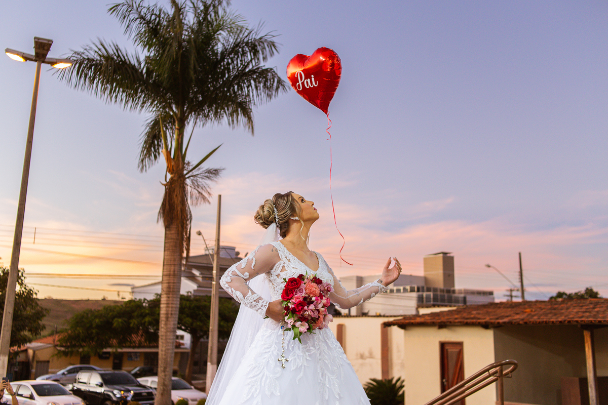 Bruna preparou uma homenagem linda para seu pai. Era surpresa pra todos. Enquanto o noivo entrava e os padrinhos iam se acomodando, os pajens também entraram. Quando as portas da Igreja se fecharam, ela organizou a surpresa. Com um balão em formato de coração e com a escrita "PAI" nele, as portas se abriram e ela diante de todos beijou o balão como se representasse ali a presença de seu Pai. Após o beijo, ela soltou o balão como forma de despedida e como se lá de cima ele estivesse olhando e sorrindo pra ela. Por mais singelo que possa parecer esse ato, ele representou muito e emocionou à todos os presentes, incluindo o fotógrafo. Quando virei pra olhar a reação do noivo, vi tantos rostos emocionados que mal poderia contar.