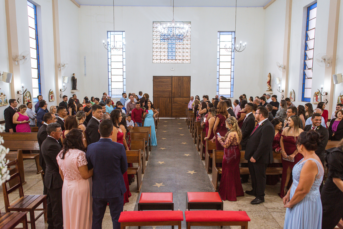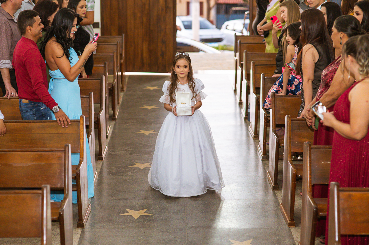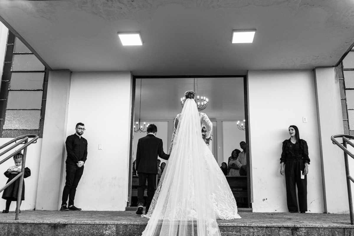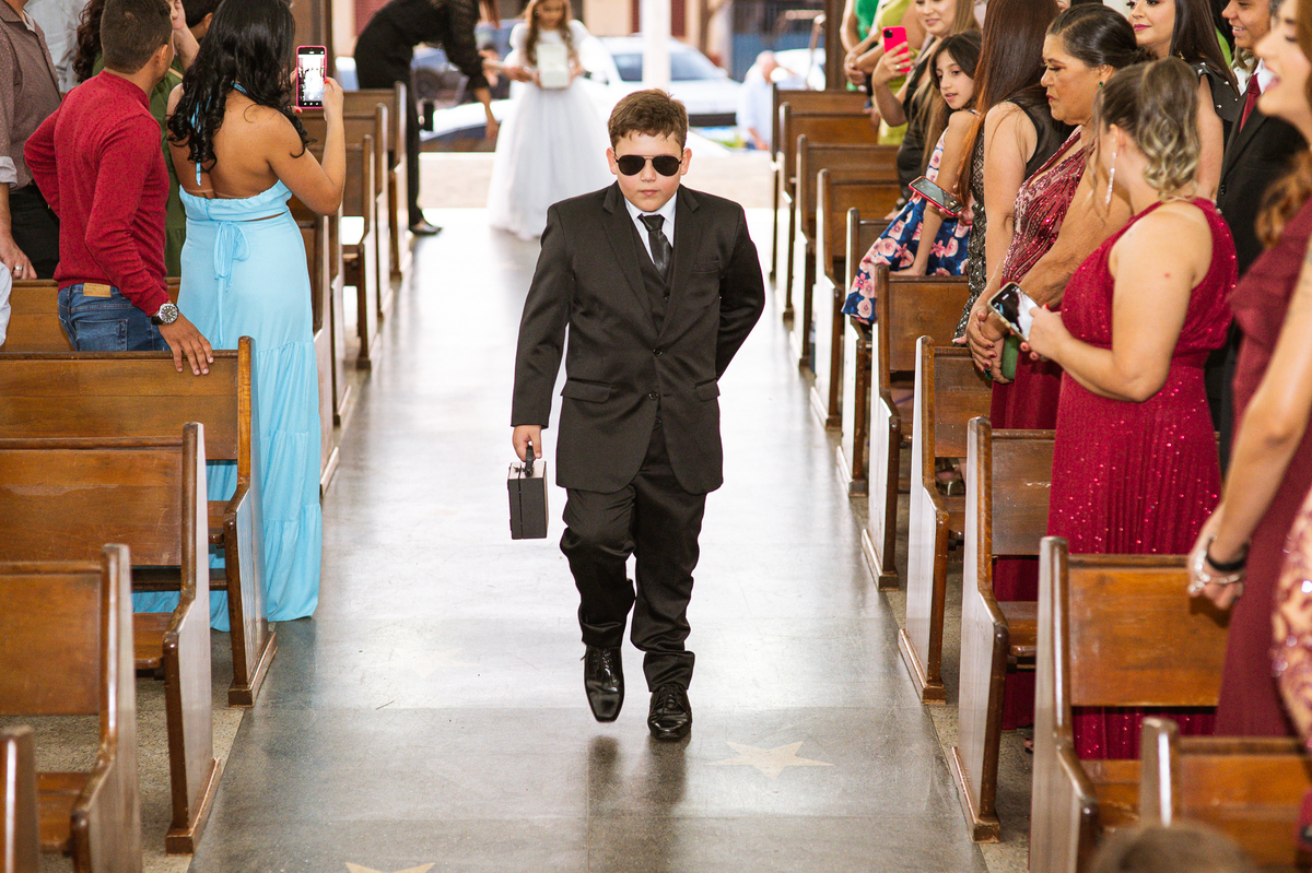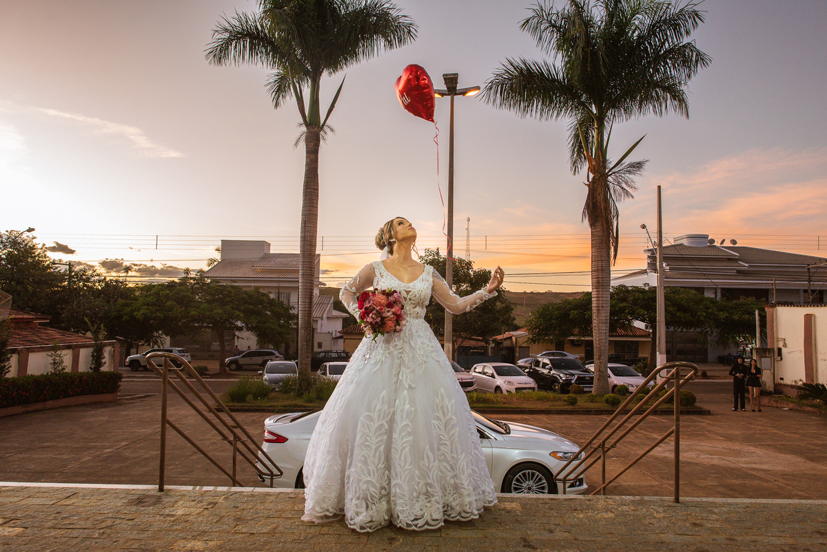 Bruna preparou uma homenagem linda para seu pai. Era surpresa pra todos. Enquanto o noivo entrava e os padrinhos iam se acomodando, os pajens também entraram. Quando as portas da Igreja se fecharam, ela organizou a surpresa. Com um balão em formato de coração e com a escrita "PAI" nele, as portas se abriram e ela diante de todos beijou o balão como se representasse ali a presença de seu Pai. Após o beijo, ela soltou o balão como forma de despedida e como se lá de cima ele estivesse olhando e sorrindo pra ela. Por mais singelo que possa parecer esse ato, ele representou muito e emocionou à todos os presentes, incluindo o fotógrafo. Quando virei pra olhar a reação do noivo, vi tantos rostos emocionados que mal poderia contar.