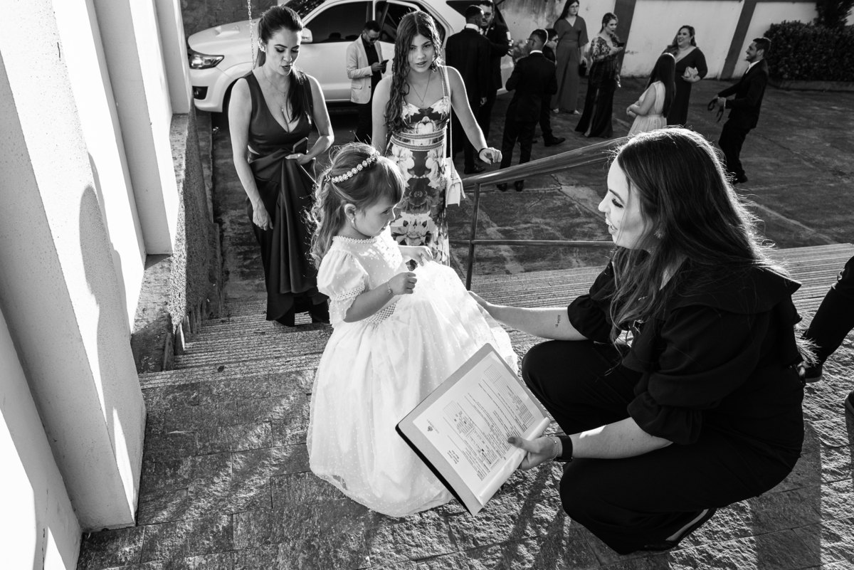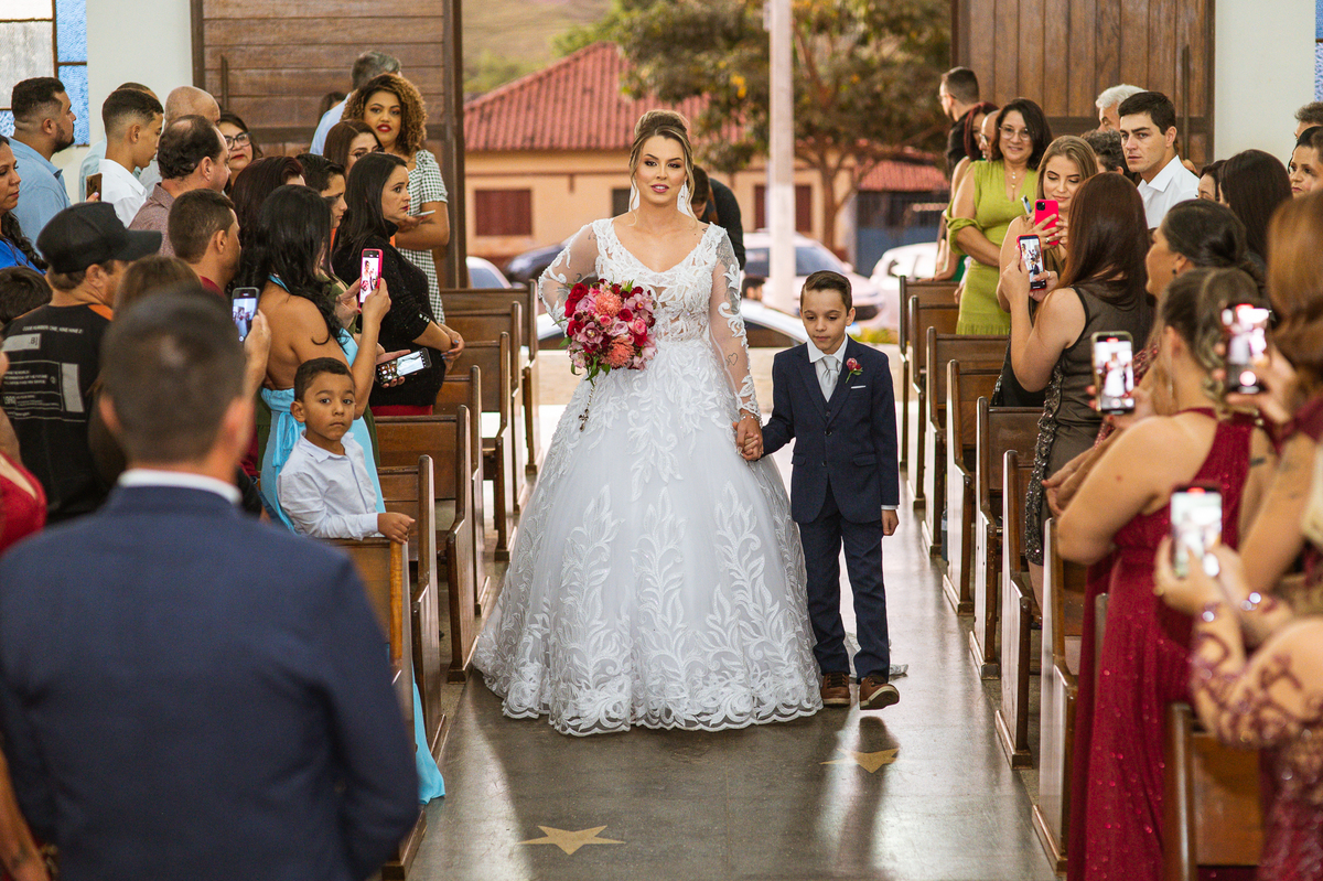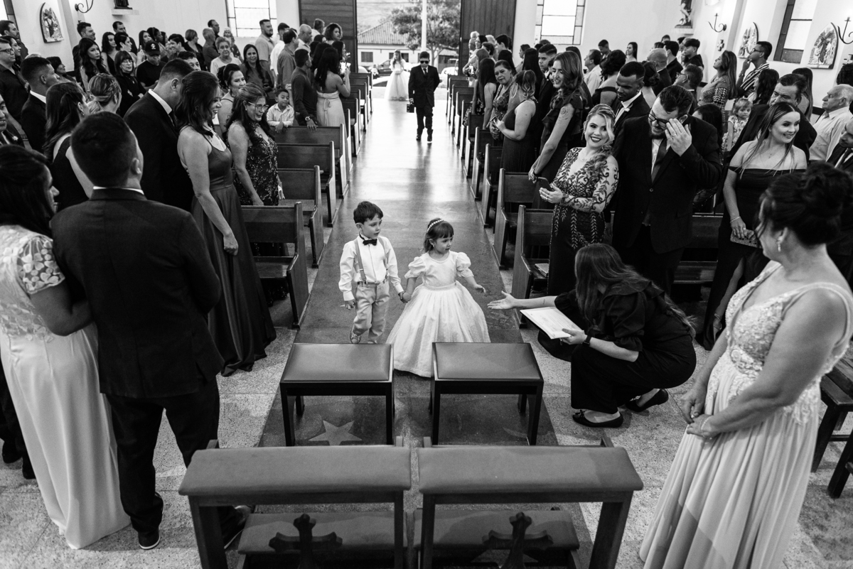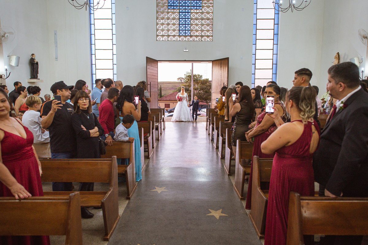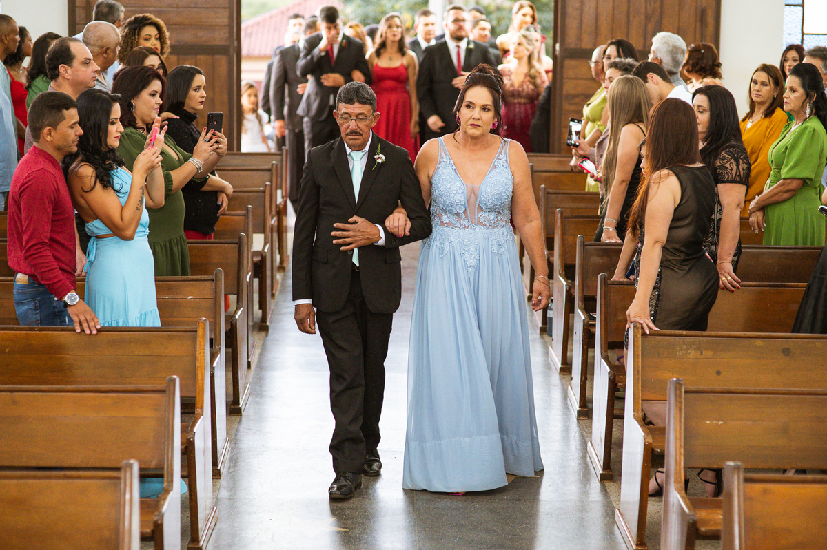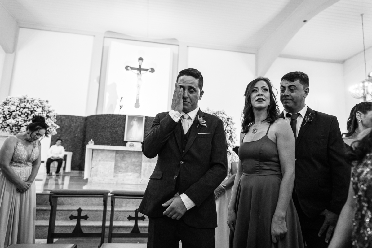 Bruna preparou uma homenagem linda para seu pai. Era surpresa pra todos. Enquanto o noivo entrava e os padrinhos iam se acomodando, os pajens também entraram. Quando as portas da Igreja se fecharam, ela organizou a surpresa. Com um balão em formato de coração e com a escrita "PAI" nele, as portas se abriram e ela diante de todos beijou o balão como se representasse ali a presença de seu Pai. Após o beijo, ela soltou o balão como forma de despedida e como se lá de cima ele estivesse olhando e sorrindo pra ela. Por mais singelo que possa parecer esse ato, ele representou muito e emocionou à todos os presentes, incluindo o fotógrafo. Quando virei pra olhar a reação do noivo, vi tantos rostos emocionados que mal poderia contar.