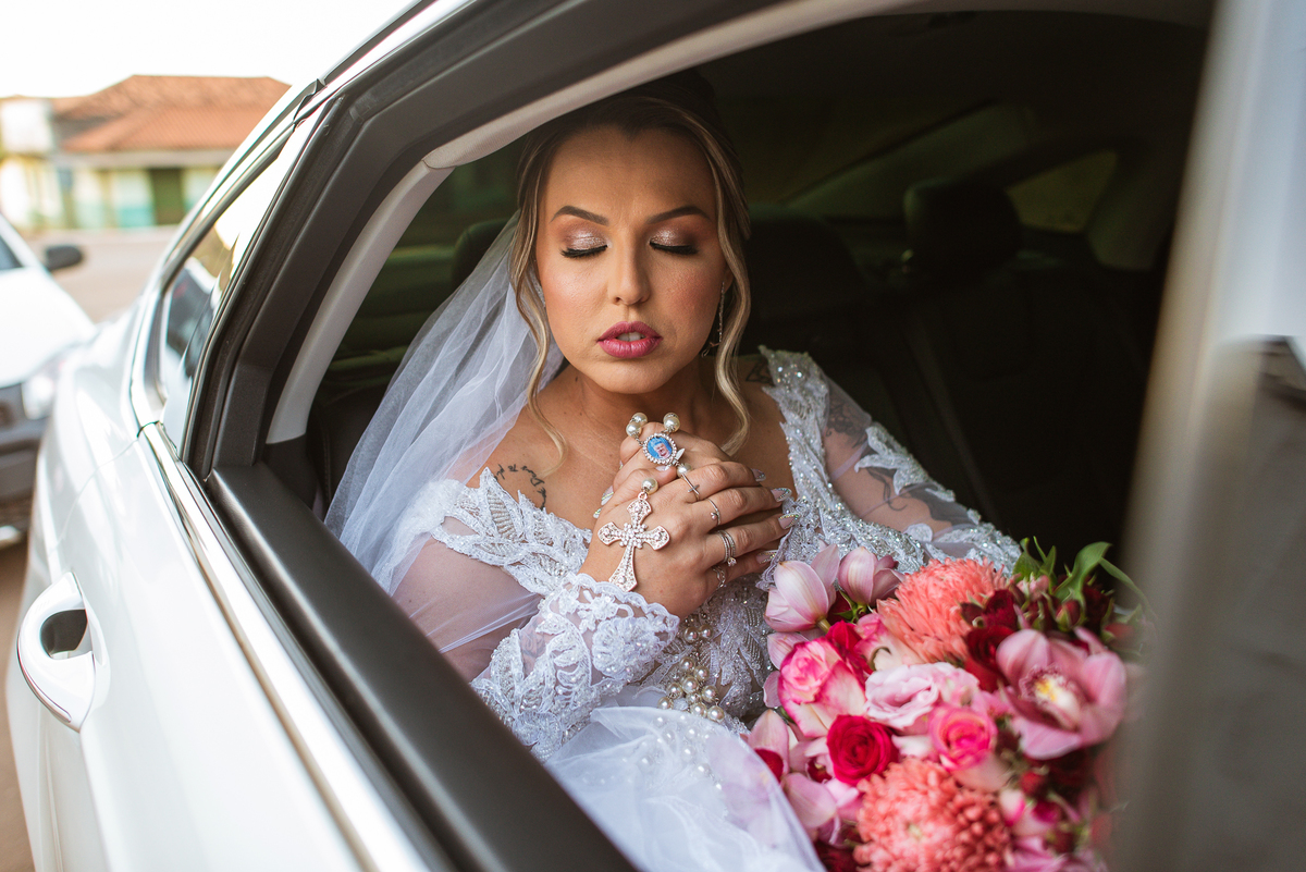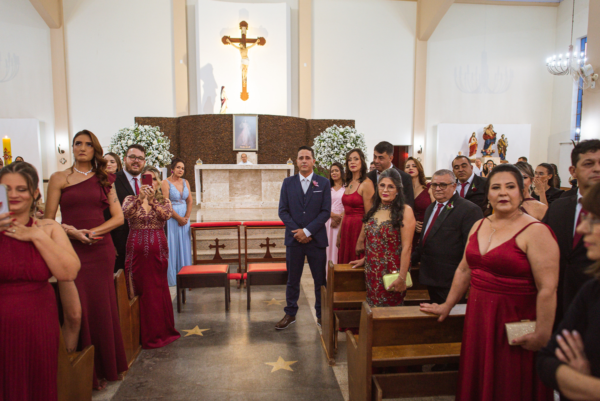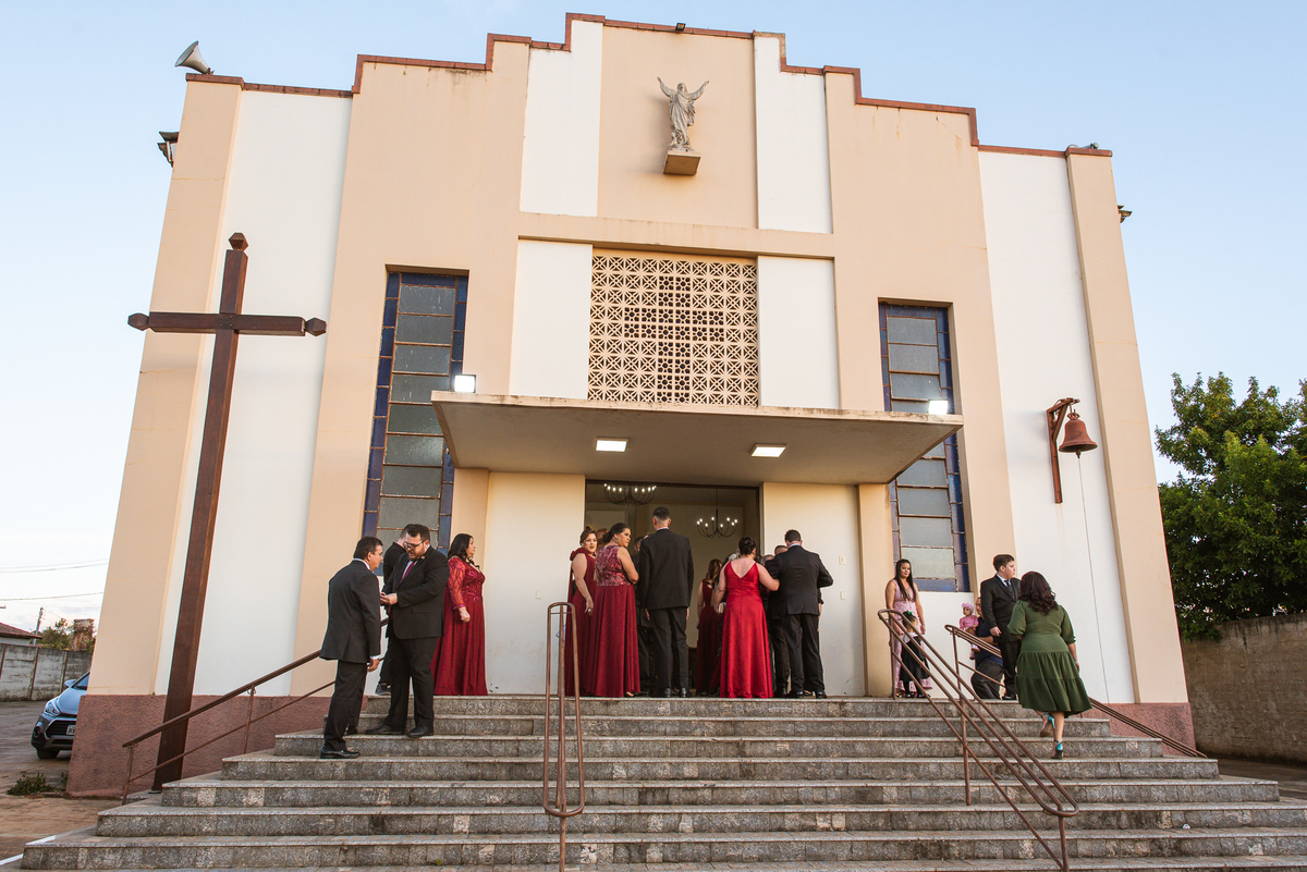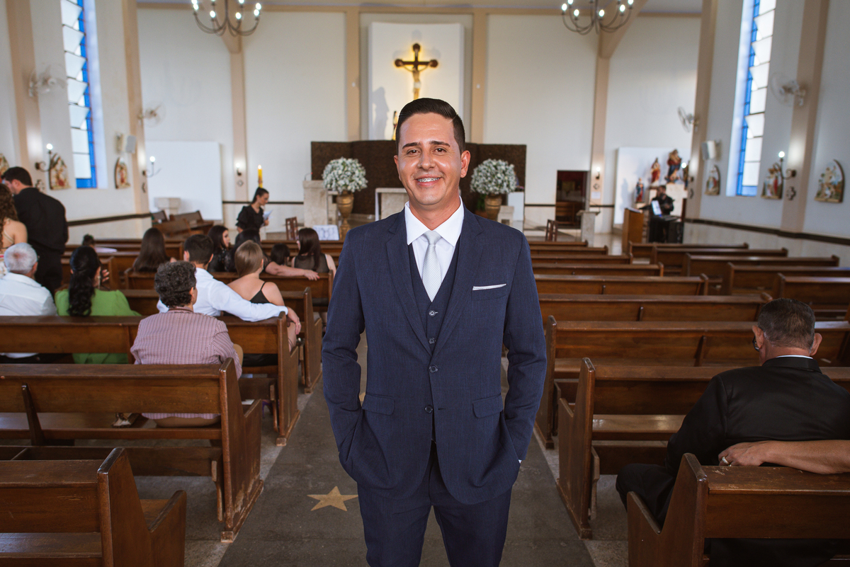 Tudo estava pronto, fizemos nossas fotografias de praxe e caprichando nos detalhes. Depois de tudo encerrado, partimos para Major Porto. A distância é de cerca de uma hora de carro, indo a uma velocidade razoável. Chegando lá, Edwards já estava na porta da Igreja com a ansiedade daquele jeito. Os padrinhos e convidados foram chegando e aos poucos o clima de casamento pairava no ar. A Igrejinha linda e charmosa foi decorada para receber os noivos e seus pais. Fizemos algumas fotos com o noivo e logo a fila dos padrinhos já estava sendo organizada pela equipe do cerimonial Sara Moreira. Fizemos as fotos da noiva no carro e partimos para a cerimônia.