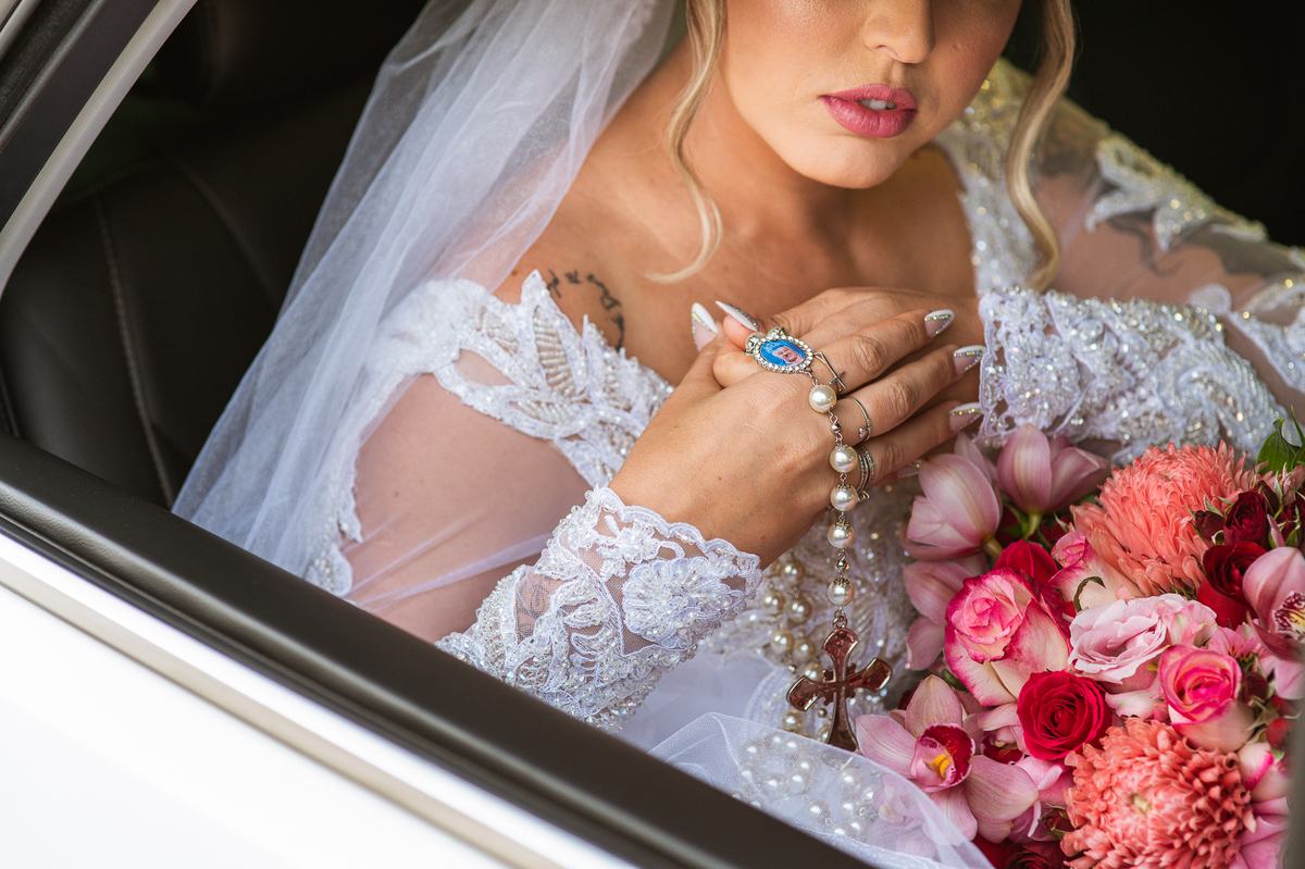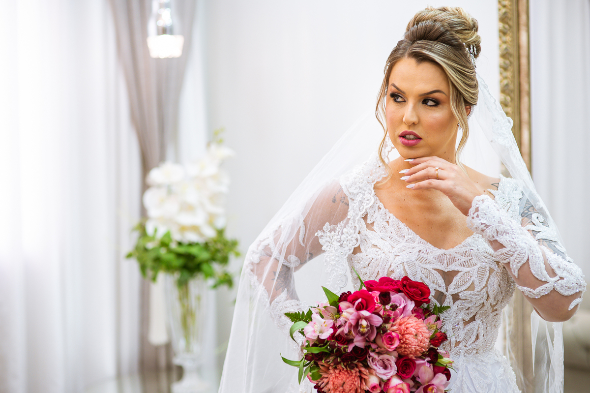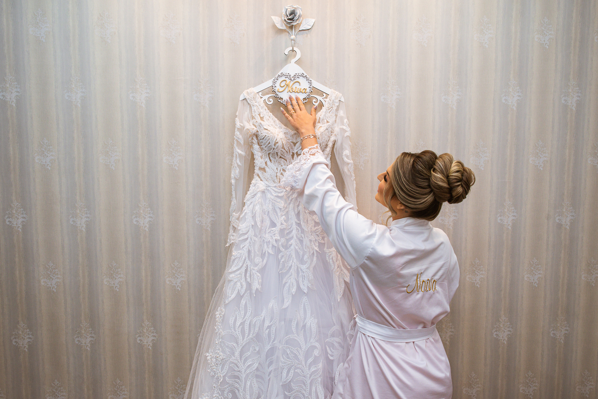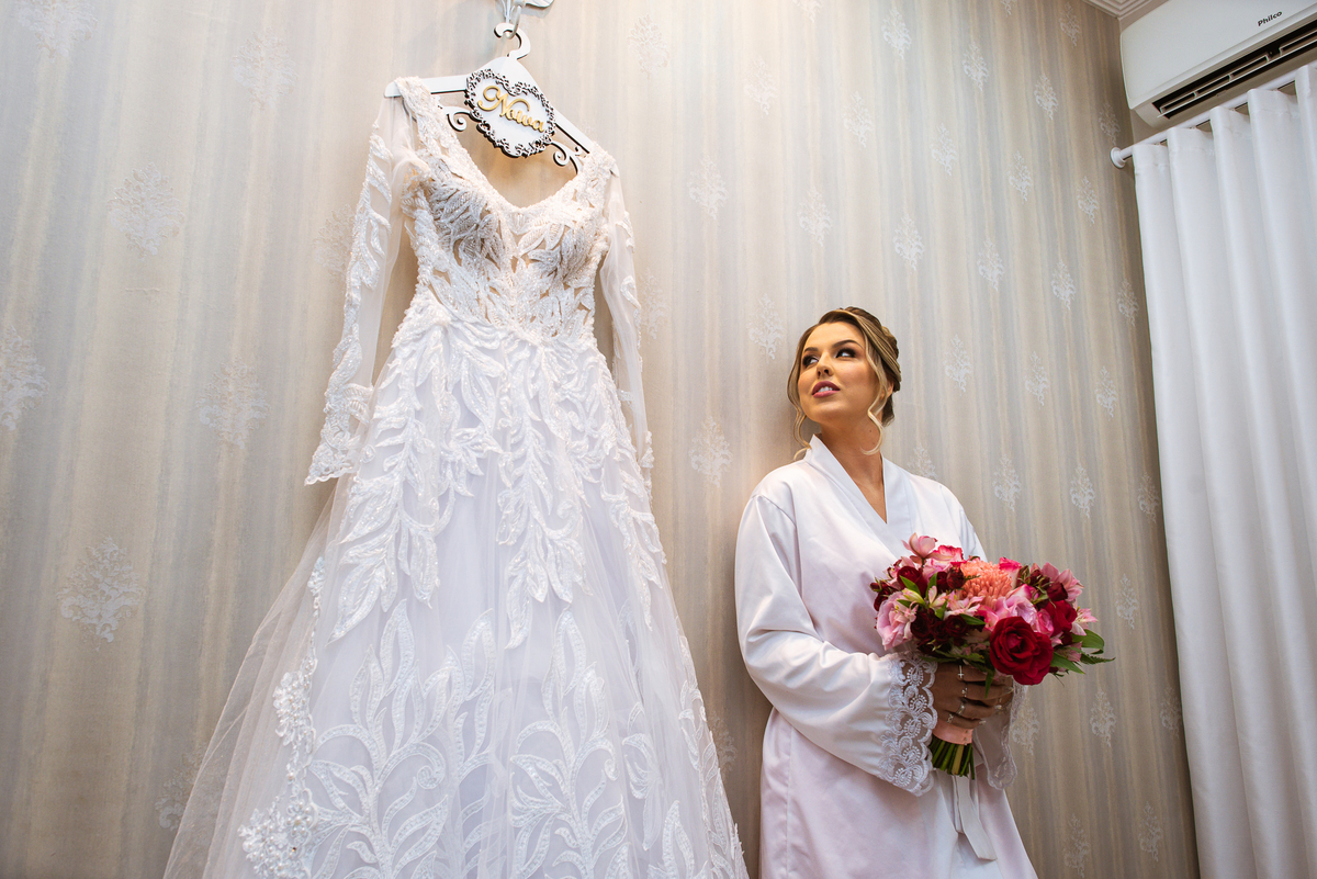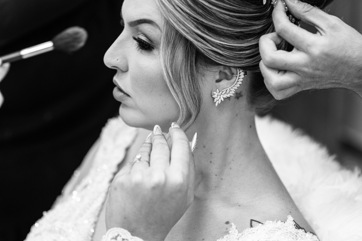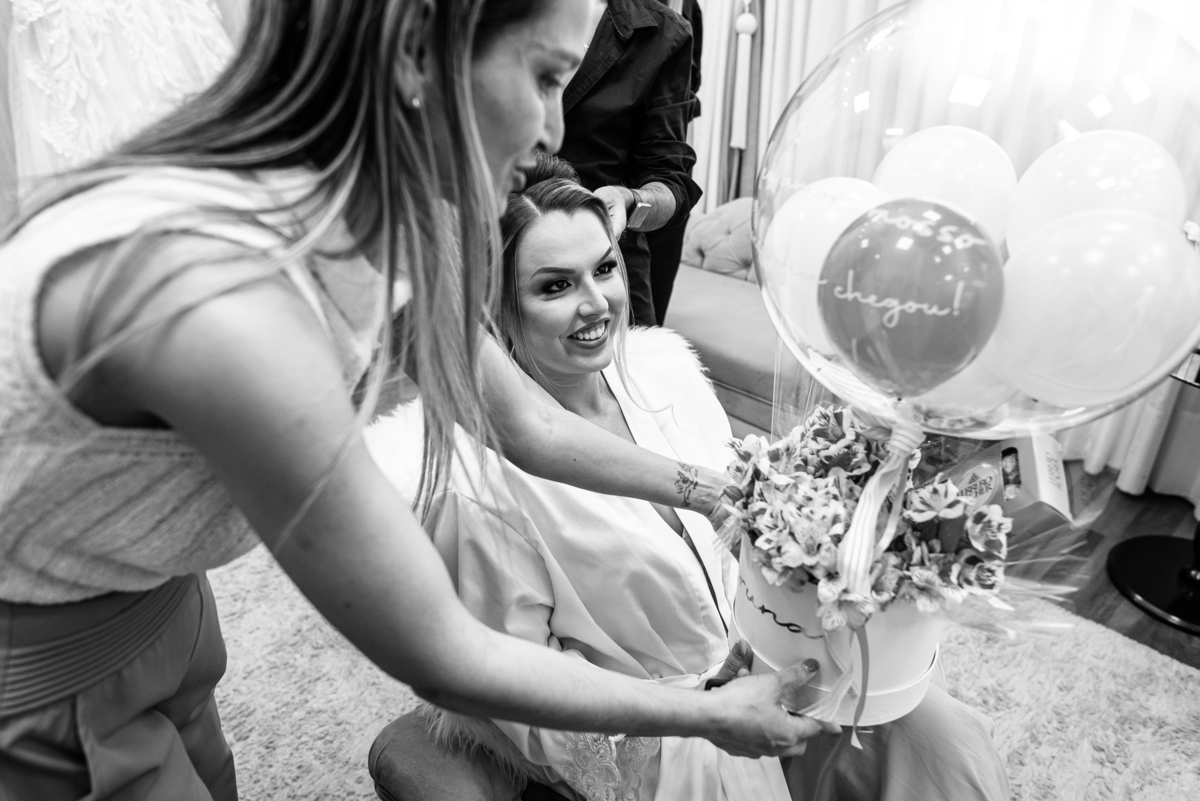 Bruna teve a grata surpresa de receber um presentinho do seu noivo. Ela, que não é muito de flores, recebeu um mimo super charmoso. Bombons envoltos em balões super chiques. Além, claro, de receber o seu lindo buquê que a acompanharia em sua caminhada ao altar. Quando a produção estava finalizada, era hora de se colocar o vestido. Quando a porta se abriu novamente e eu vi Bruna prontinha fiquei impressionado com a perfeição com que tudo havia ficado. Desde o brinco escolhido até o penteado, tudo em uma sintonia muito perfeita.