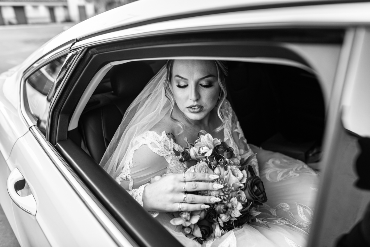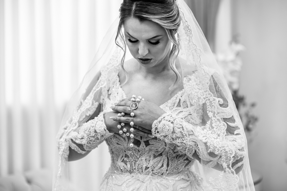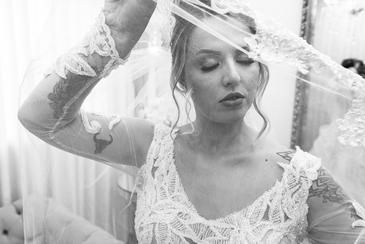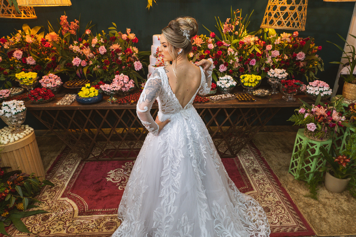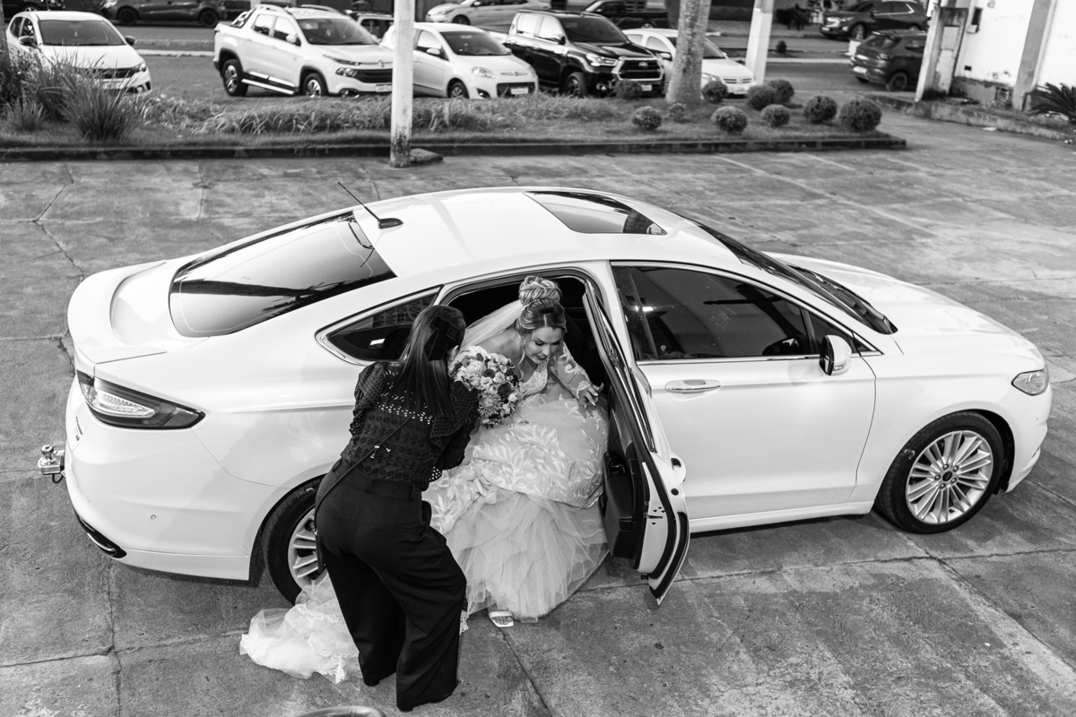 Bruna teve a grata surpresa de receber um presentinho do seu noivo. Ela, que não é muito de flores, recebeu um mimo super charmoso. Bombons envoltos em balões super chiques. Além, claro, de receber o seu lindo buquê que a acompanharia em sua caminhada ao altar. Quando a produção estava finalizada, era hora de se colocar o vestido. Quando a porta se abriu novamente e eu vi Bruna prontinha fiquei impressionado com a perfeição com que tudo havia ficado. Desde o brinco escolhido até o penteado, tudo em uma sintonia muito perfeita.