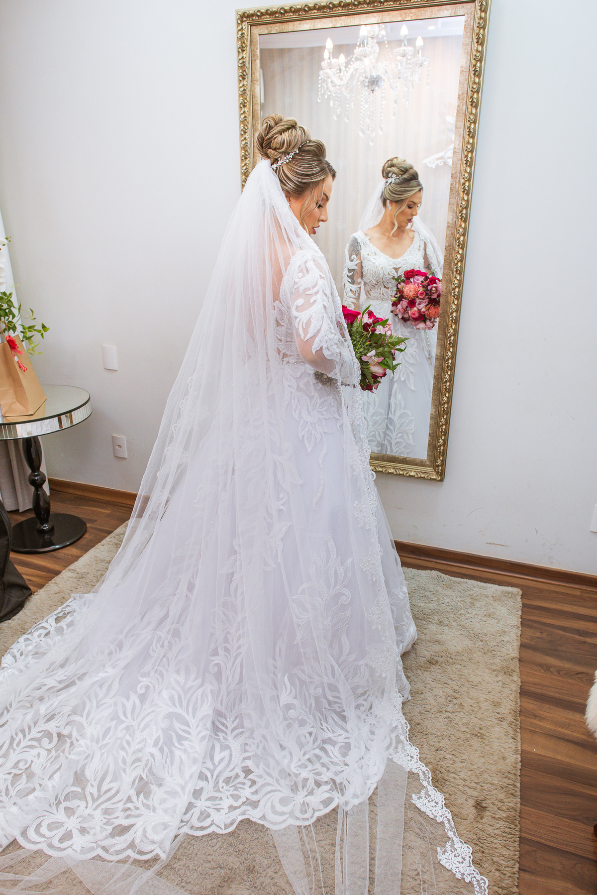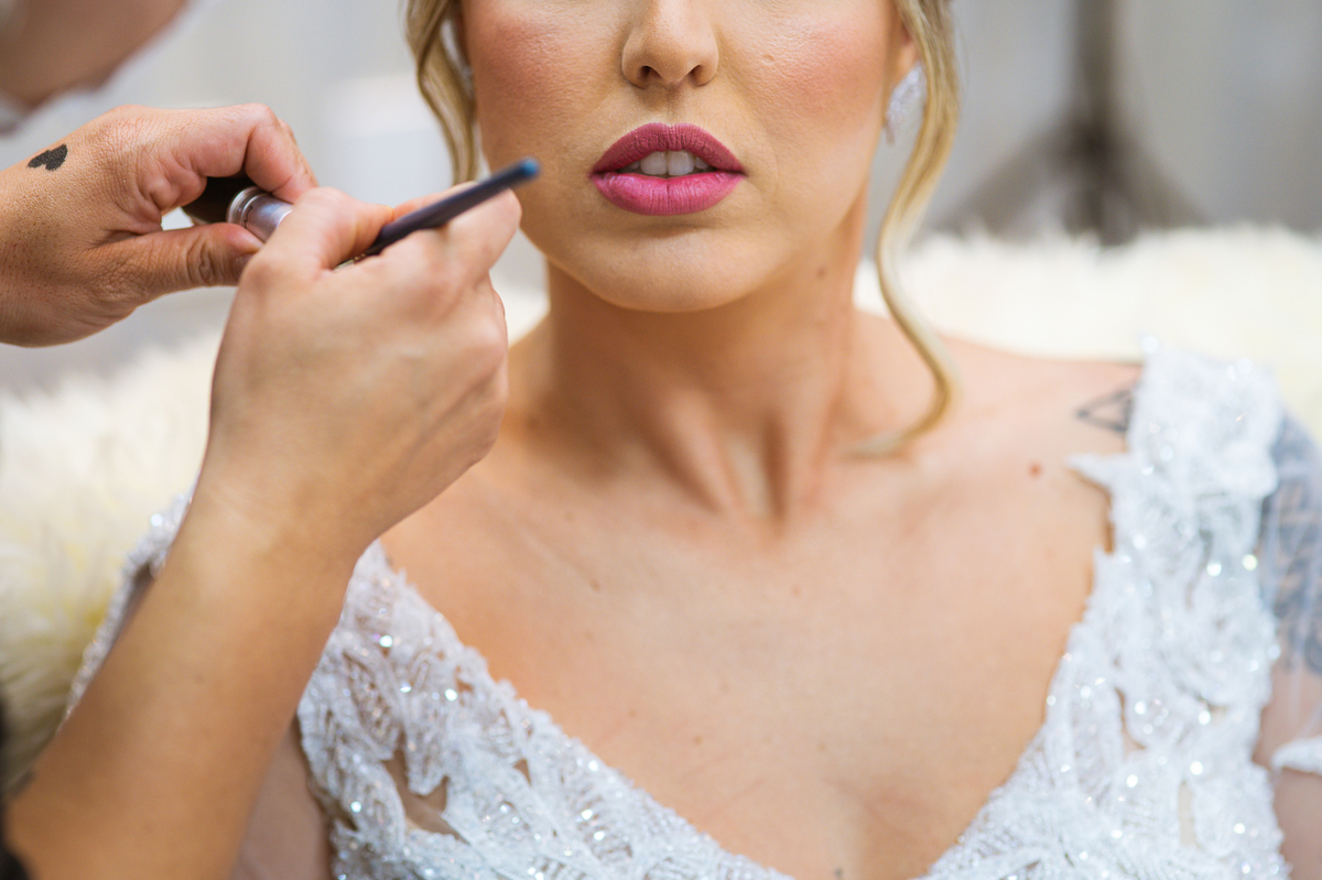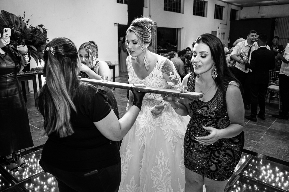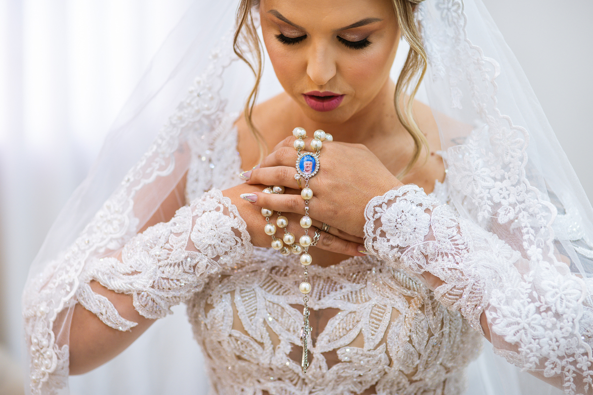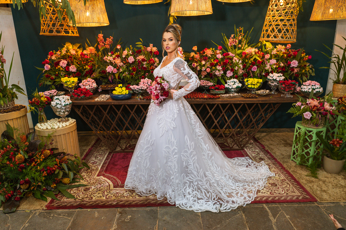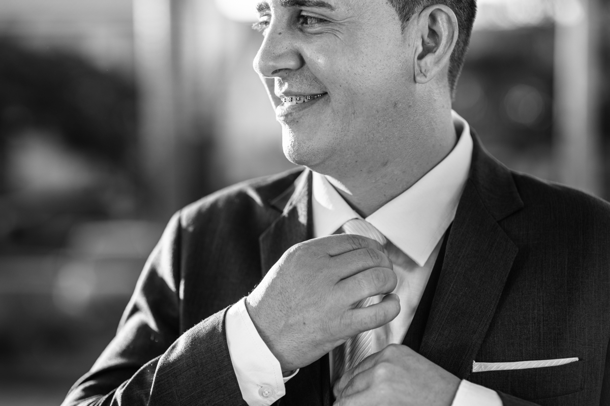 Bruna teve a grata surpresa de receber um presentinho do seu noivo. Ela, que não é muito de flores, recebeu um mimo super charmoso. Bombons envoltos em balões super chiques. Além, claro, de receber o seu lindo buquê que a acompanharia em sua caminhada ao altar. Quando a produção estava finalizada, era hora de se colocar o vestido. Quando a porta se abriu novamente e eu vi Bruna prontinha fiquei impressionado com a perfeição com que tudo havia ficado. Desde o brinco escolhido até o penteado, tudo em uma sintonia muito perfeita.