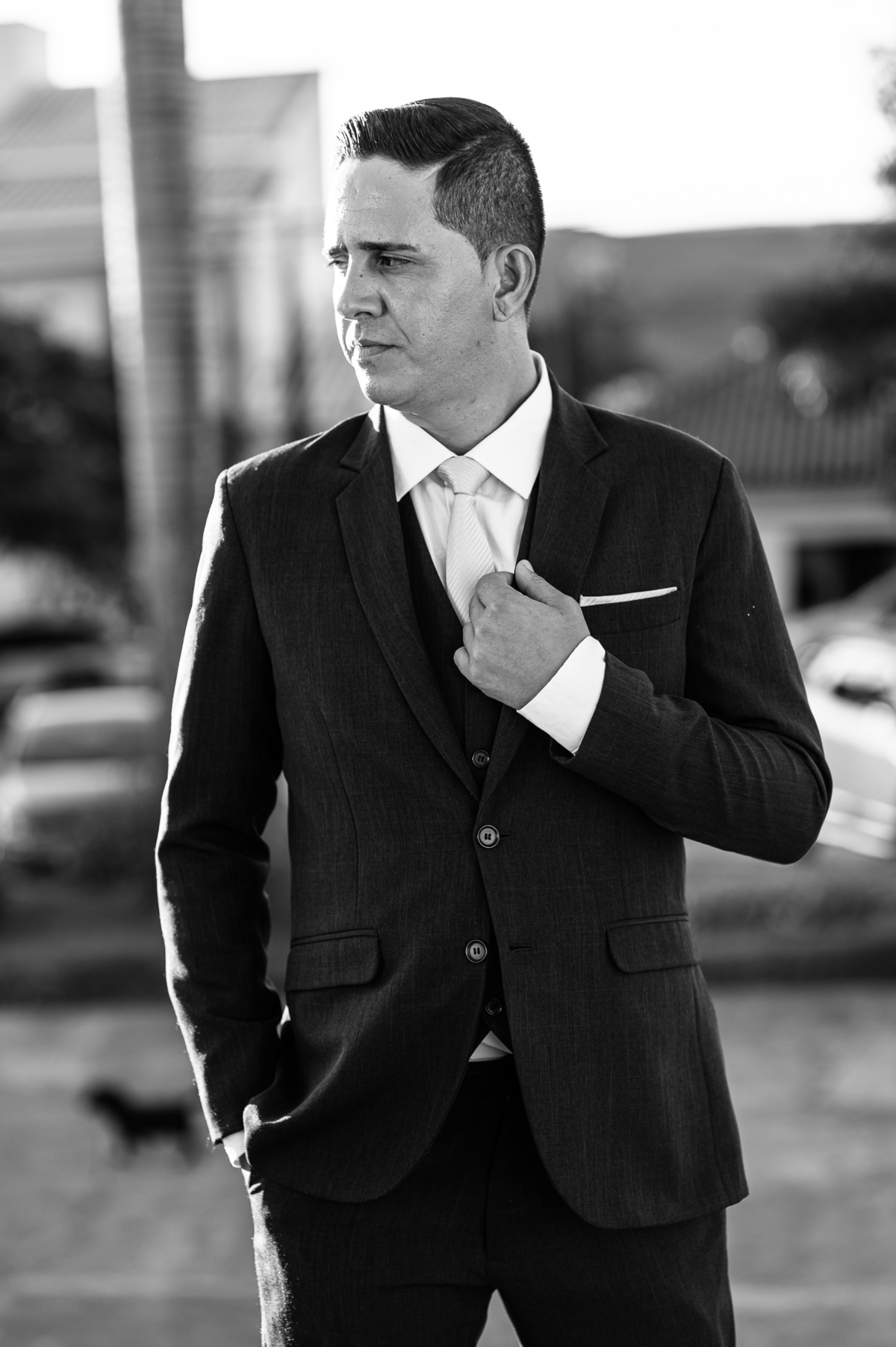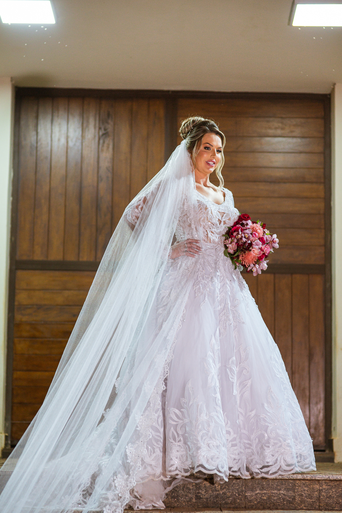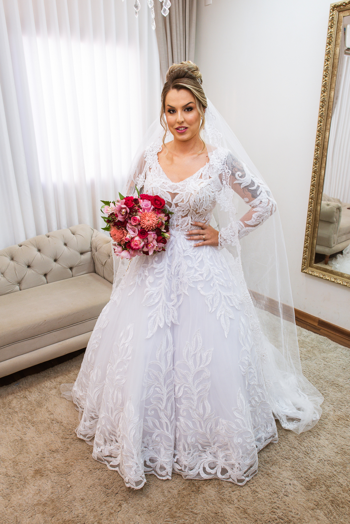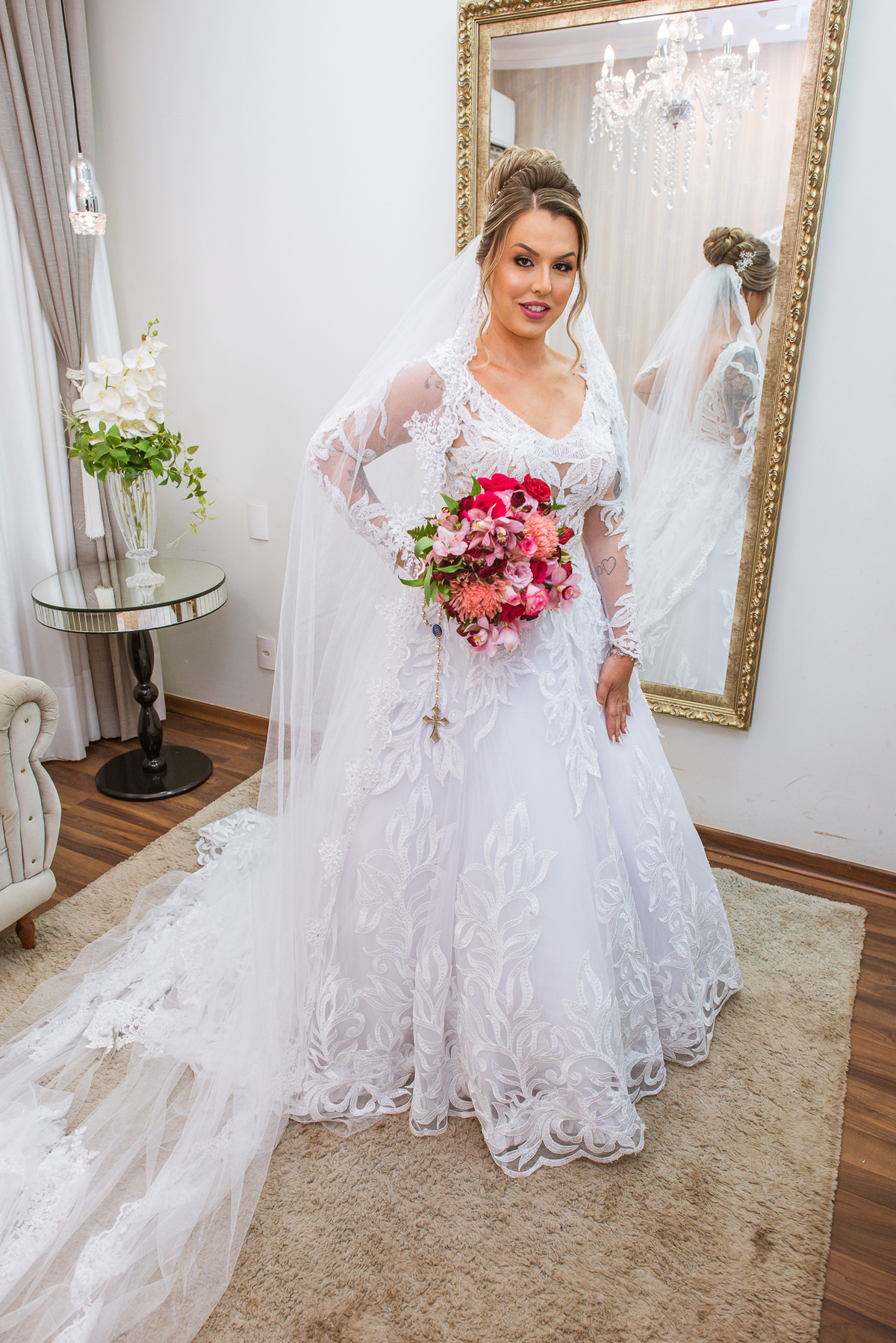 Bruna teve a grata surpresa de receber um presentinho do seu noivo. Ela, que não é muito de flores, recebeu um mimo super charmoso. Bombons envoltos em balões super chiques. Além, claro, de receber o seu lindo buquê que a acompanharia em sua caminhada ao altar. Quando a produção estava finalizada, era hora de se colocar o vestido. Quando a porta se abriu novamente e eu vi Bruna prontinha fiquei impressionado com a perfeição com que tudo havia ficado. Desde o brinco escolhido até o penteado, tudo em uma sintonia muito perfeita.