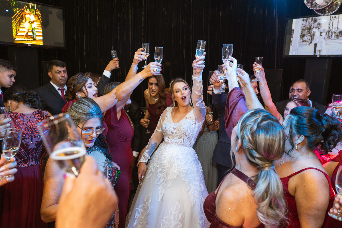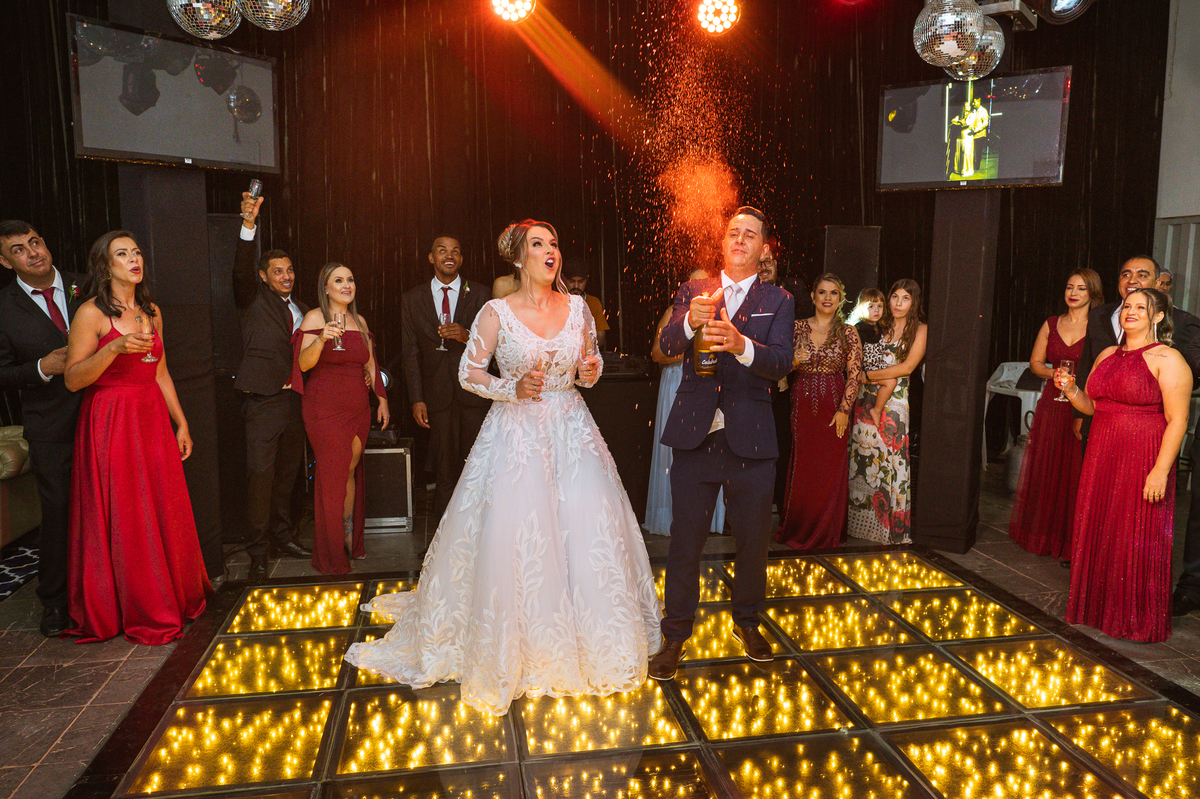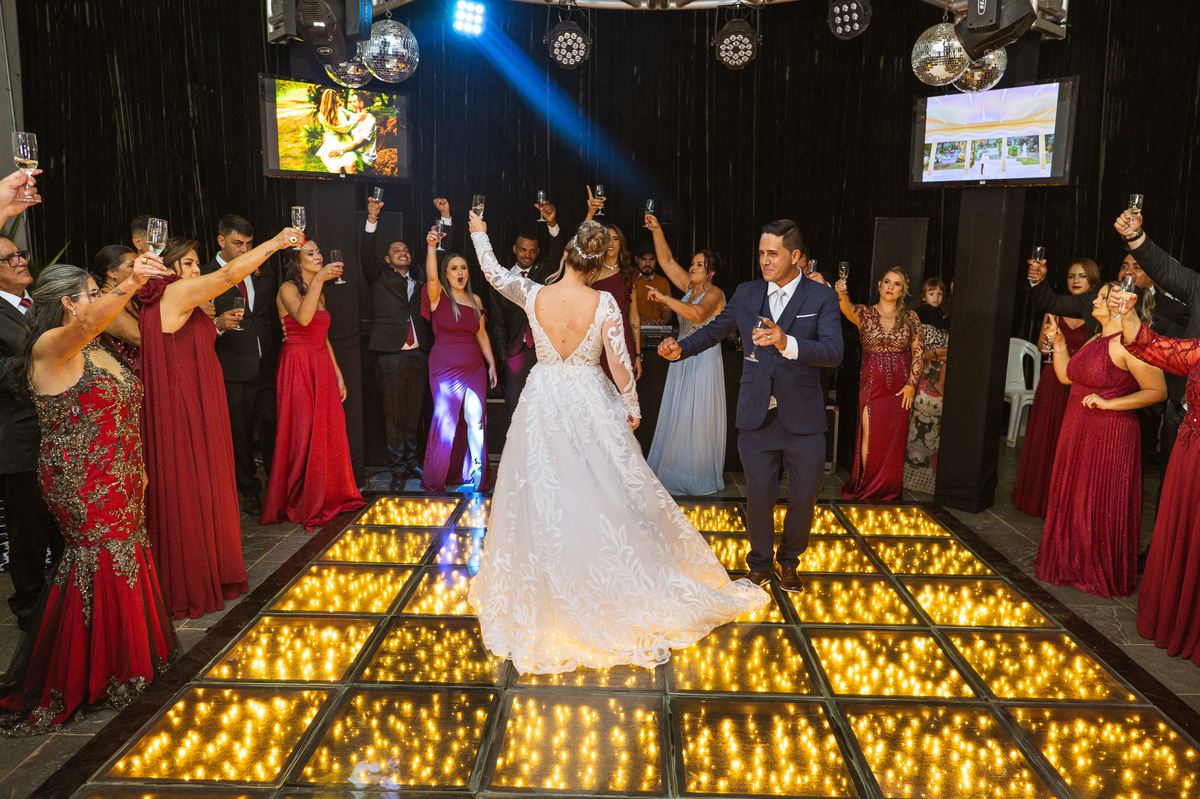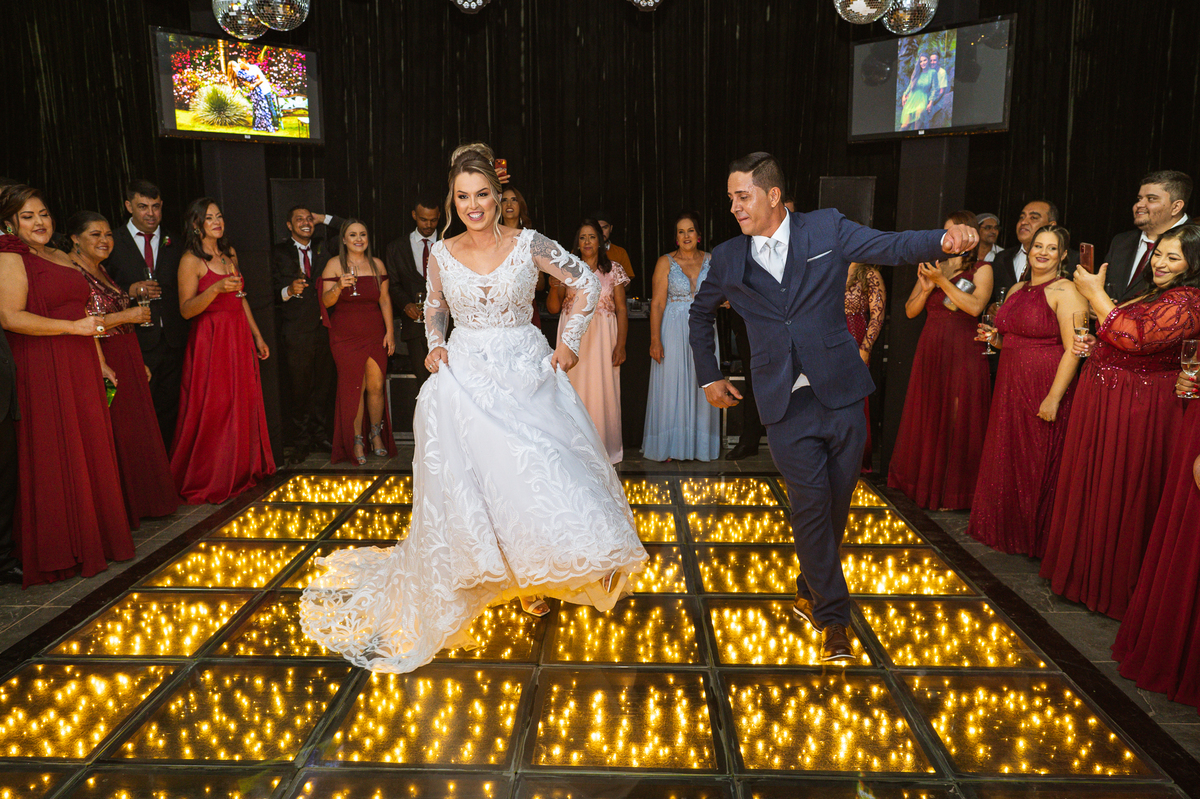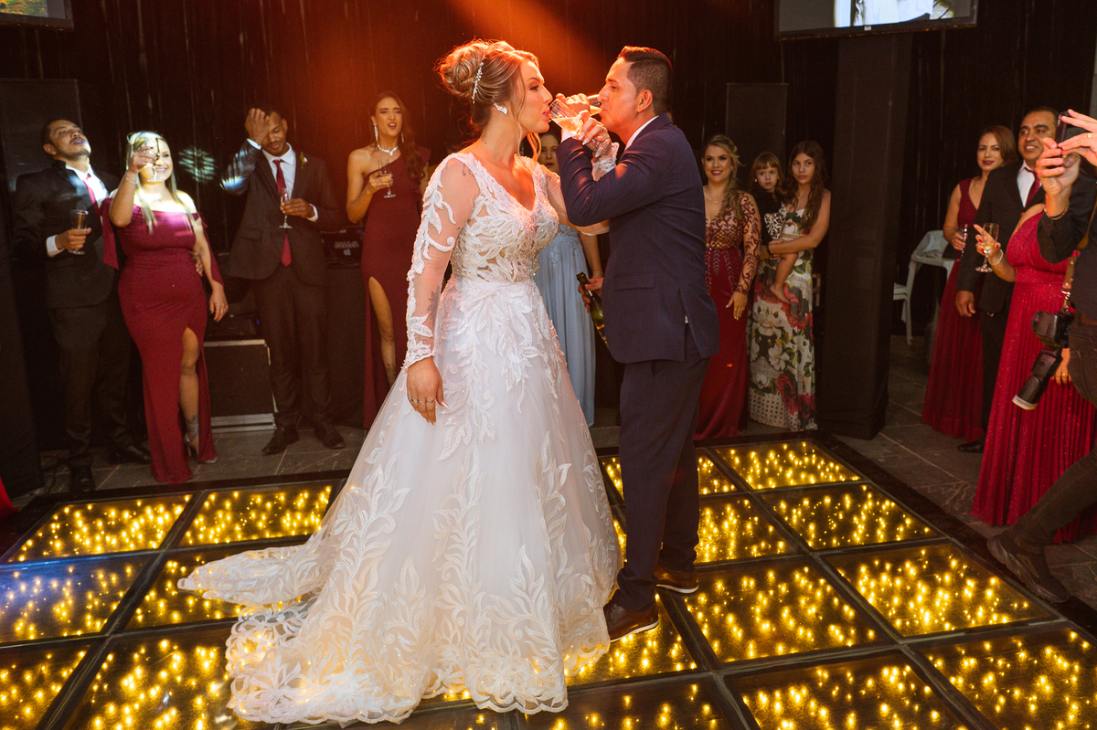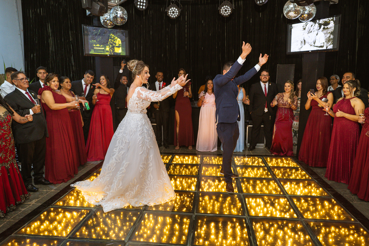 Os recém-casados foram recebidos na pista de dança com muita festa. Eles agradeceram seus familiares e convidados e não perderam tempo, iniciando sua primeira dança de casados. Começaram com uma valsa tradicional quando de repente iniciaram uma valsa maluca. Dançaram ao som do funk e ao final eles chamaram todos os padrinhos pra entrarem na dança. Foi incrível! A energia dos dois era contagiante e até mesmo o estouro do espumante foi diferenciado. Eles brindaram com seus padrinhos e curtiram muito a noite inteira. Dançaram, beberam, se deliciaram com o buffet e curtiram todos os drinks servidos pela equipe. Todos estavam completamente felizes e alegres com o casamento de Ed e Bruna.