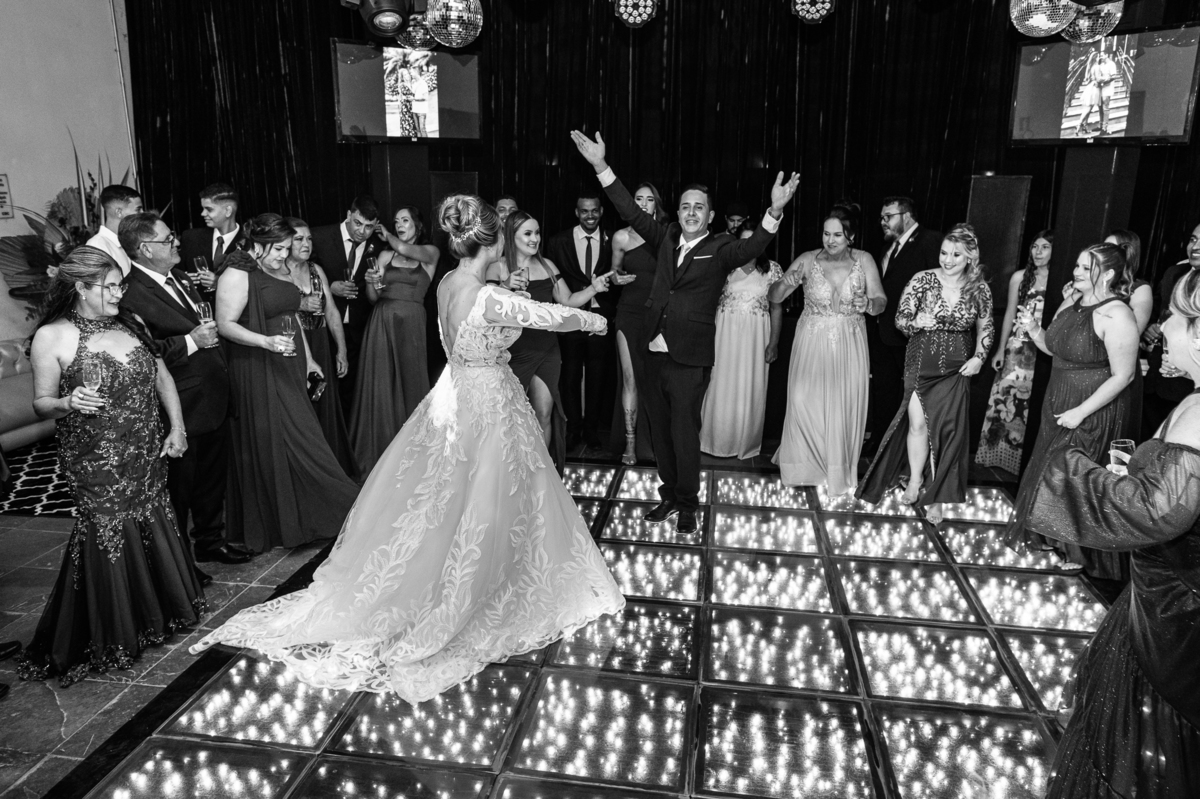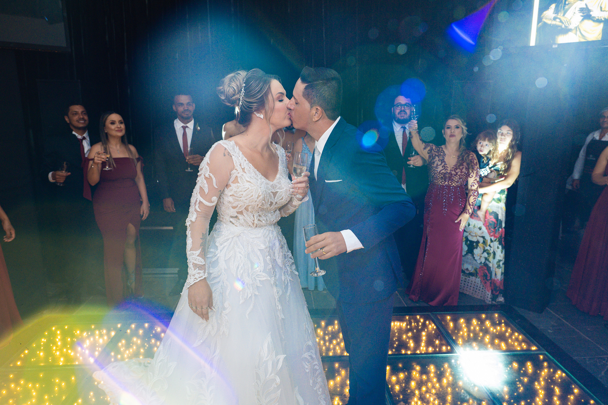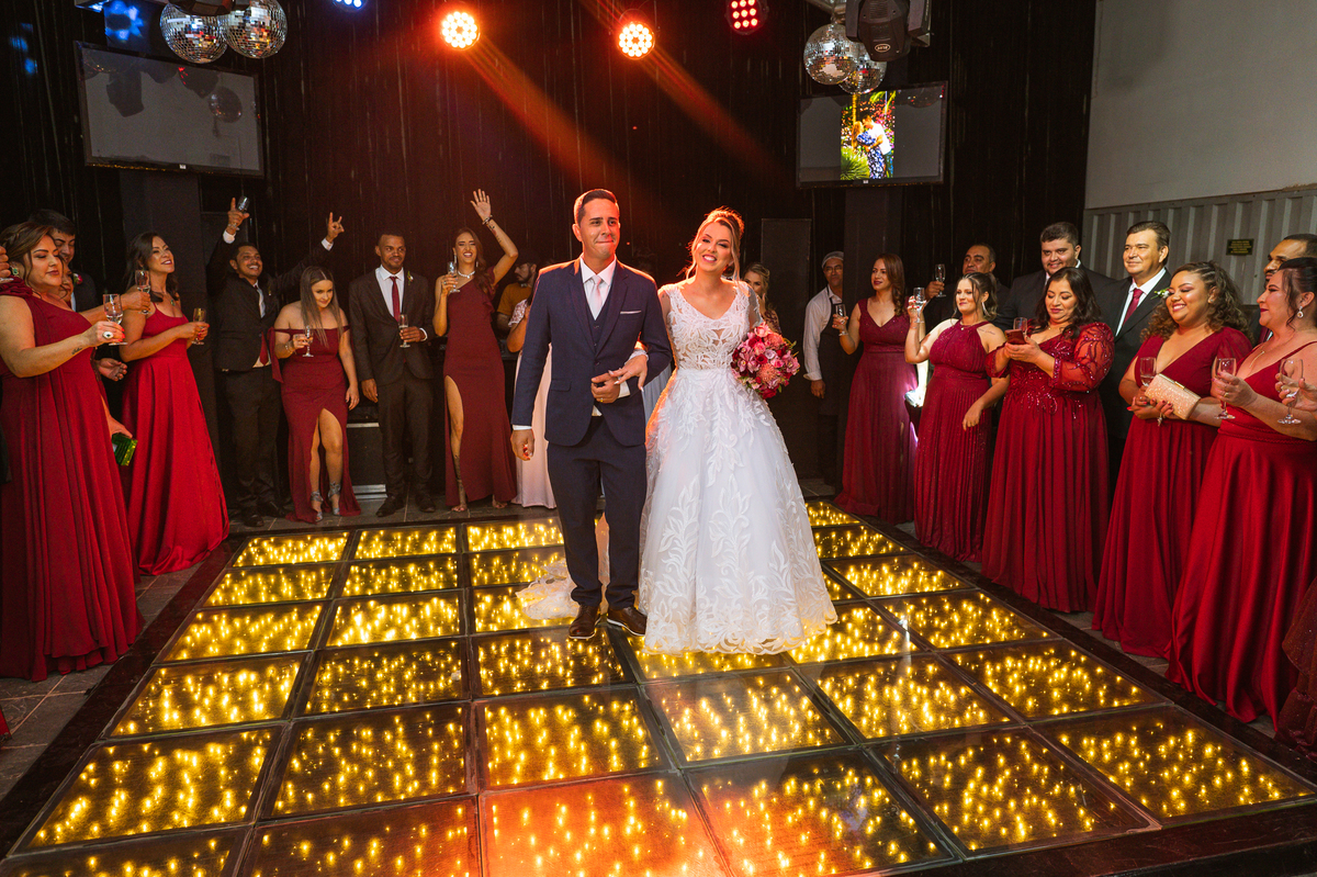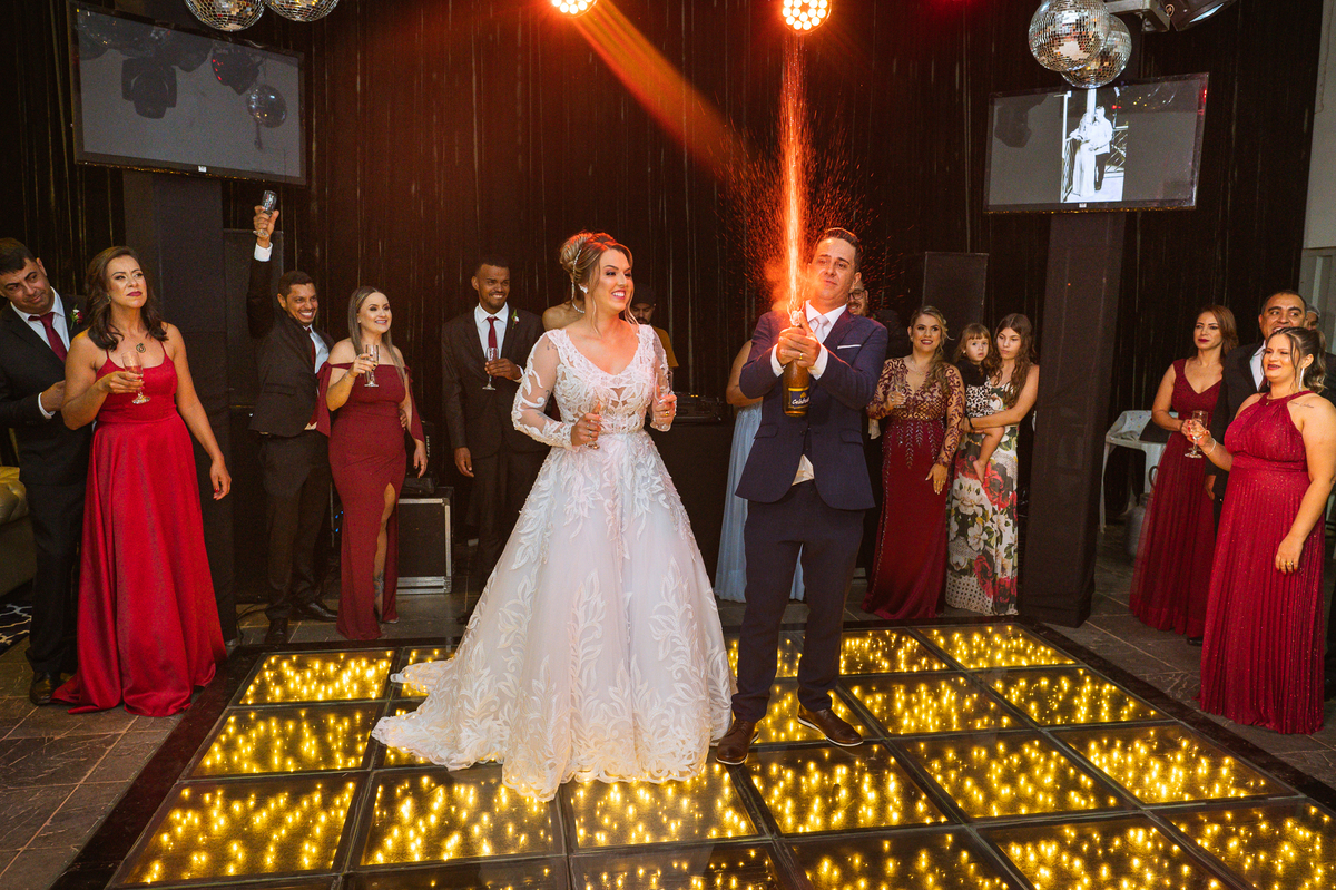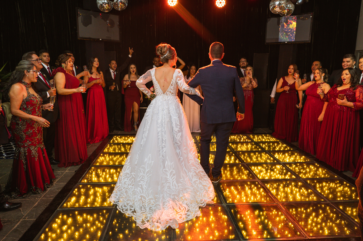 Os recém-casados foram recebidos na pista de dança com muita festa. Eles agradeceram seus familiares e convidados e não perderam tempo, iniciando sua primeira dança de casados. Começaram com uma valsa tradicional quando de repente iniciaram uma valsa maluca. Dançaram ao som do funk e ao final eles chamaram todos os padrinhos pra entrarem na dança. Foi incrível! A energia dos dois era contagiante e até mesmo o estouro do espumante foi diferenciado. Eles brindaram com seus padrinhos e curtiram muito a noite inteira. Dançaram, beberam, se deliciaram com o buffet e curtiram todos os drinks servidos pela equipe. Todos estavam completamente felizes e alegres com o casamento de Ed e Bruna.