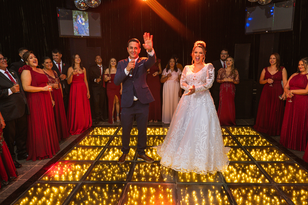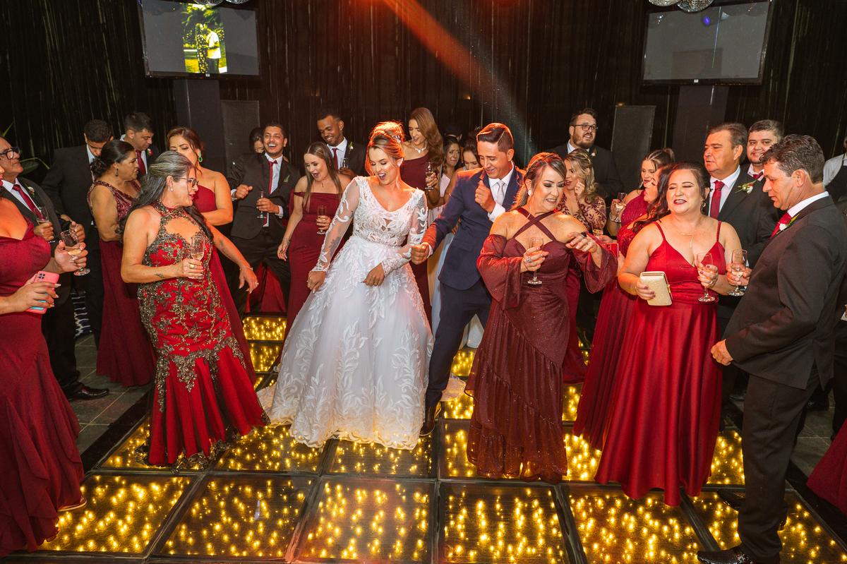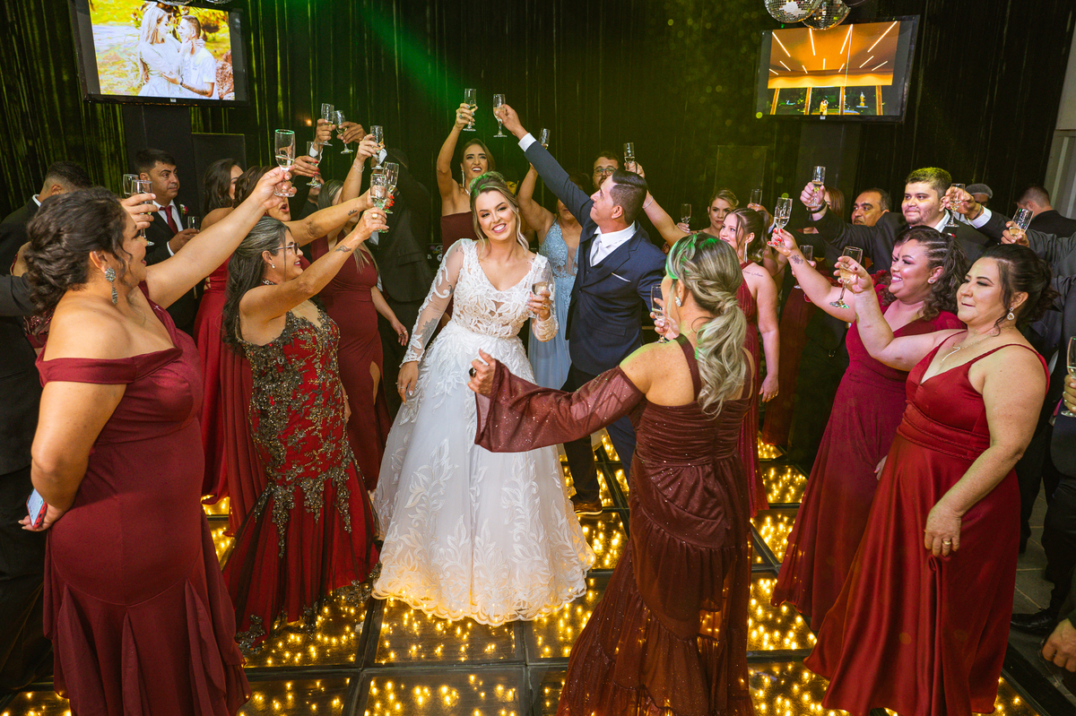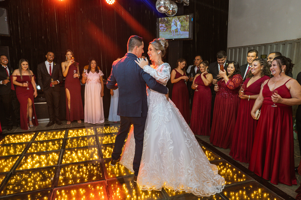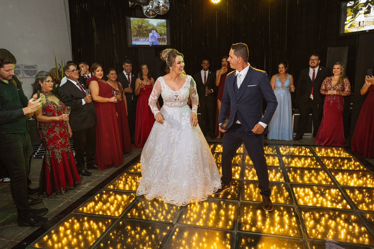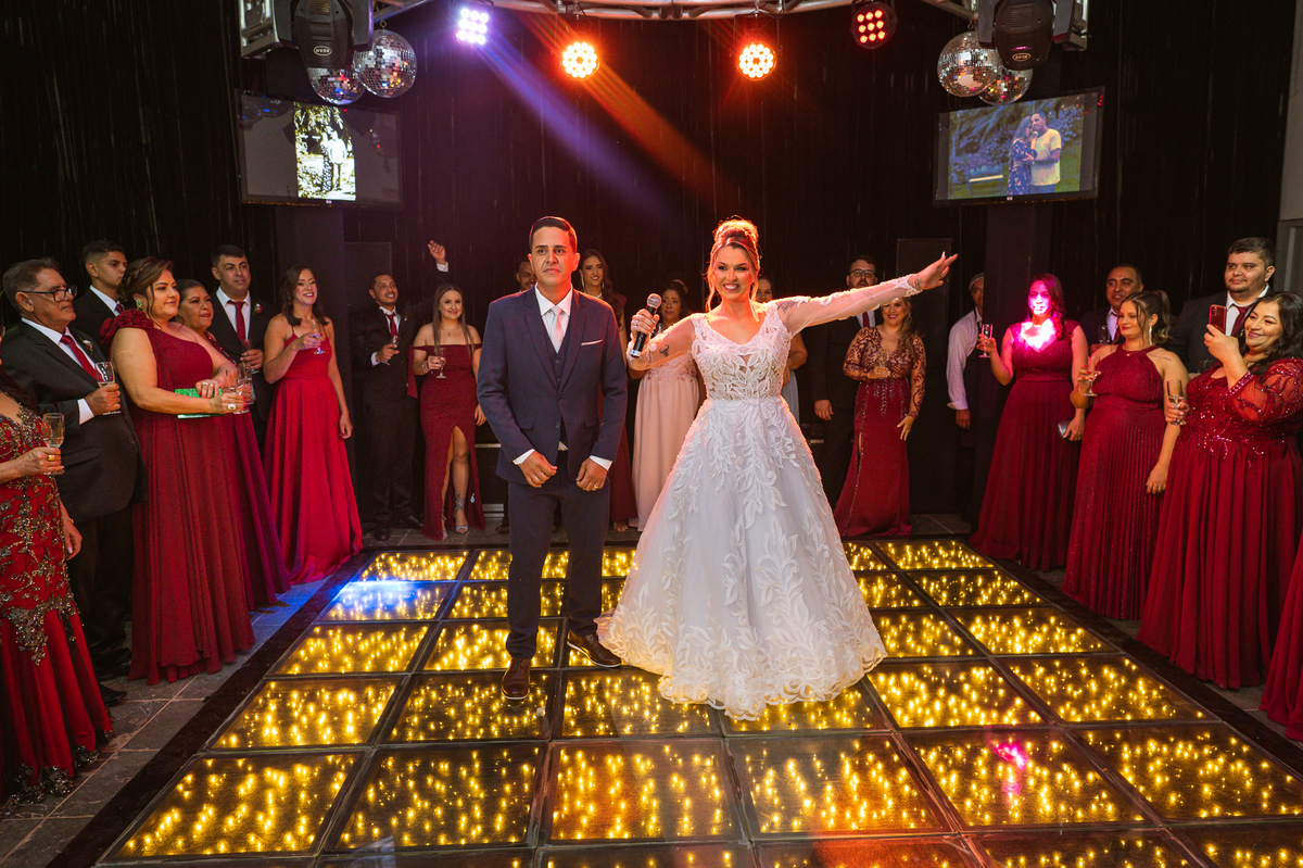Os recém-casados foram recebidos na pista de dança com muita festa. Eles agradeceram seus familiares e convidados e não perderam tempo, iniciando sua primeira dança de casados. Começaram com uma valsa tradicional quando de repente iniciaram uma valsa maluca. Dançaram ao som do funk e ao final eles chamaram todos os padrinhos pra entrarem na dança. Foi incrível! A energia dos dois era contagiante e até mesmo o estouro do espumante foi diferenciado. Eles brindaram com seus padrinhos e curtiram muito a noite inteira. Dançaram, beberam, se deliciaram com o buffet e curtiram todos os drinks servidos pela equipe. Todos estavam completamente felizes e alegres com o casamento de Ed e Bruna.