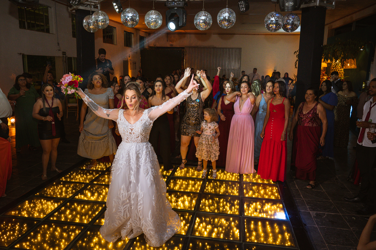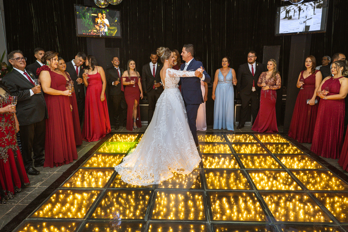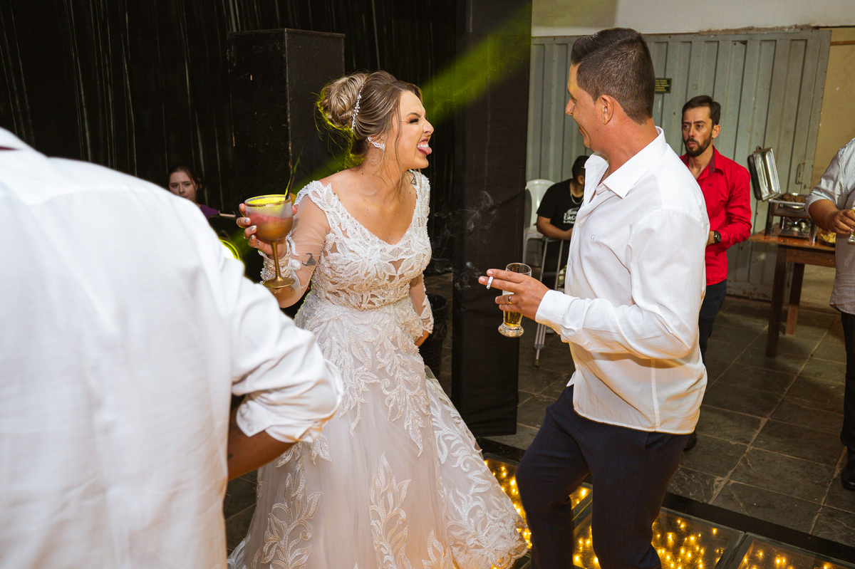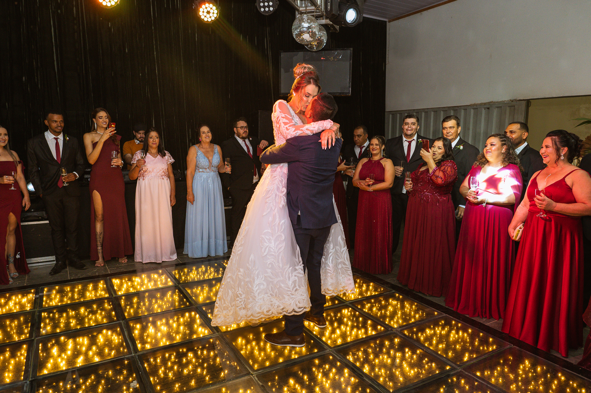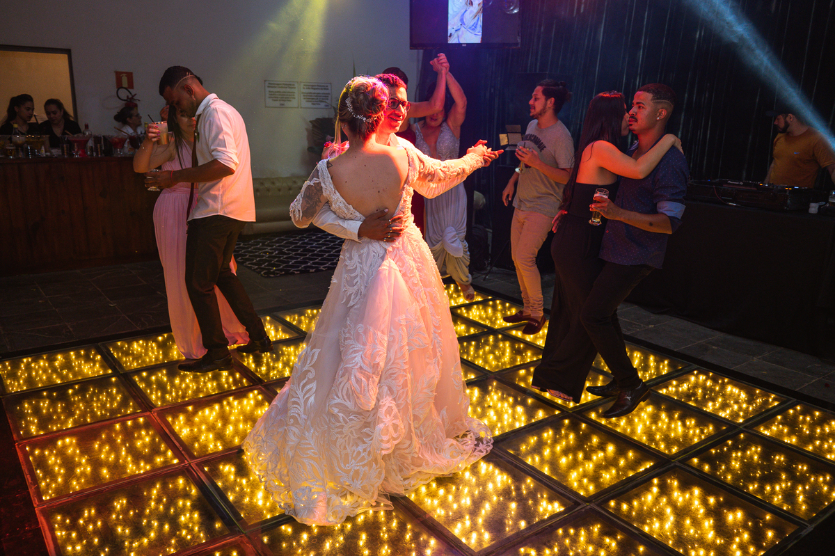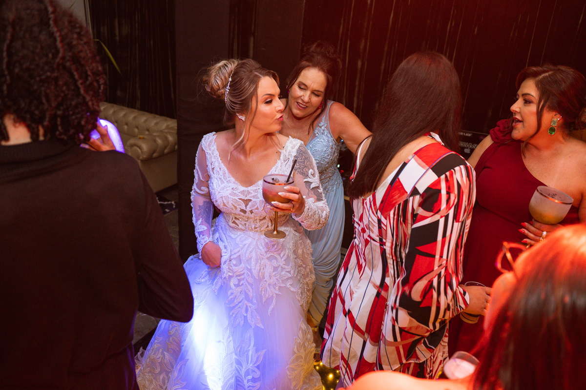 Os recém-casados foram recebidos na pista de dança com muita festa. Eles agradeceram seus familiares e convidados e não perderam tempo, iniciando sua primeira dança de casados. Começaram com uma valsa tradicional quando de repente iniciaram uma valsa maluca. Dançaram ao som do funk e ao final eles chamaram todos os padrinhos pra entrarem na dança. Foi incrível! A energia dos dois era contagiante e até mesmo o estouro do espumante foi diferenciado. Eles brindaram com seus padrinhos e curtiram muito a noite inteira. Dançaram, beberam, se deliciaram com o buffet e curtiram todos os drinks servidos pela equipe. Todos estavam completamente felizes e alegres com o casamento de Ed e Bruna.