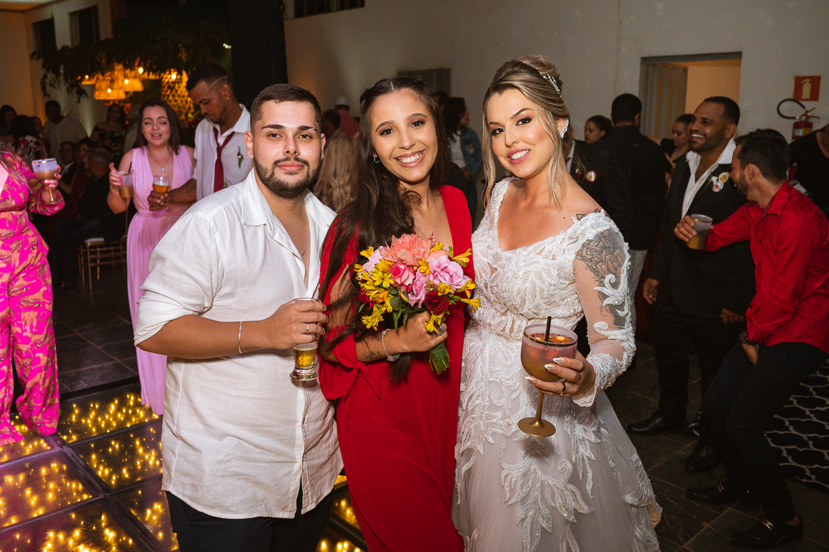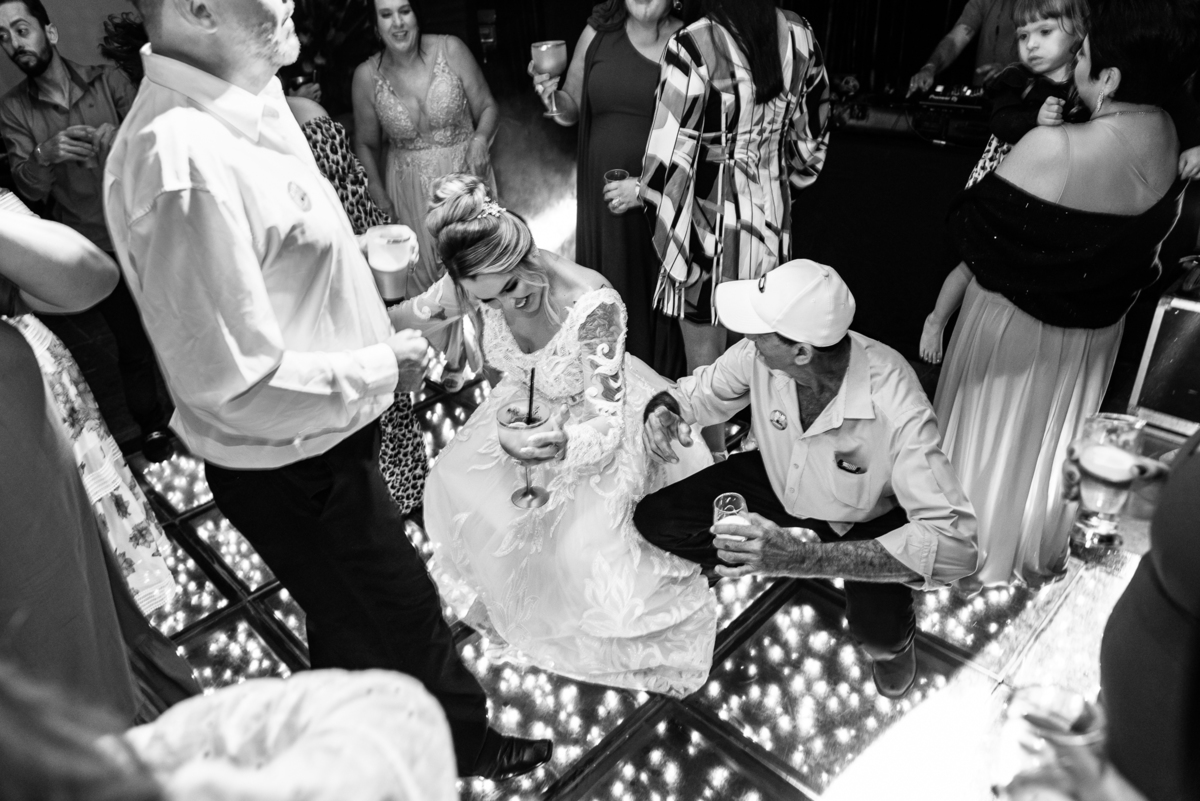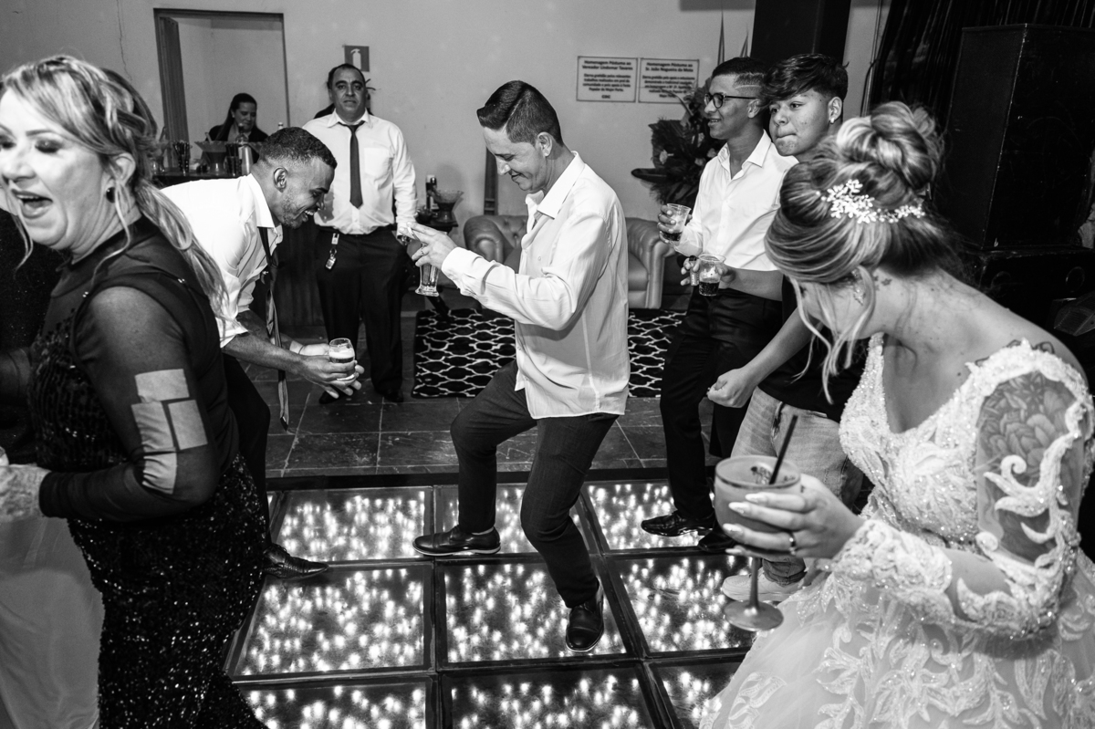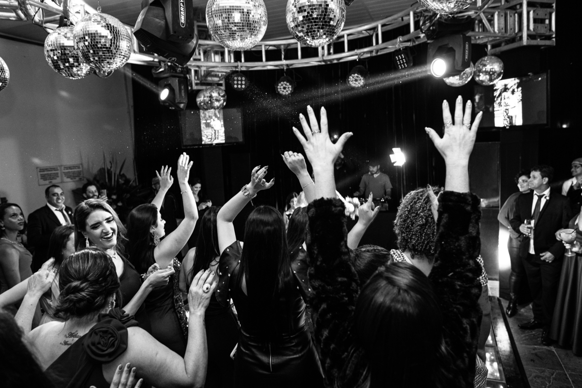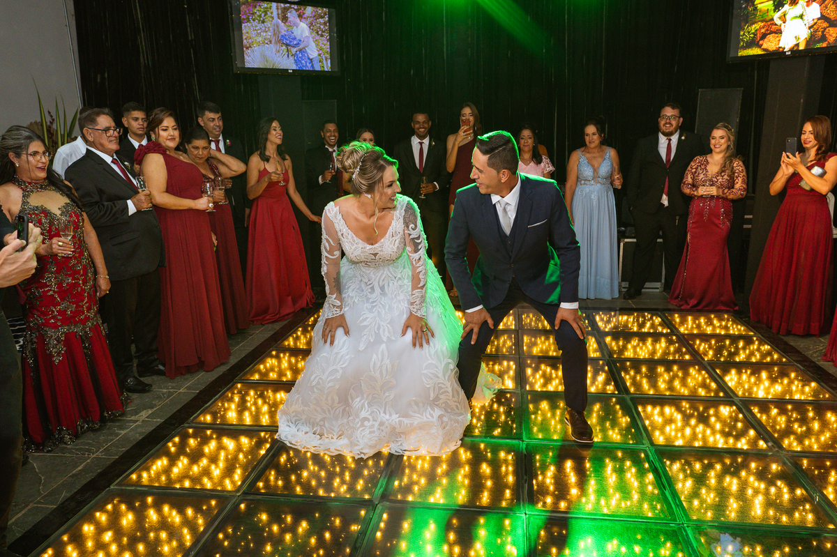 Os recém-casados foram recebidos na pista de dança com muita festa. Eles agradeceram seus familiares e convidados e não perderam tempo, iniciando sua primeira dança de casados. Começaram com uma valsa tradicional quando de repente iniciaram uma valsa maluca. Dançaram ao som do funk e ao final eles chamaram todos os padrinhos pra entrarem na dança. Foi incrível! A energia dos dois era contagiante e até mesmo o estouro do espumante foi diferenciado. Eles brindaram com seus padrinhos e curtiram muito a noite inteira. Dançaram, beberam, se deliciaram com o buffet e curtiram todos os drinks servidos pela equipe. Todos estavam completamente felizes e alegres com o casamento de Ed e Bruna.