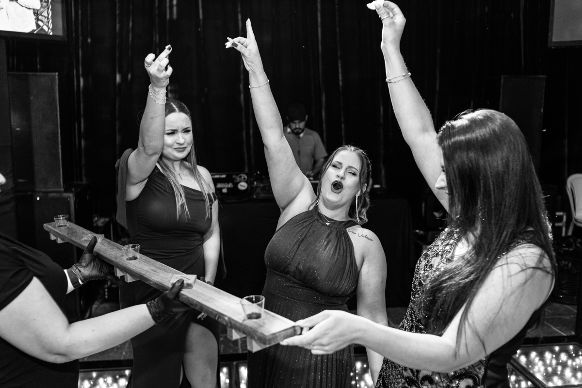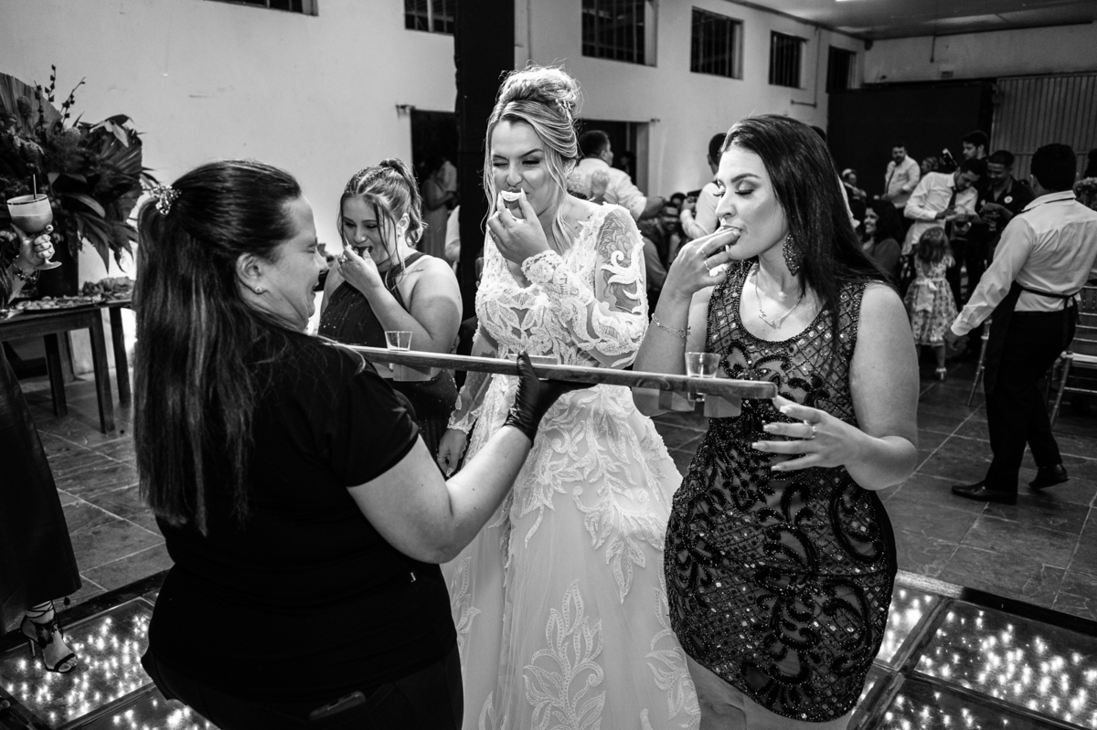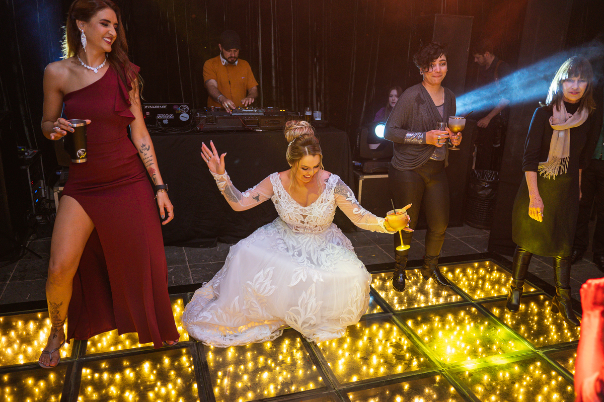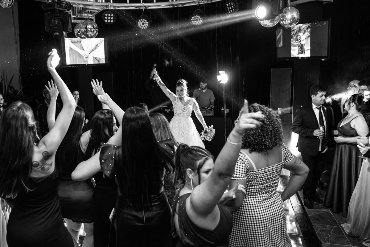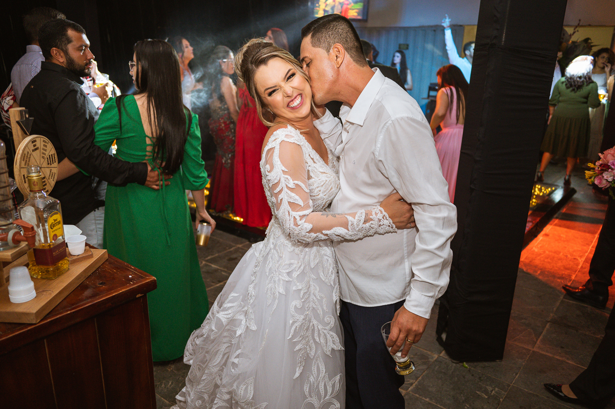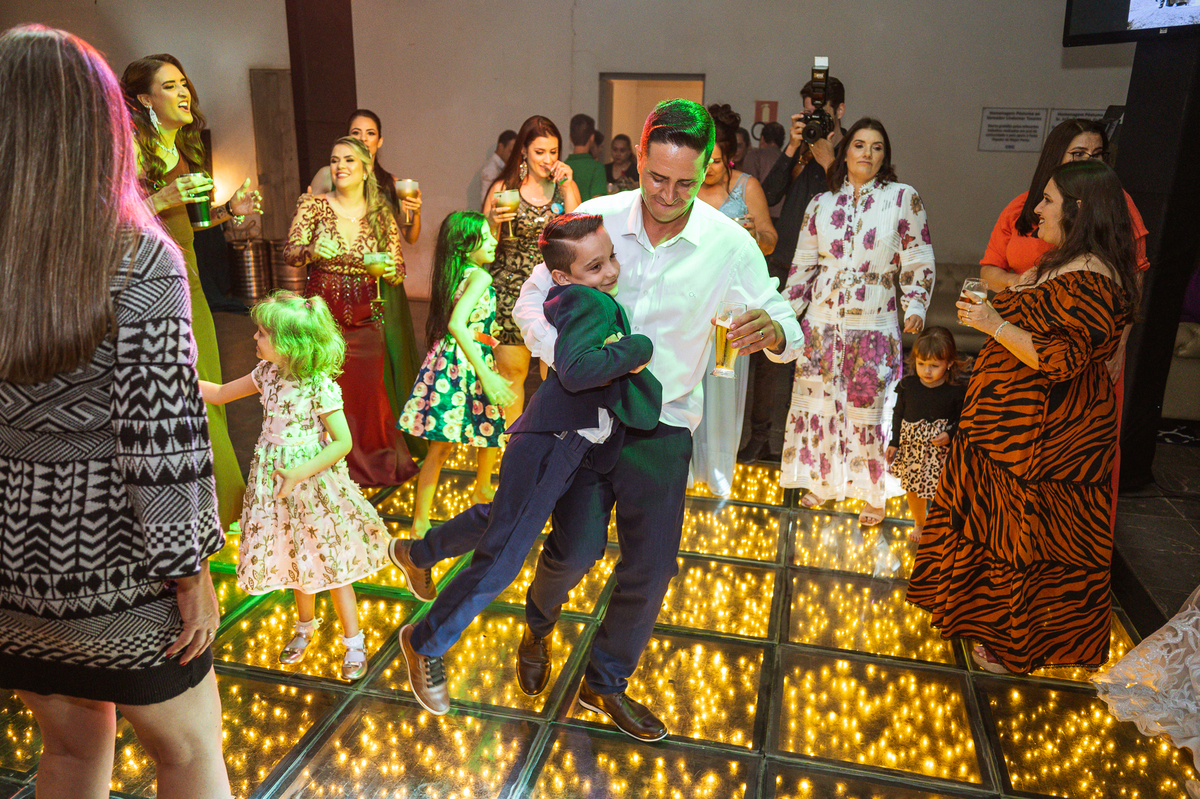 Os recém-casados foram recebidos na pista de dança com muita festa. Eles agradeceram seus familiares e convidados e não perderam tempo, iniciando sua primeira dança de casados. Começaram com uma valsa tradicional quando de repente iniciaram uma valsa maluca. Dançaram ao som do funk e ao final eles chamaram todos os padrinhos pra entrarem na dança. Foi incrível! A energia dos dois era contagiante e até mesmo o estouro do espumante foi diferenciado. Eles brindaram com seus padrinhos e curtiram muito a noite inteira. Dançaram, beberam, se deliciaram com o buffet e curtiram todos os drinks servidos pela equipe. Todos estavam completamente felizes e alegres com o casamento de Ed e Bruna.