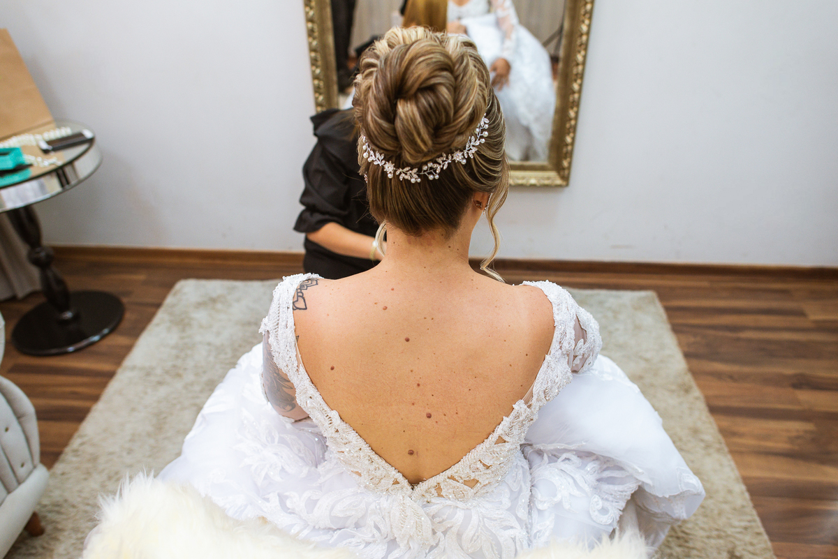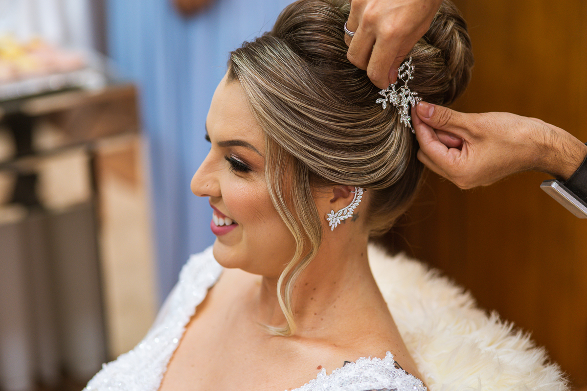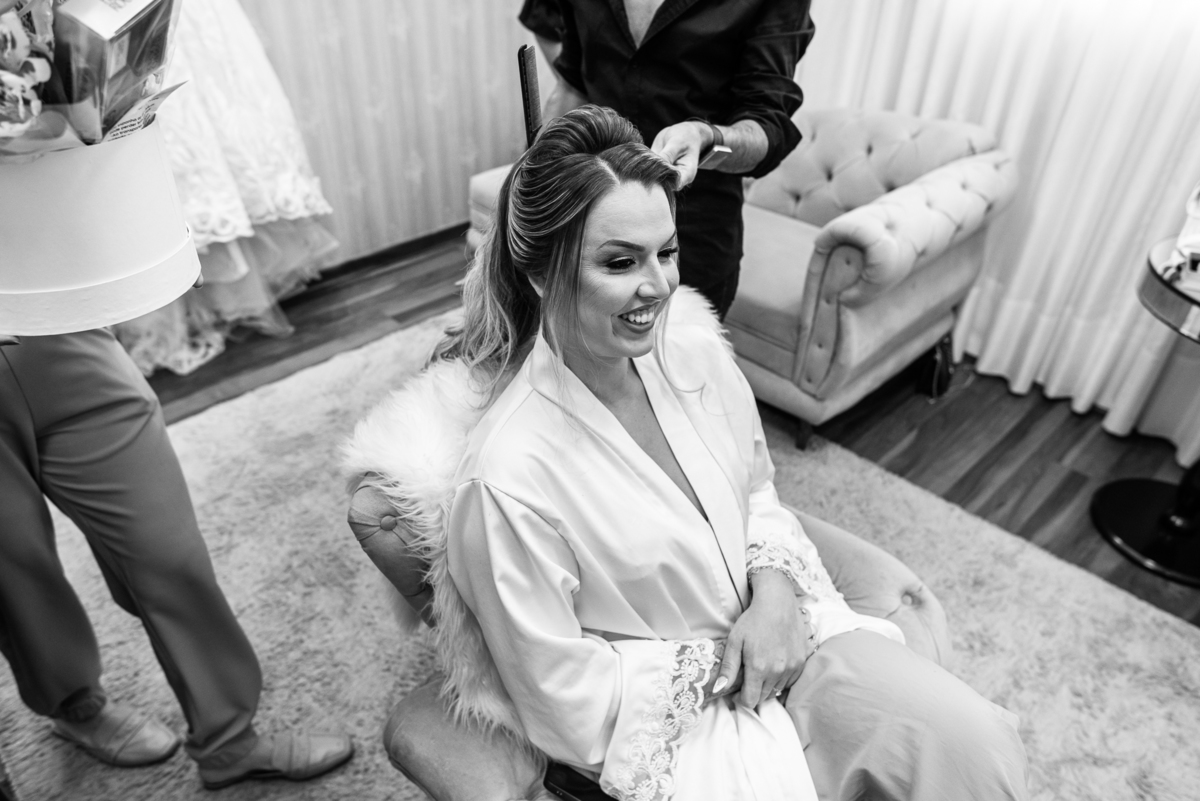 Bruna realizou sua produção aqui em Patos de Minas, no Espaço Lumani, acompanhada de algumas das madrinhas e de sua mãe. Chegamos no salão bem adiantados, visto que o evento aconteceria fora da cidade e o deslocamento era considerável. A noiva estava super tranquila, já quase pronta. Faltavam poucos retoques na make e o penteado estava sendo produzido pelo talentoso Marcos Alves. O vestido escolhido por ela vale destacar que foi um arraso. A equipe da Enlace Maison caprichou no vestido que combinou direitinho com toda a beleza forte da noiva. Enquanto o penteado era confeccionado, as madrinhas acompanhavam ansiosas pra verem ela prontinha. Sua mamãe também fez questão de acompanhar de perto tudinho.