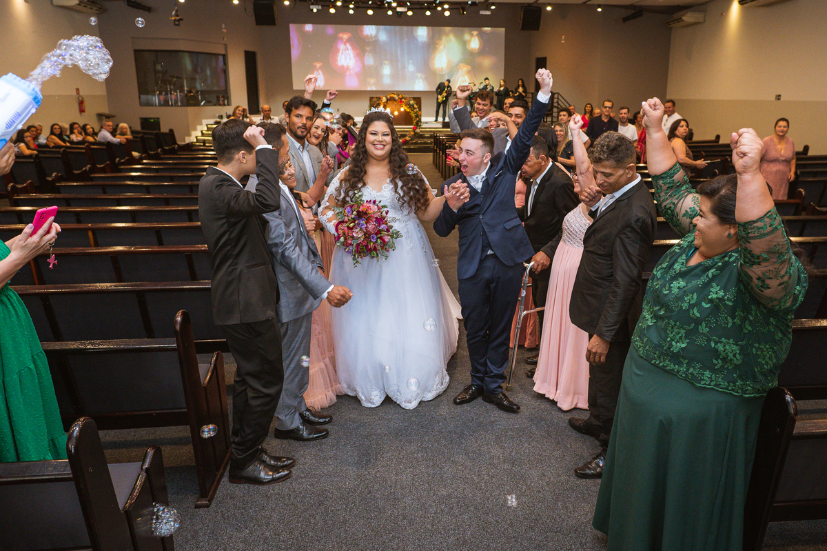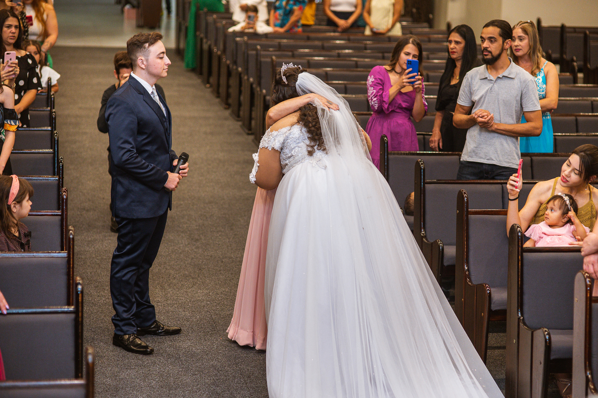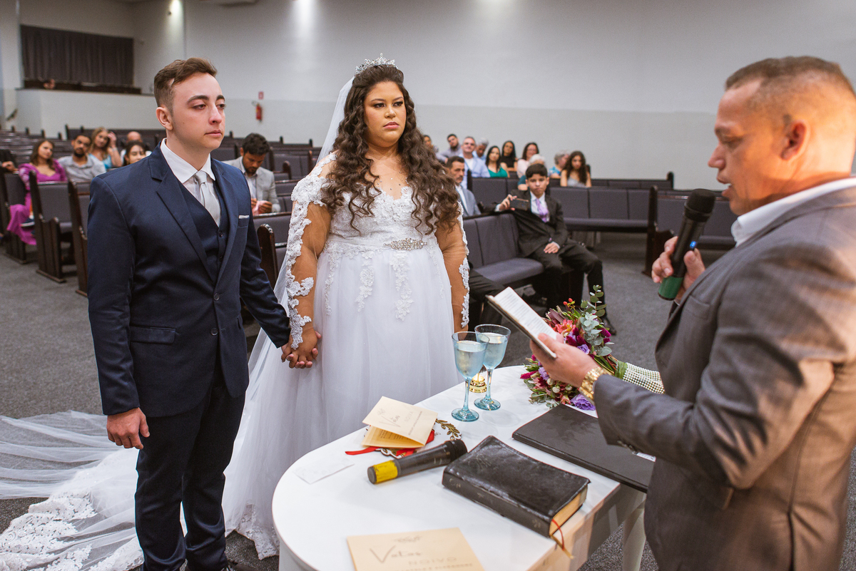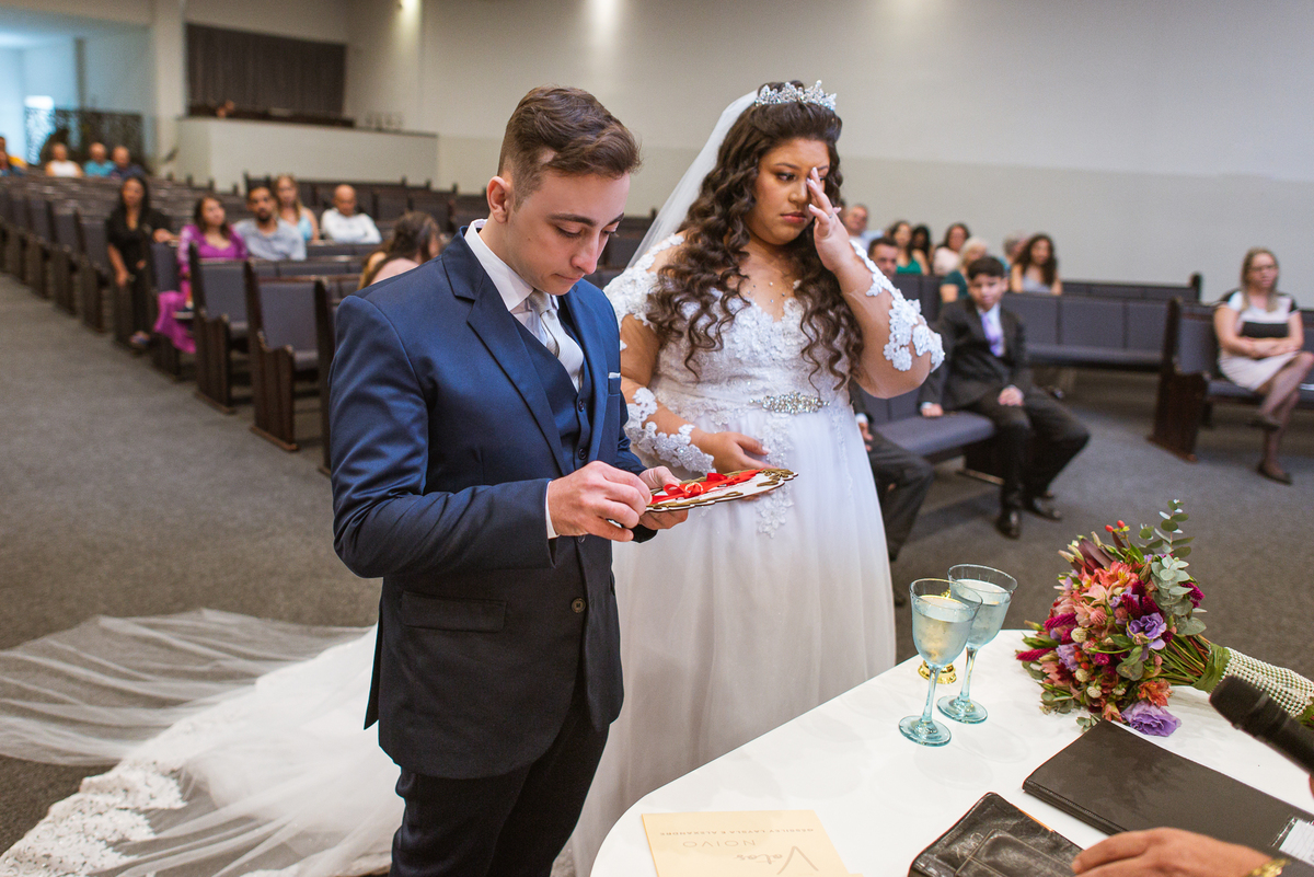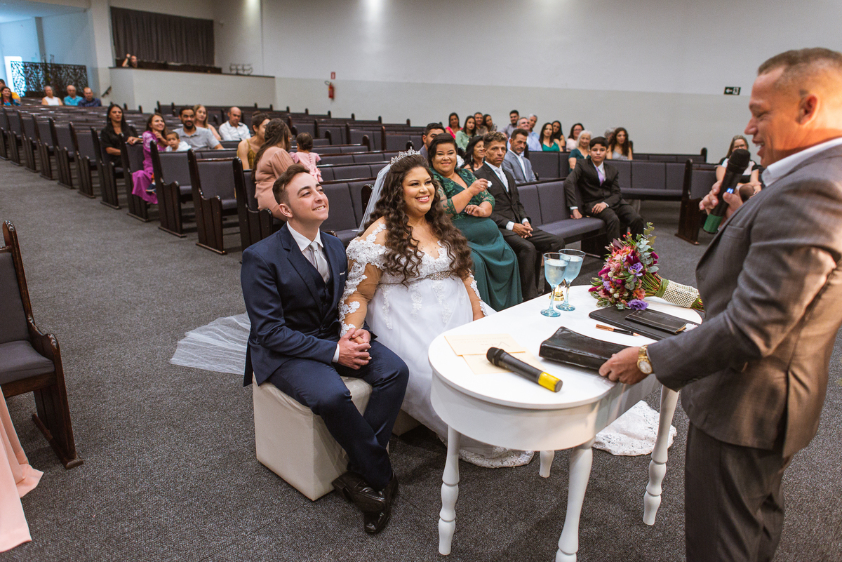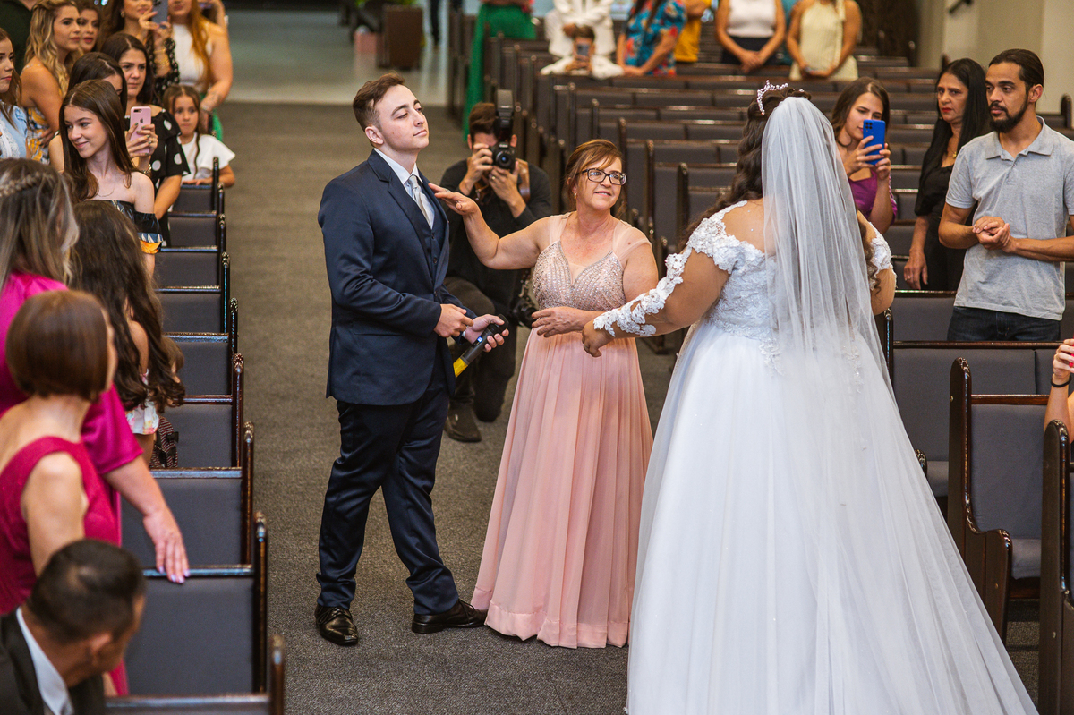 O Pastor os recebeu com muito carinho, ministrou uma palavra reconfortante e deixou os noivos bem à vontade. Abençoou as alianças e fez as perguntas tradicionais e as respostas nós já sabemos de cor. Eles trocaram as alianças e foram abençoados. Fizemos as nossas fotos com padrinhos e pais, logo após a bênção final. O cerimonial organizou a saída com os convidados no corredor aguardando a chegada dos noivos. Eles passaram e todos festejaram muito com eles. Assim que finalizamos a cerimônia, Alexandre havia me dito que gostaria muito de passar na casa de sua vovó, onde faria uma foto com ela e eles de noivos. Prontamente atendi seu pedido e fomos. Confesso que fui surpreendido com tamanha emoção desse momento. Eu não sabia que ela estava acamada, e que isso havia impossibilitado ela de comparecer. Mas Alexandre fez questão de passar lá, fazer o registro e conversar com ela, contando o quão felizes eles estavam com aquele momento.