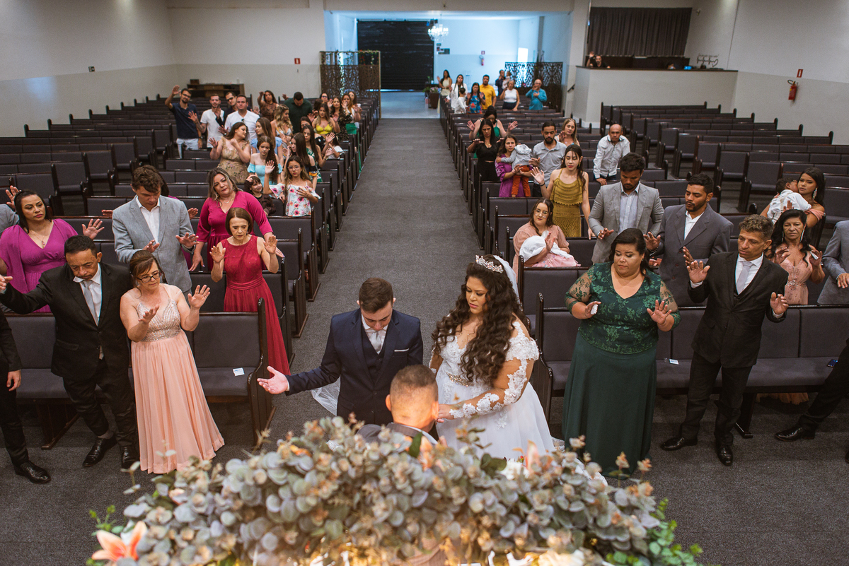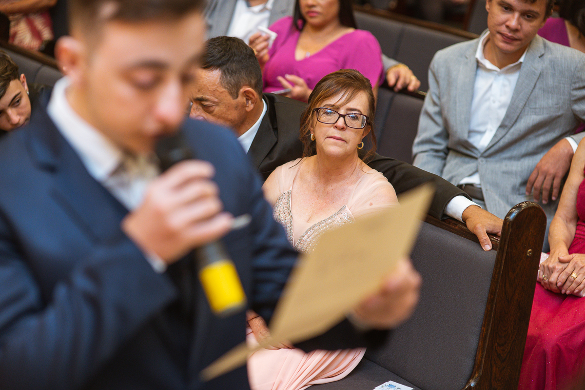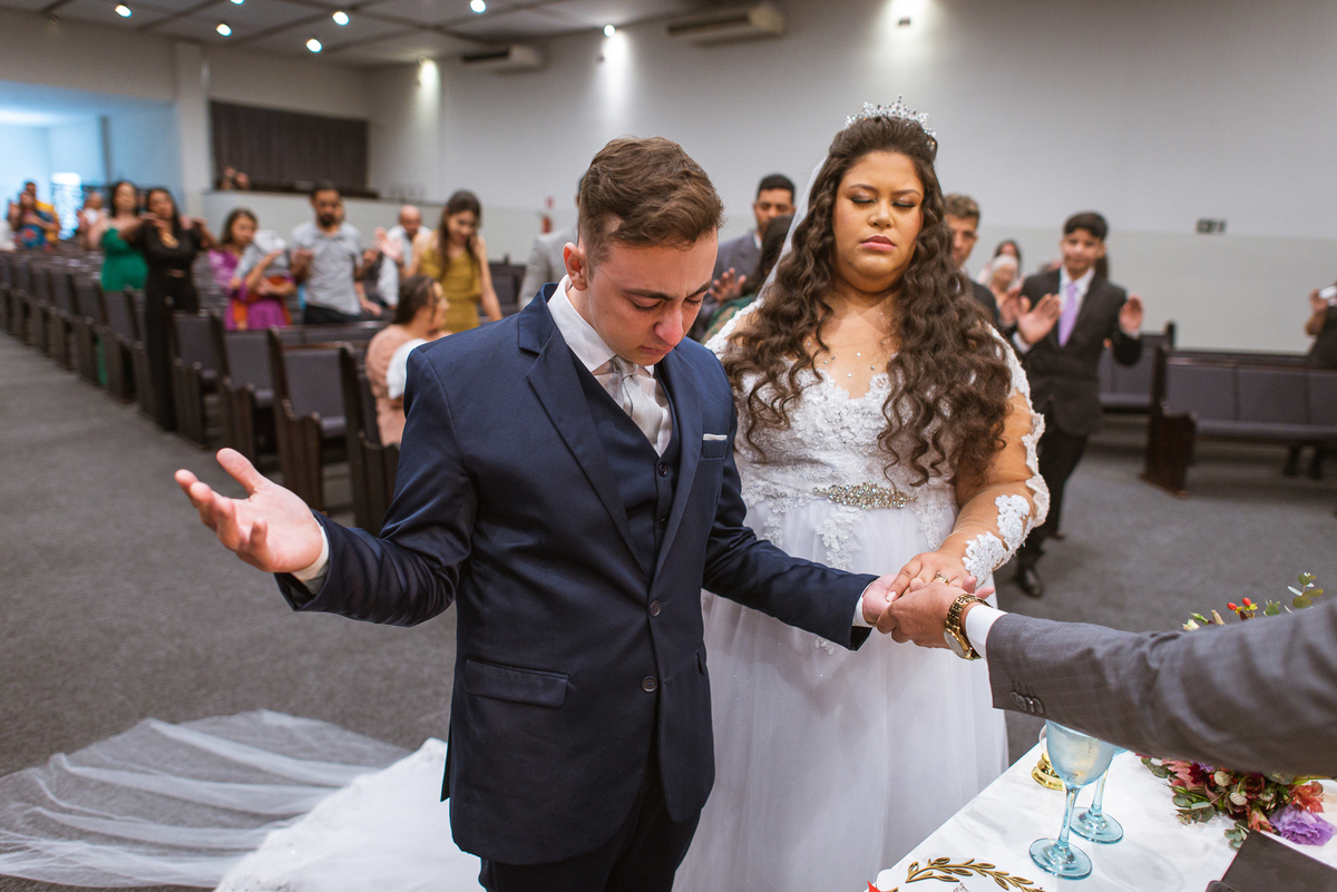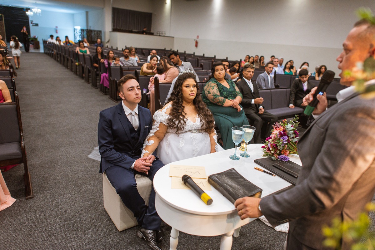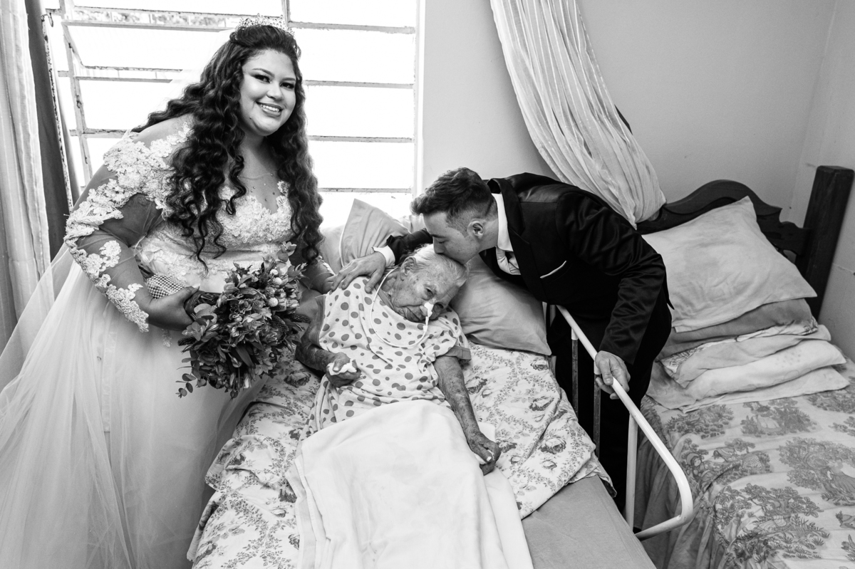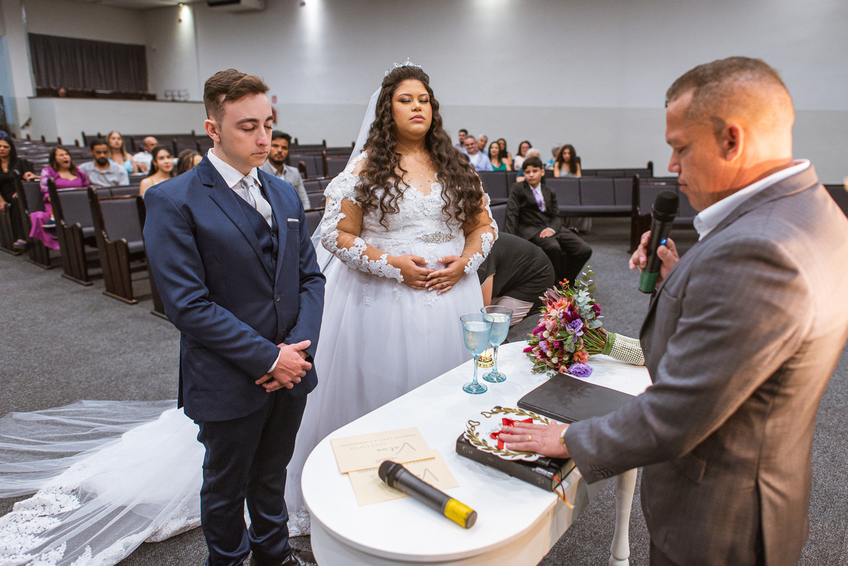O Pastor os recebeu com muito carinho, ministrou uma palavra reconfortante e deixou os noivos bem à vontade. Abençoou as alianças e fez as perguntas tradicionais e as respostas nós já sabemos de cor. Eles trocaram as alianças e foram abençoados. Fizemos as nossas fotos com padrinhos e pais, logo após a bênção final. O cerimonial organizou a saída com os convidados no corredor aguardando a chegada dos noivos. Eles passaram e todos festejaram muito com eles. Assim que finalizamos a cerimônia, Alexandre havia me dito que gostaria muito de passar na casa de sua vovó, onde faria uma foto com ela e eles de noivos. Prontamente atendi seu pedido e fomos. Confesso que fui surpreendido com tamanha emoção desse momento. Eu não sabia que ela estava acamada, e que isso havia impossibilitado ela de comparecer. Mas Alexandre fez questão de passar lá, fazer o registro e conversar com ela, contando o quão felizes eles estavam com aquele momento.