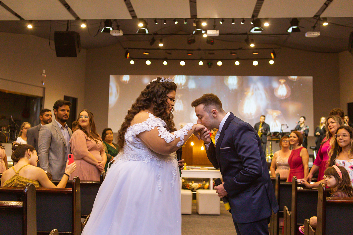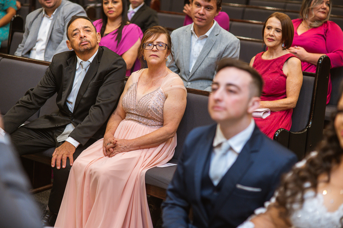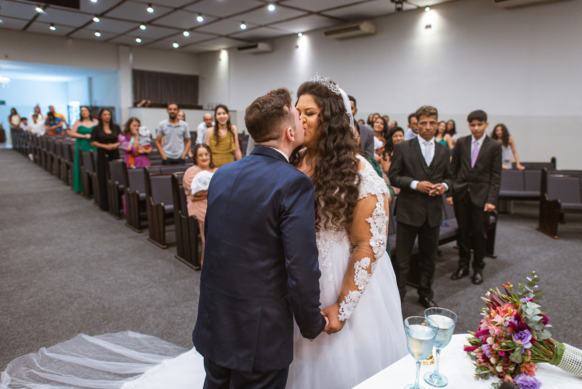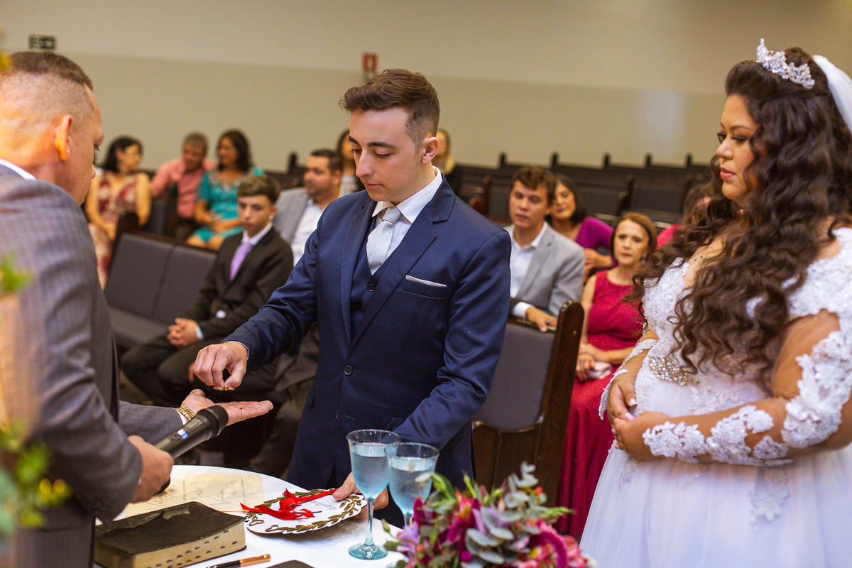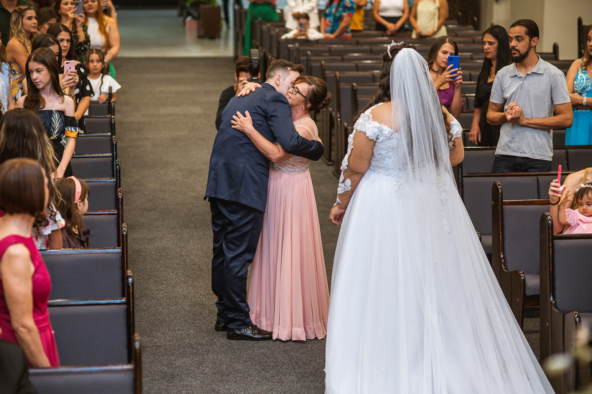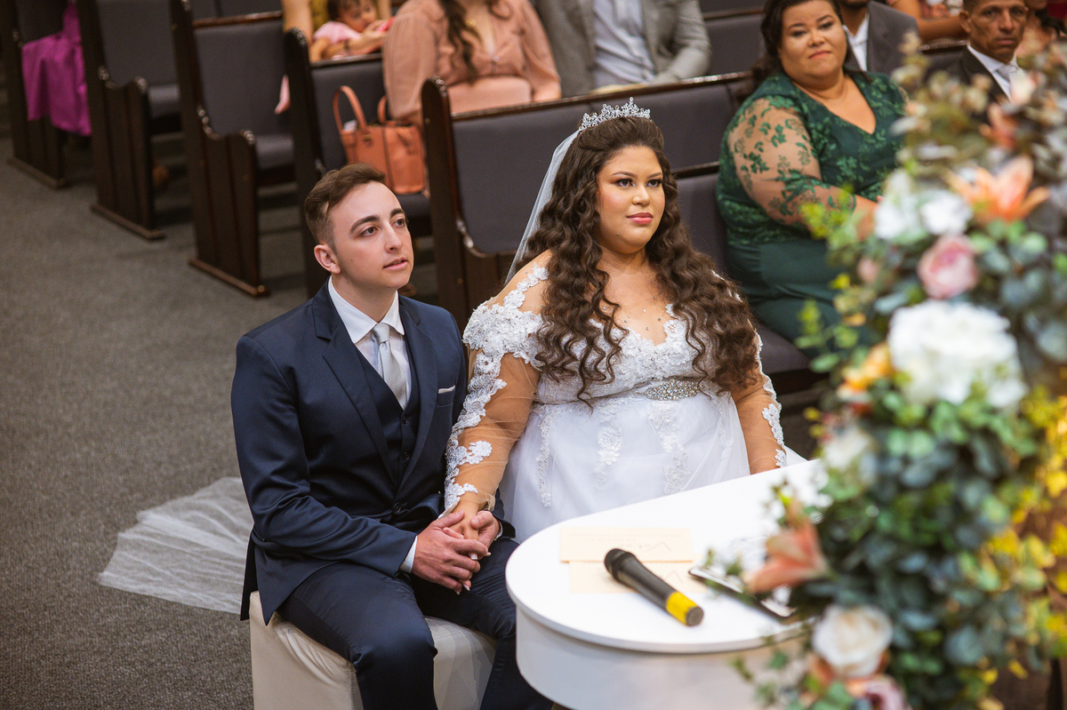 O Pastor os recebeu com muito carinho, ministrou uma palavra reconfortante e deixou os noivos bem à vontade. Abençoou as alianças e fez as perguntas tradicionais e as respostas nós já sabemos de cor. Eles trocaram as alianças e foram abençoados. Fizemos as nossas fotos com padrinhos e pais, logo após a bênção final. O cerimonial organizou a saída com os convidados no corredor aguardando a chegada dos noivos. Eles passaram e todos festejaram muito com eles. Assim que finalizamos a cerimônia, Alexandre havia me dito que gostaria muito de passar na casa de sua vovó, onde faria uma foto com ela e eles de noivos. Prontamente atendi seu pedido e fomos. Confesso que fui surpreendido com tamanha emoção desse momento. Eu não sabia que ela estava acamada, e que isso havia impossibilitado ela de comparecer. Mas Alexandre fez questão de passar lá, fazer o registro e conversar com ela, contando o quão felizes eles estavam com aquele momento.