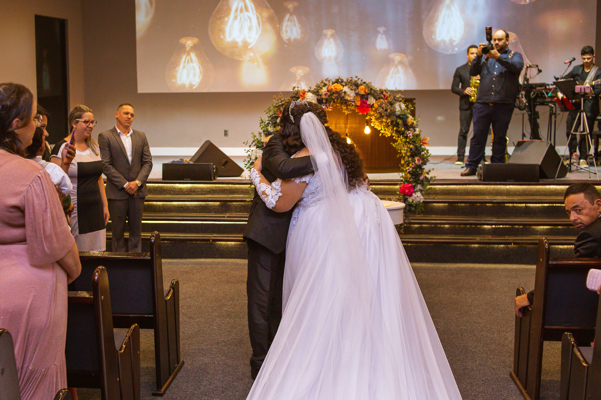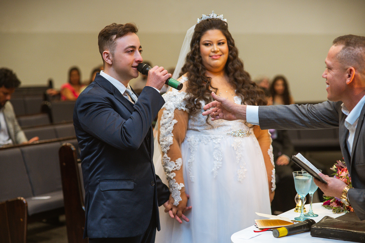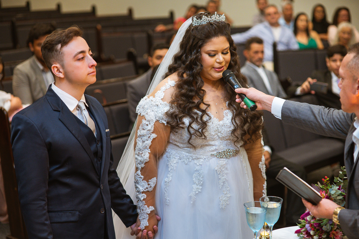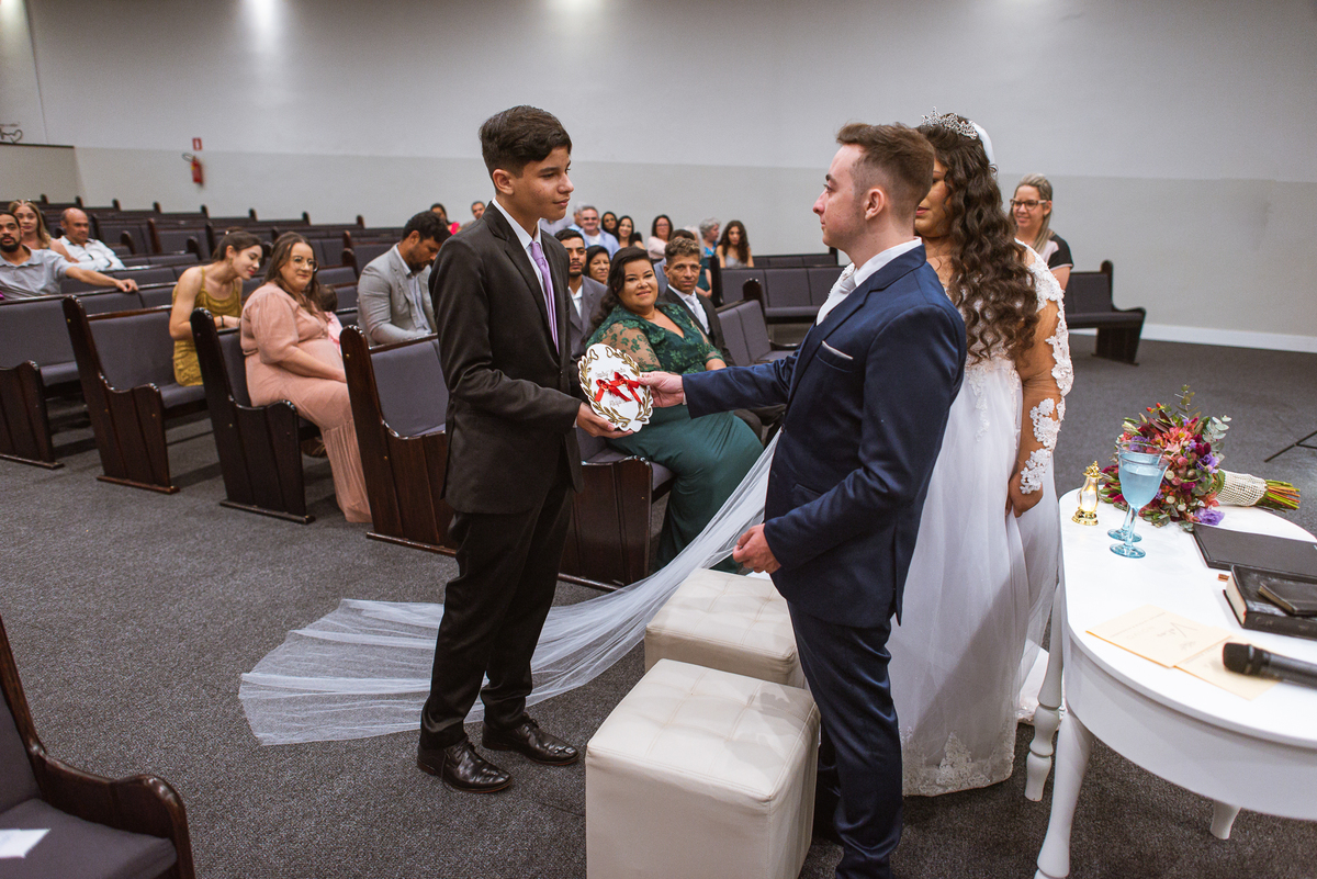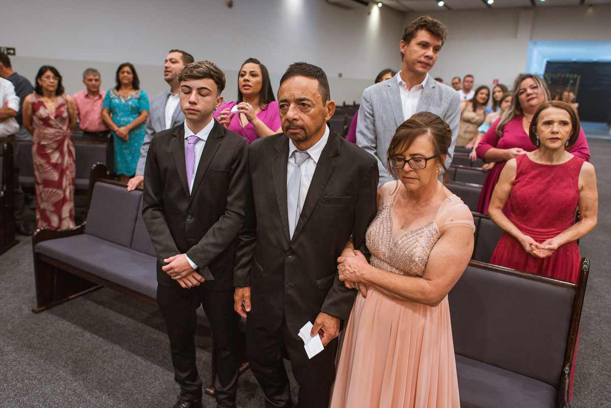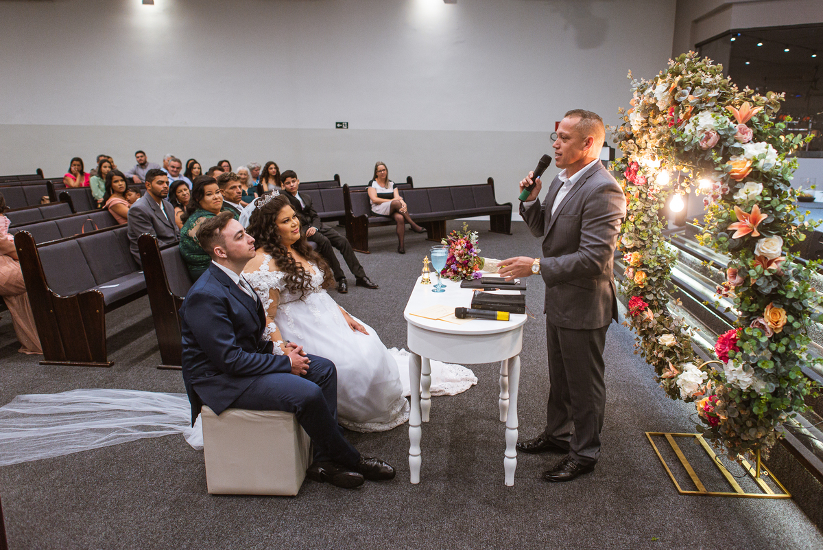 O Pastor os recebeu com muito carinho, ministrou uma palavra reconfortante e deixou os noivos bem à vontade. Abençoou as alianças e fez as perguntas tradicionais e as respostas nós já sabemos de cor. Eles trocaram as alianças e foram abençoados. Fizemos as nossas fotos com padrinhos e pais, logo após a bênção final. O cerimonial organizou a saída com os convidados no corredor aguardando a chegada dos noivos. Eles passaram e todos festejaram muito com eles. Assim que finalizamos a cerimônia, Alexandre havia me dito que gostaria muito de passar na casa de sua vovó, onde faria uma foto com ela e eles de noivos. Prontamente atendi seu pedido e fomos. Confesso que fui surpreendido com tamanha emoção desse momento. Eu não sabia que ela estava acamada, e que isso havia impossibilitado ela de comparecer. Mas Alexandre fez questão de passar lá, fazer o registro e conversar com ela, contando o quão felizes eles estavam com aquele momento.