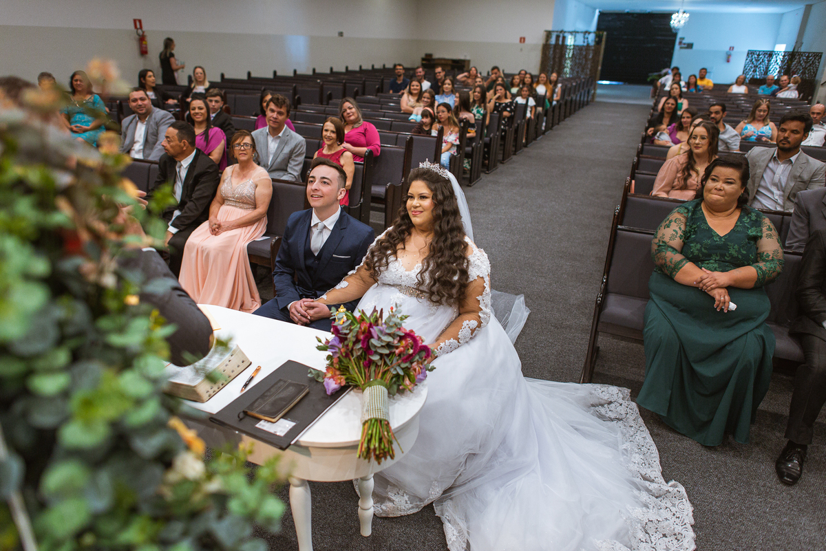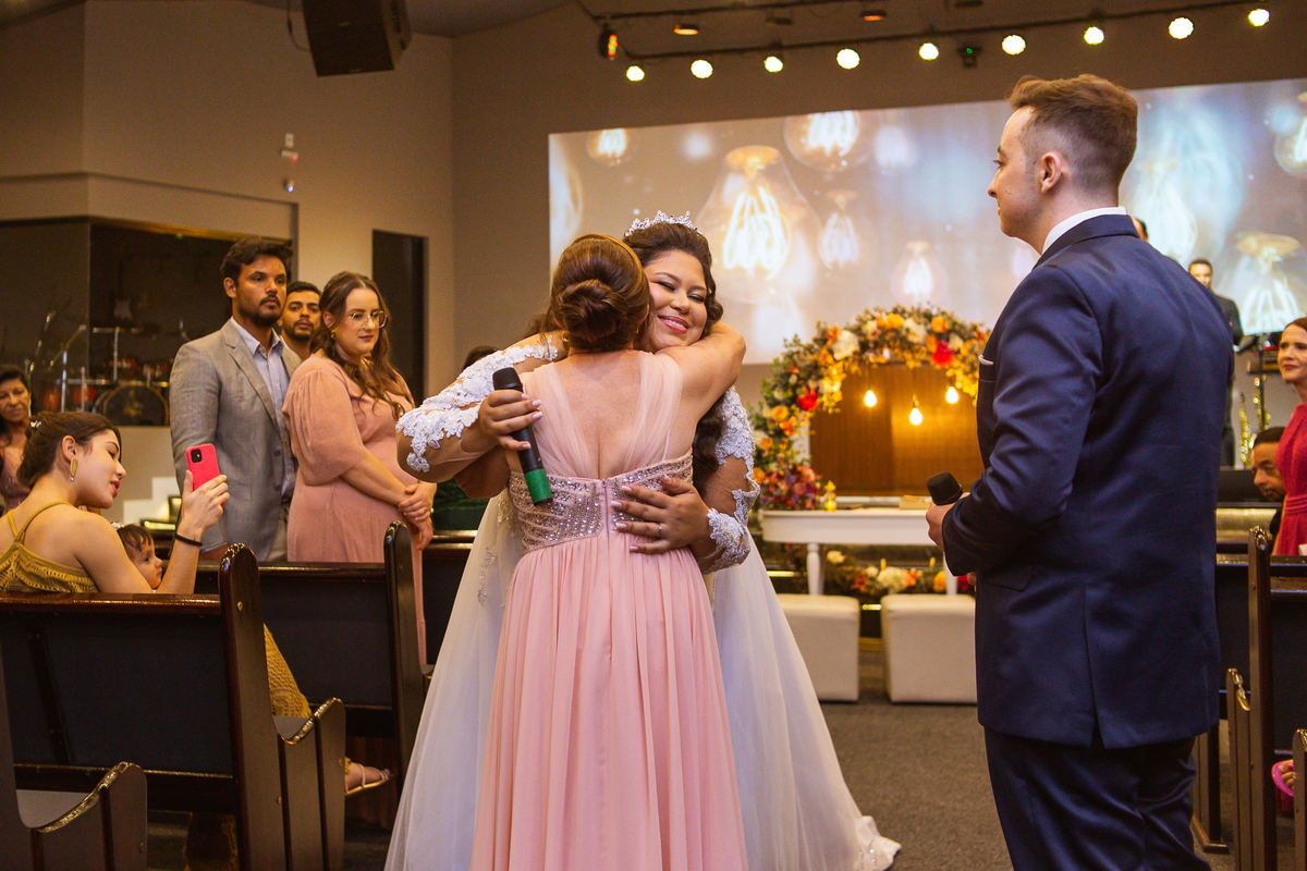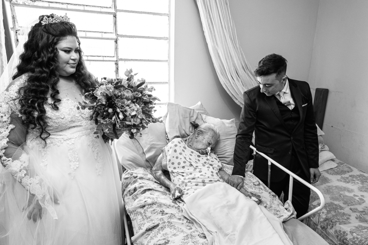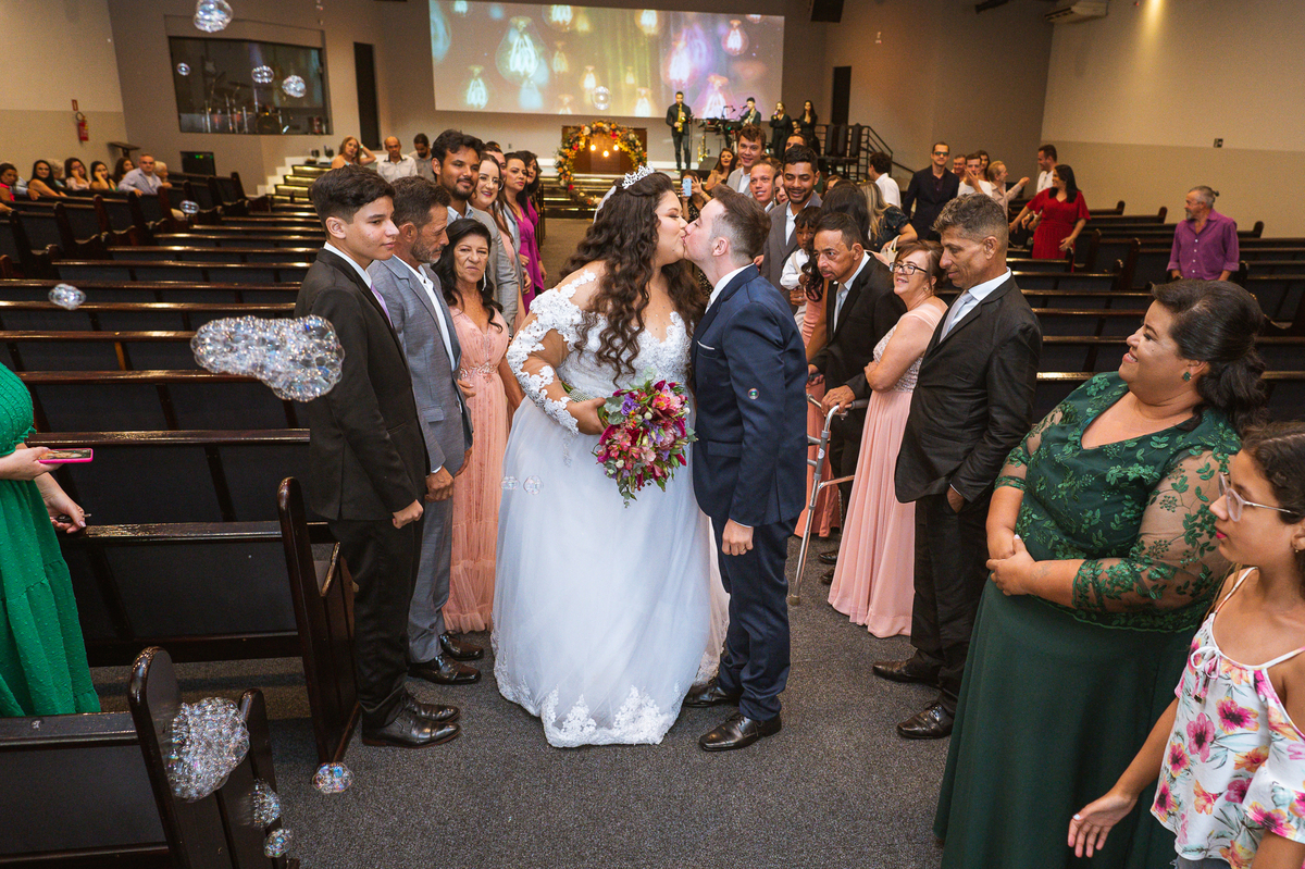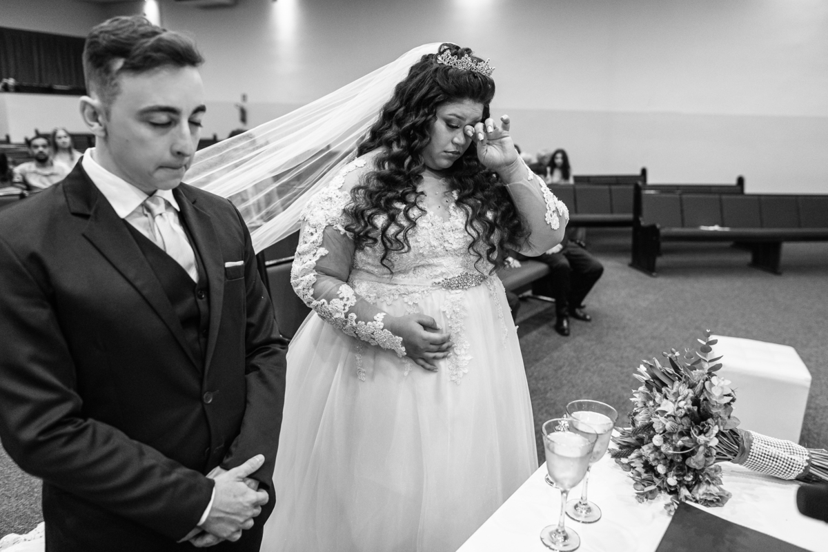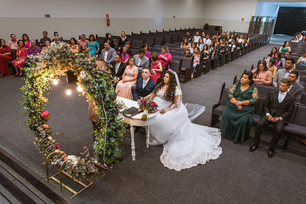O Pastor os recebeu com muito carinho, ministrou uma palavra reconfortante e deixou os noivos bem à vontade. Abençoou as alianças e fez as perguntas tradicionais e as respostas nós já sabemos de cor. Eles trocaram as alianças e foram abençoados. Fizemos as nossas fotos com padrinhos e pais, logo após a bênção final. O cerimonial organizou a saída com os convidados no corredor aguardando a chegada dos noivos. Eles passaram e todos festejaram muito com eles. Assim que finalizamos a cerimônia, Alexandre havia me dito que gostaria muito de passar na casa de sua vovó, onde faria uma foto com ela e eles de noivos. Prontamente atendi seu pedido e fomos. Confesso que fui surpreendido com tamanha emoção desse momento. Eu não sabia que ela estava acamada, e que isso havia impossibilitado ela de comparecer. Mas Alexandre fez questão de passar lá, fazer o registro e conversar com ela, contando o quão felizes eles estavam com aquele momento.
