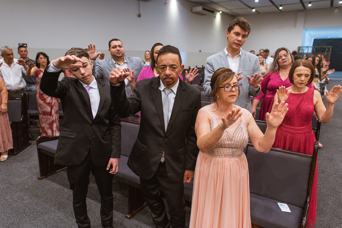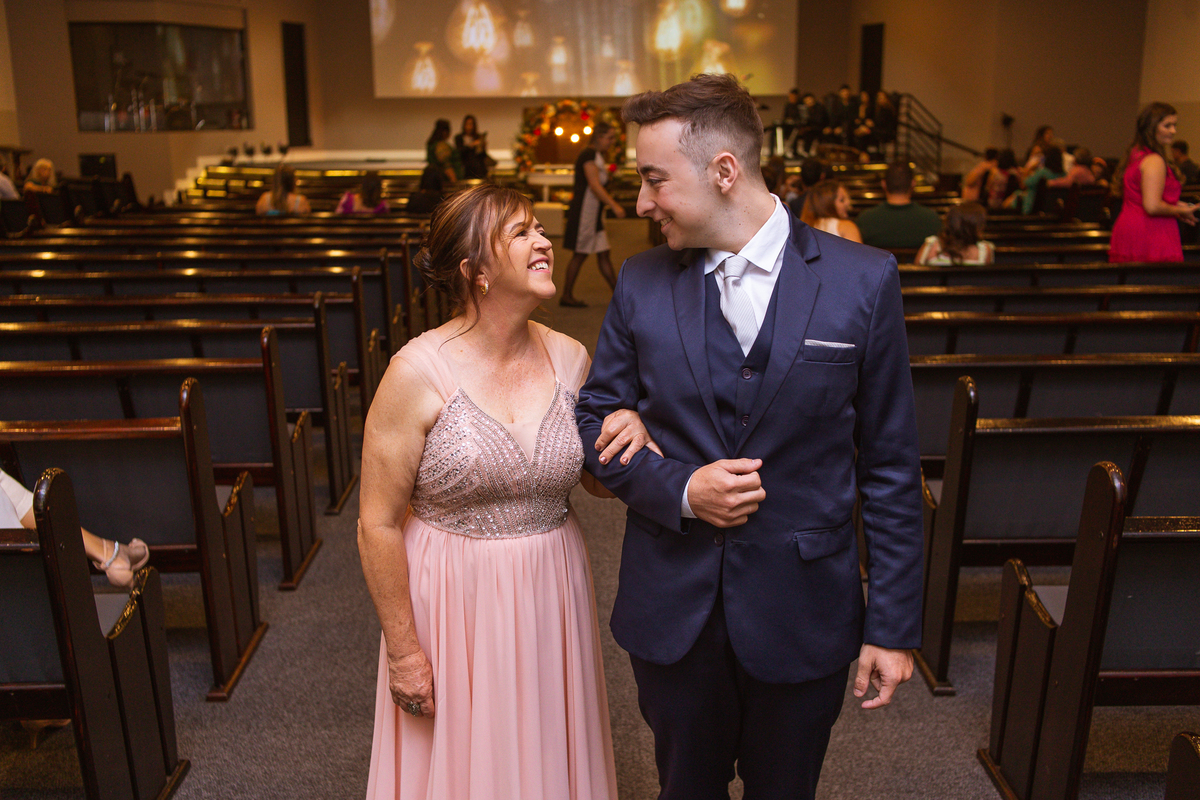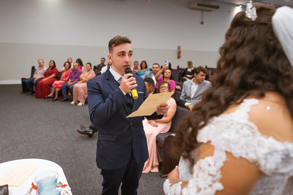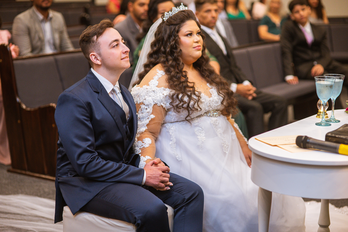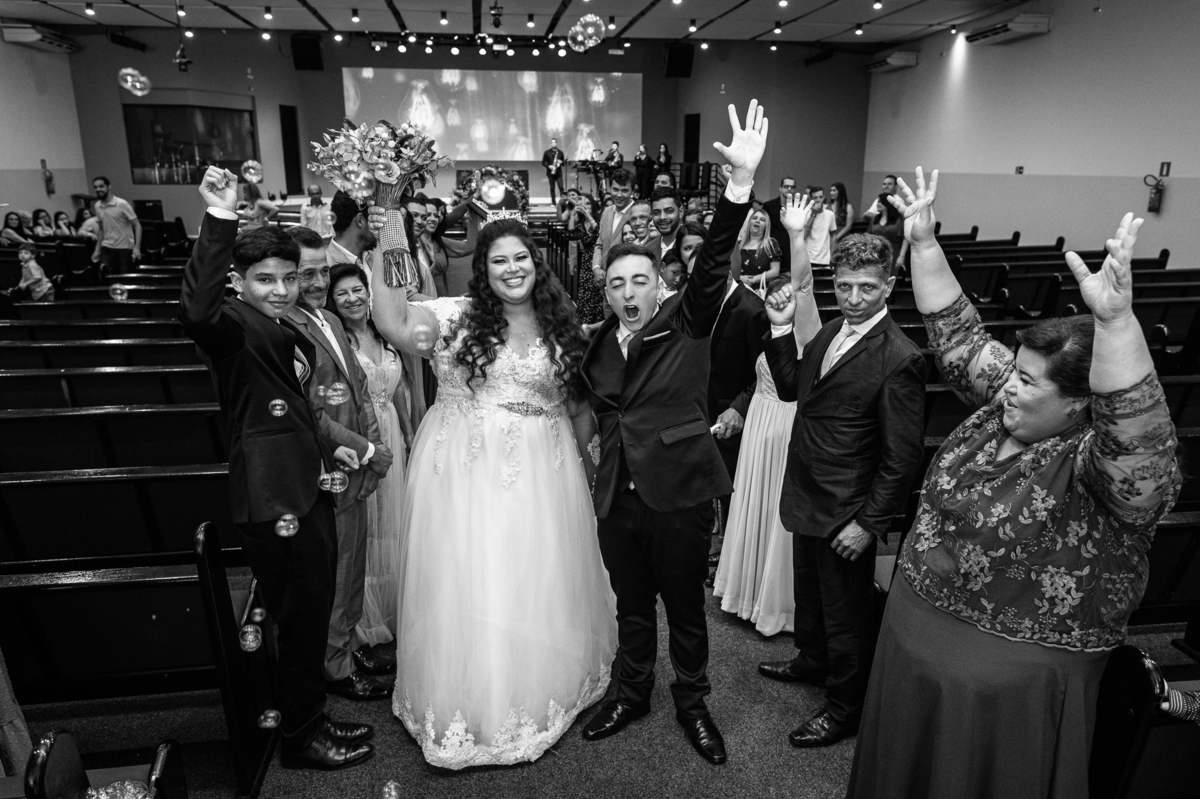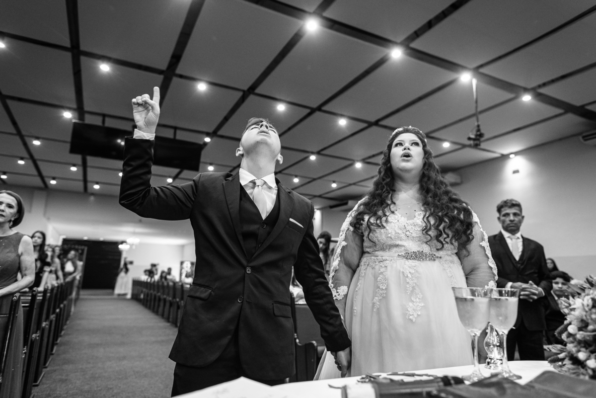 O Pastor os recebeu com muito carinho, ministrou uma palavra reconfortante e deixou os noivos bem à vontade. Abençoou as alianças e fez as perguntas tradicionais e as respostas nós já sabemos de cor. Eles trocaram as alianças e foram abençoados. Fizemos as nossas fotos com padrinhos e pais, logo após a bênção final. O cerimonial organizou a saída com os convidados no corredor aguardando a chegada dos noivos. Eles passaram e todos festejaram muito com eles. Assim que finalizamos a cerimônia, Alexandre havia me dito que gostaria muito de passar na casa de sua vovó, onde faria uma foto com ela e eles de noivos. Prontamente atendi seu pedido e fomos. Confesso que fui surpreendido com tamanha emoção desse momento. Eu não sabia que ela estava acamada, e que isso havia impossibilitado ela de comparecer. Mas Alexandre fez questão de passar lá, fazer o registro e conversar com ela, contando o quão felizes eles estavam com aquele momento.