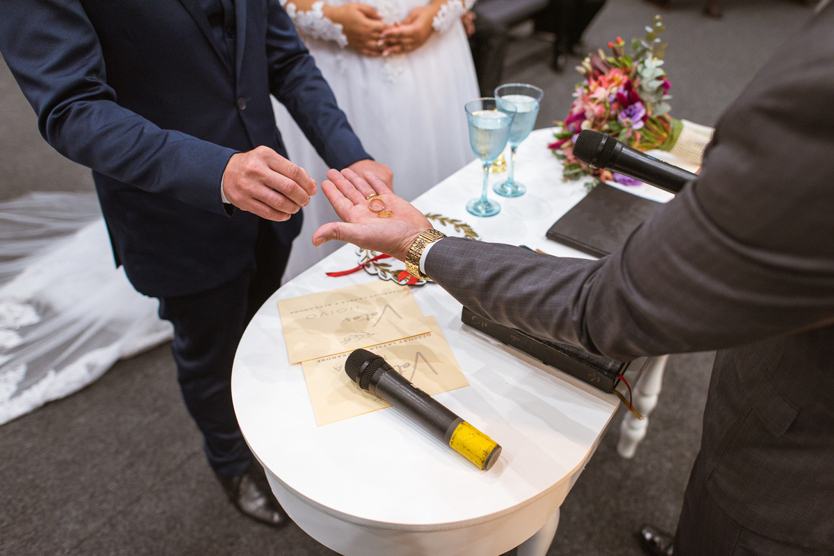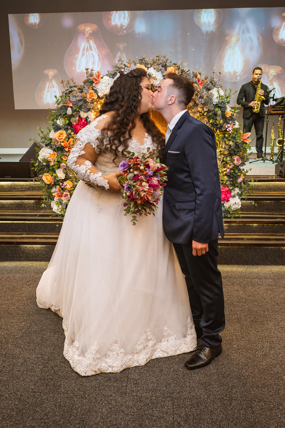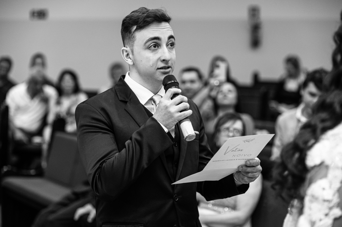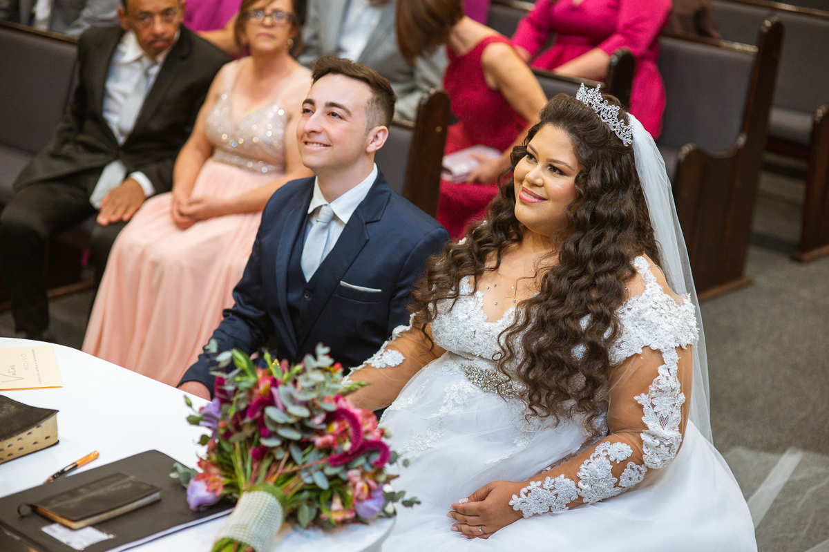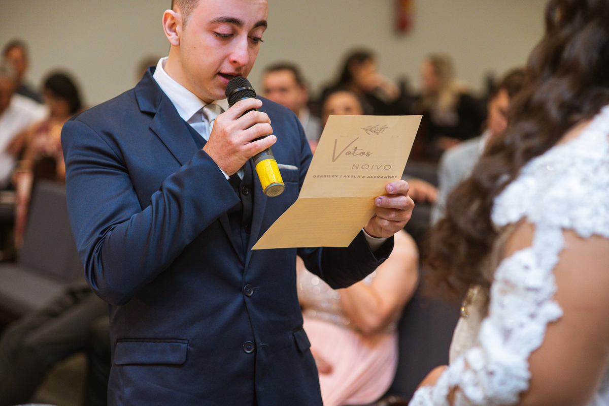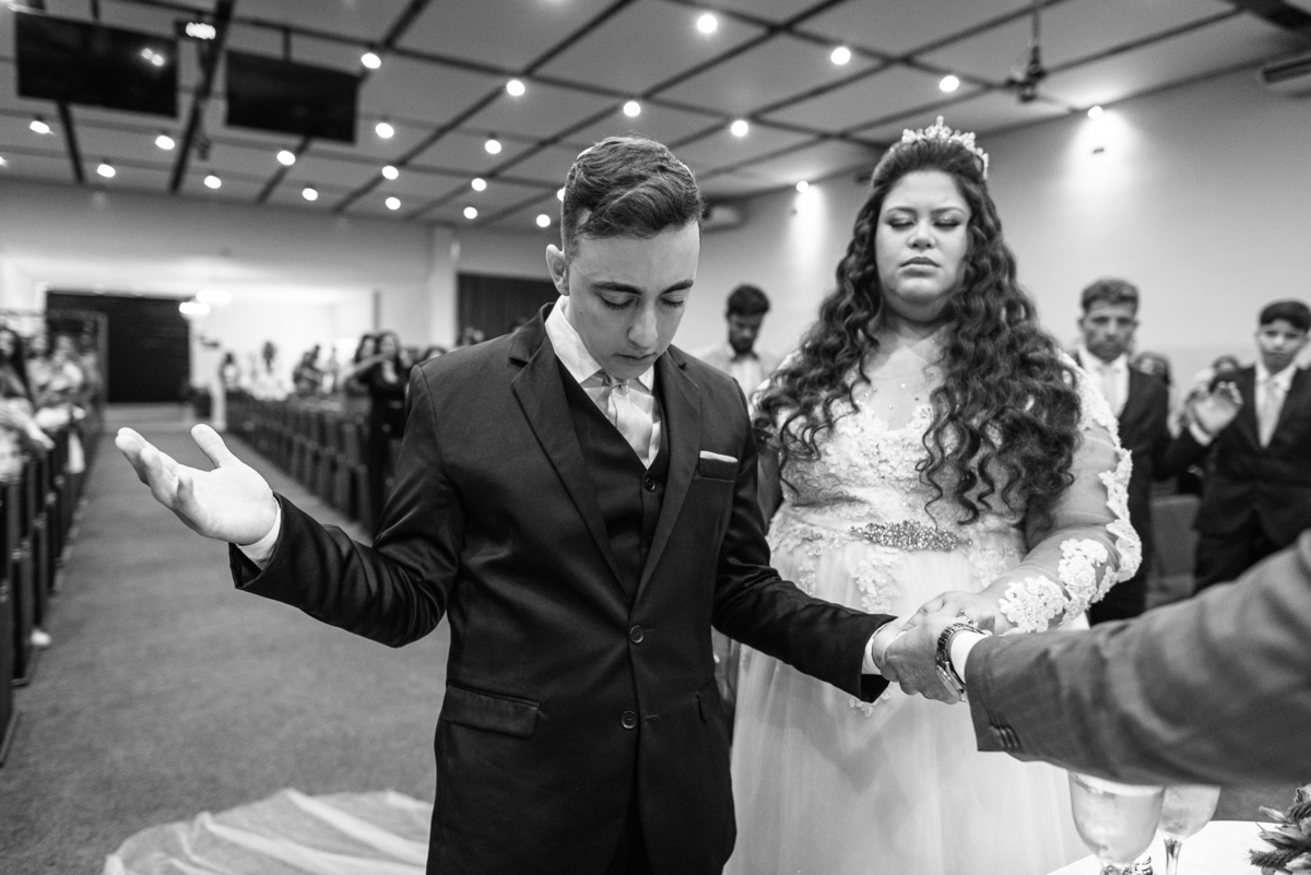 O Pastor os recebeu com muito carinho, ministrou uma palavra reconfortante e deixou os noivos bem à vontade. Abençoou as alianças e fez as perguntas tradicionais e as respostas nós já sabemos de cor. Eles trocaram as alianças e foram abençoados. Fizemos as nossas fotos com padrinhos e pais, logo após a bênção final. O cerimonial organizou a saída com os convidados no corredor aguardando a chegada dos noivos. Eles passaram e todos festejaram muito com eles. Assim que finalizamos a cerimônia, Alexandre havia me dito que gostaria muito de passar na casa de sua vovó, onde faria uma foto com ela e eles de noivos. Prontamente atendi seu pedido e fomos. Confesso que fui surpreendido com tamanha emoção desse momento. Eu não sabia que ela estava acamada, e que isso havia impossibilitado ela de comparecer. Mas Alexandre fez questão de passar lá, fazer o registro e conversar com ela, contando o quão felizes eles estavam com aquele momento.